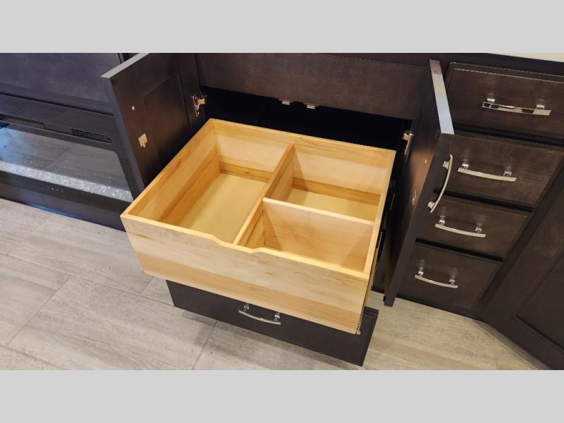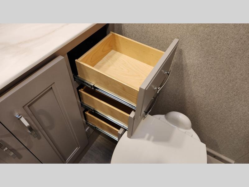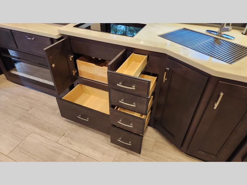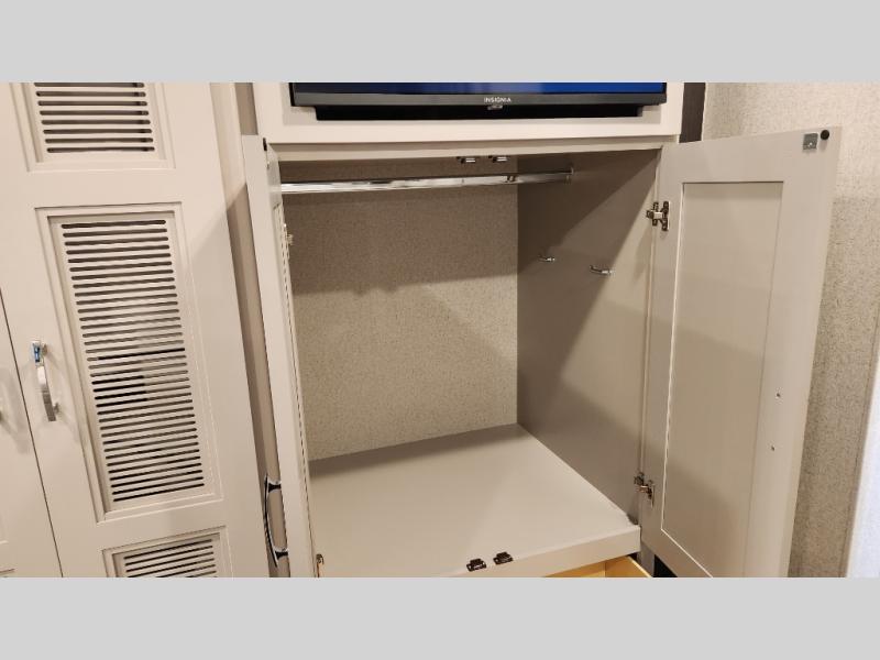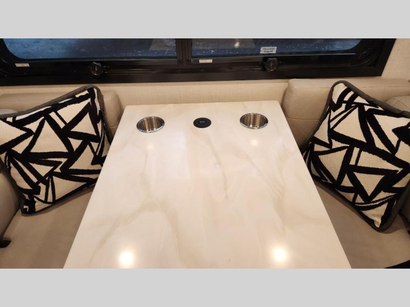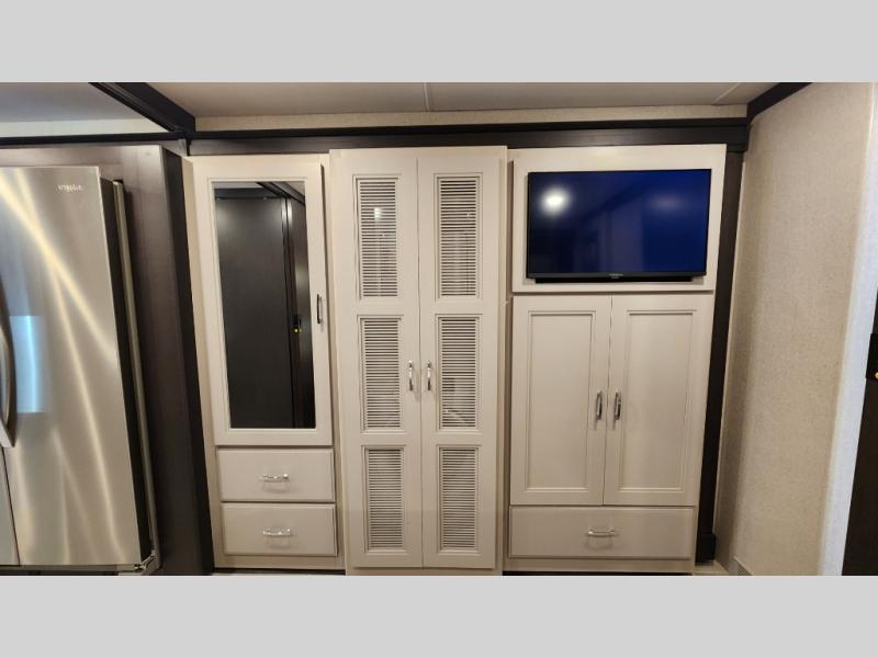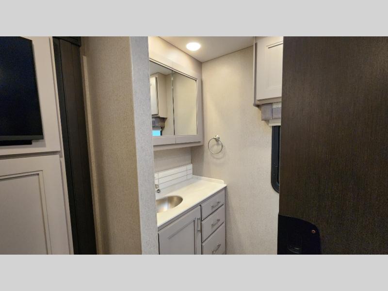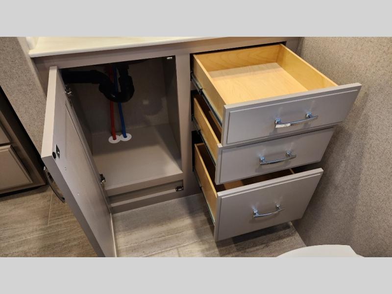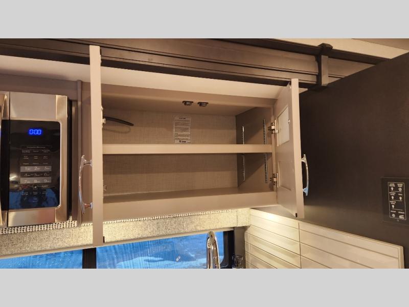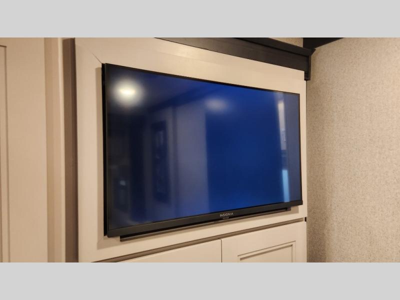 It's a clean decision to take this motorhome on your next trip with the bath and a half! The master suite offers at home comforts with a Tilt-A-View inclining king bed slide, a chest of drawers, a closet, and a 32" TV to watch movies in bed. The guests can sleep on the 52" x 80" bunk over cab and even convert the 72" Dream Dinette. Everyone can freshen up each morning in the full bathroom with the 30" x 36" shower which has a skylight above, an Oxygenics shower head, and a fiberglass shower with a glass door. Prepare your best home cooked meals with the two burner high output gas range top with single induction cooktop and easily take a bathroom break with the half bathroom nearby. The theater seating has the perfect view of the fireplace with a TV above it.