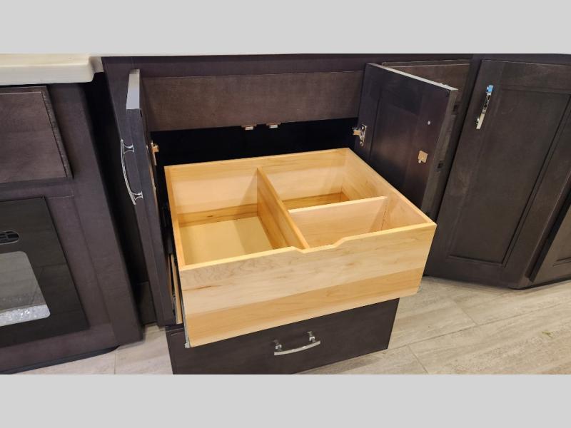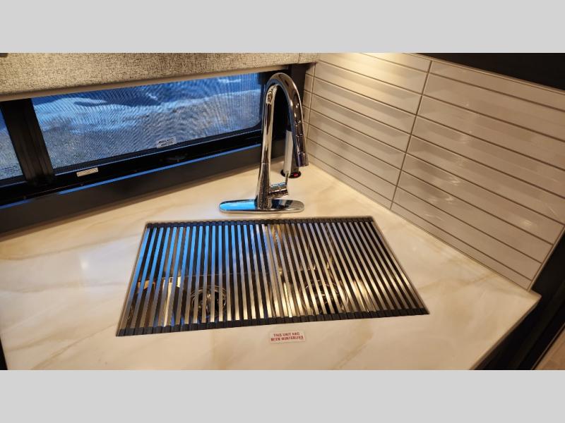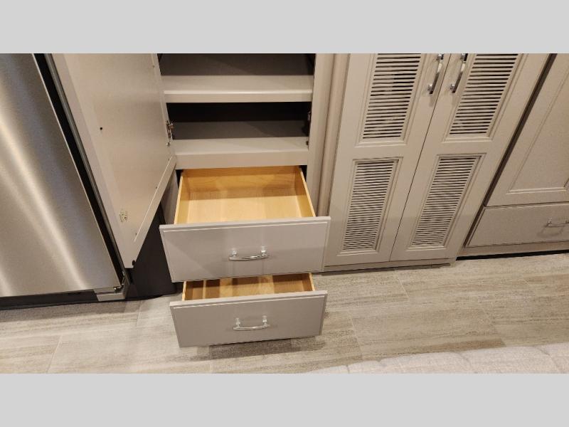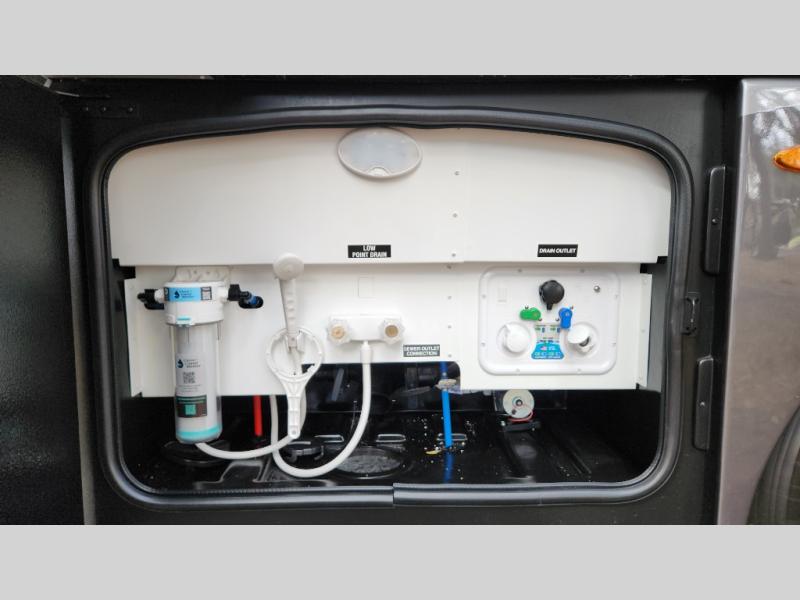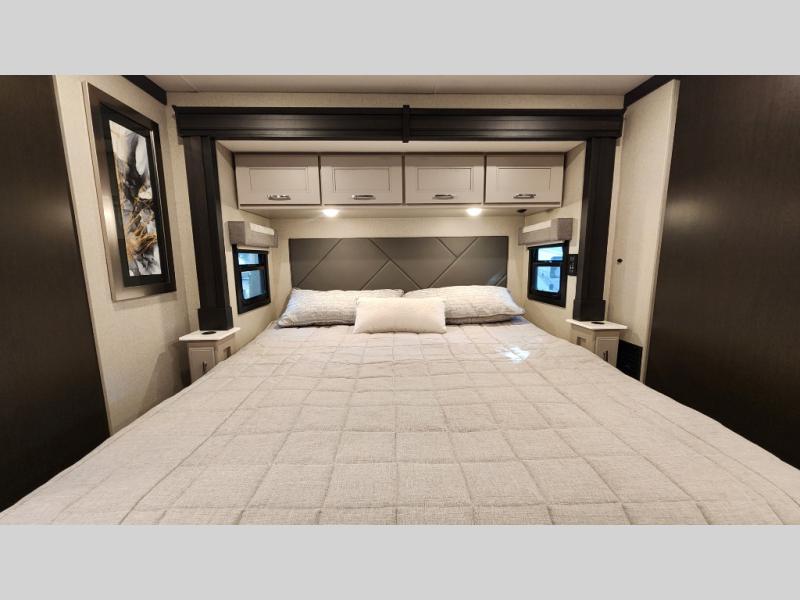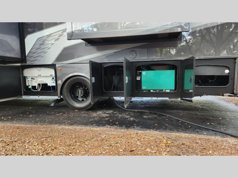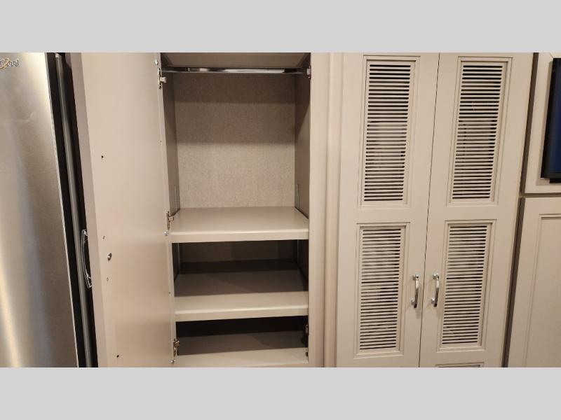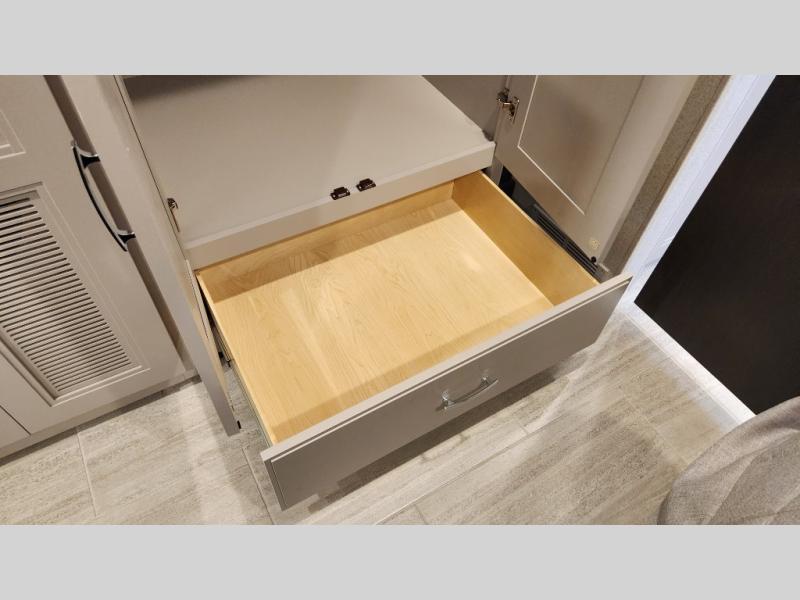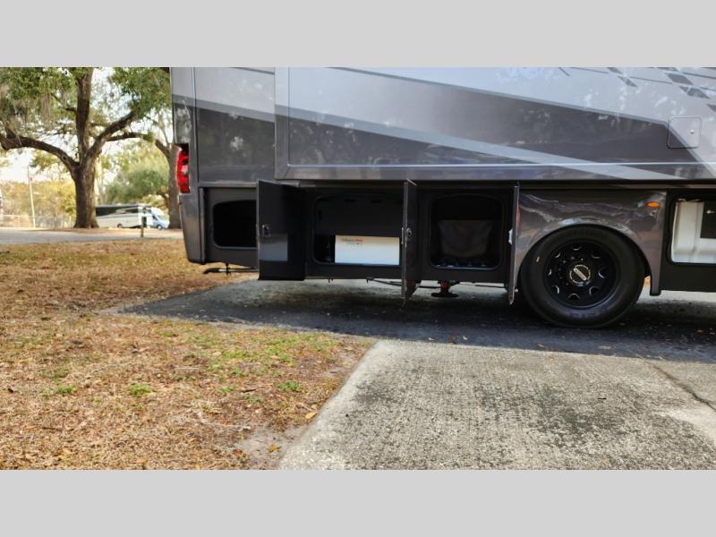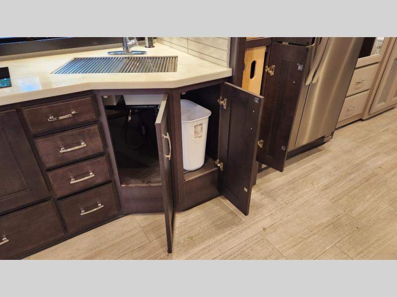 It's a clean decision to take this motorhome on your next trip with the bath and a half! The master suite offers at home comforts with a Tilt-A-View inclining king bed slide, a chest of drawers, a closet, and a 32" TV to watch movies in bed. The guests can sleep on the 52" x 80" bunk over cab and even convert the 72" Dream Dinette. Everyone can freshen up each morning in the full bathroom with the 30" x 36" shower which has a skylight above, an Oxygenics shower head, and a fiberglass shower with a glass door. Prepare your best home cooked meals with the two burner high output gas range top with single induction cooktop and easily take a bathroom break with the half bathroom nearby. The theater seating has the perfect view of the fireplace with a TV above it.