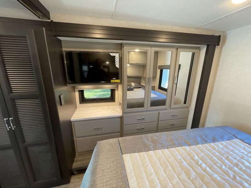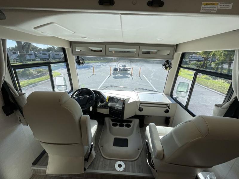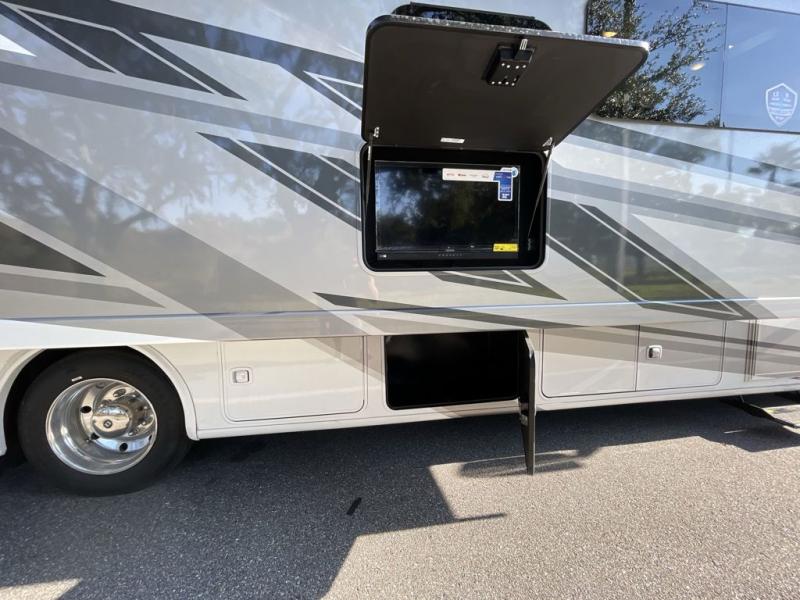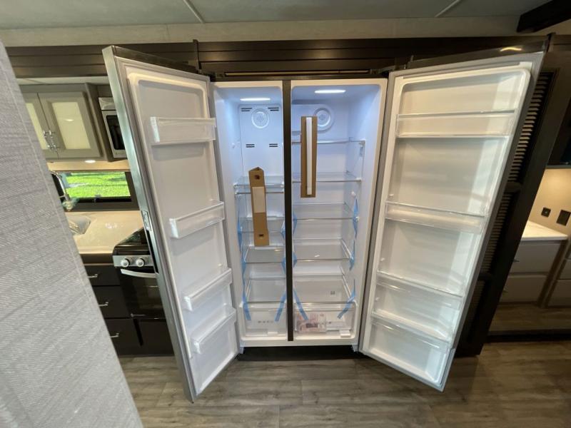 This spacious Class A motorhome has room to sleep eight! Enjoy the privacy of the rear bedroom which has a king bed, spacious closet and a 32" LED Smart TV. Extra guests can utilize the Dream Dinette, the sofa bed, or the drop-down overhead bunk which has a Cotton Cloud mattress for comfort. As if that's not enough, there's a pair of leatherette theater seats with footrests so you can kick back and watch either of the two living room TVs. You'll also find another TV outside. A full bath with 30" x 36" shower is conveniently located in the center so everyone has access, and the glass shower door and skylight make it feel roomy. The kitchen features a three-burner gas cooktop and oven, residential refrigerator, and stainless steel convection microwave.
