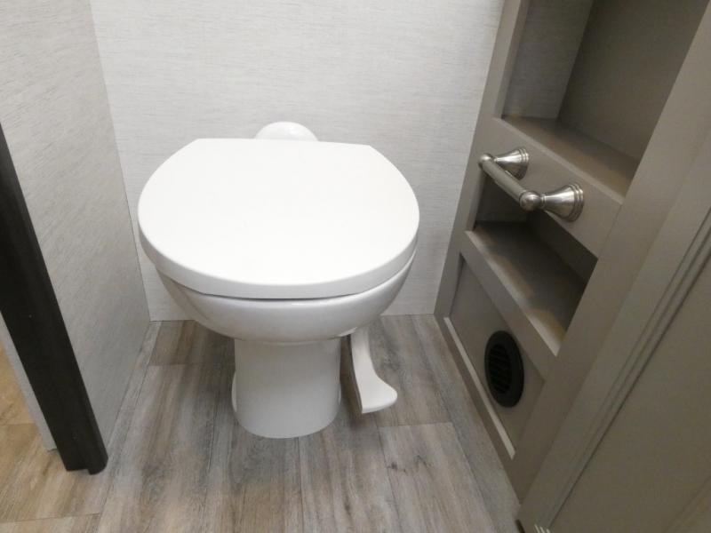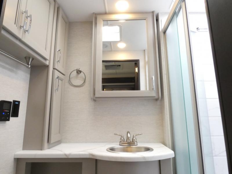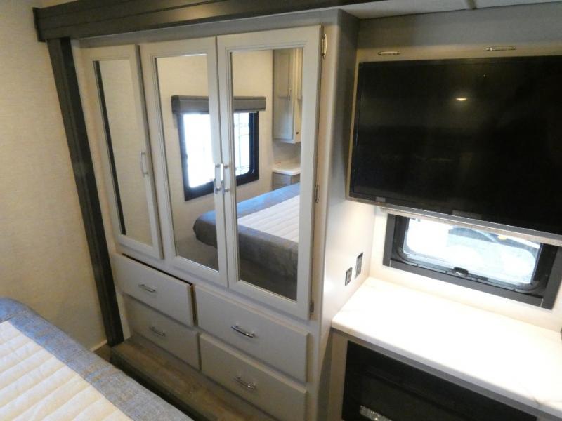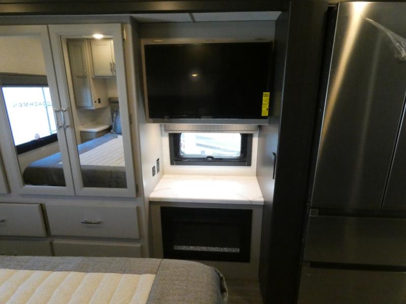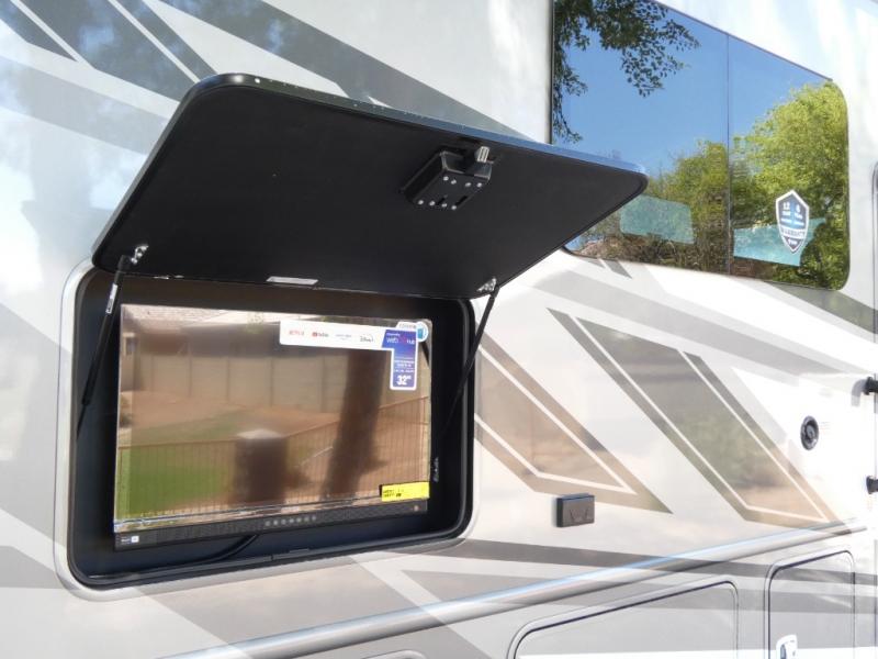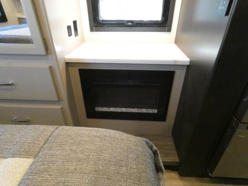 Hit the road in this spacious coach for five to six! The full-wall slide is what makes this model open, and there are plenty of comforts to make you feel at home, like the theater seating with footrests and the Smart TVs found in the living room, bedroom, and exterior! You can prepare meals inside on the three burner gas cooktop or in the convection microwave, but you may just found yourself outdoors at the exterior kitchen if the weather is nice. A full bath onboard lets you clean up each day, and the rear private bedroom will feel just like home with its king bed, closet, TV, and even a fireplace!