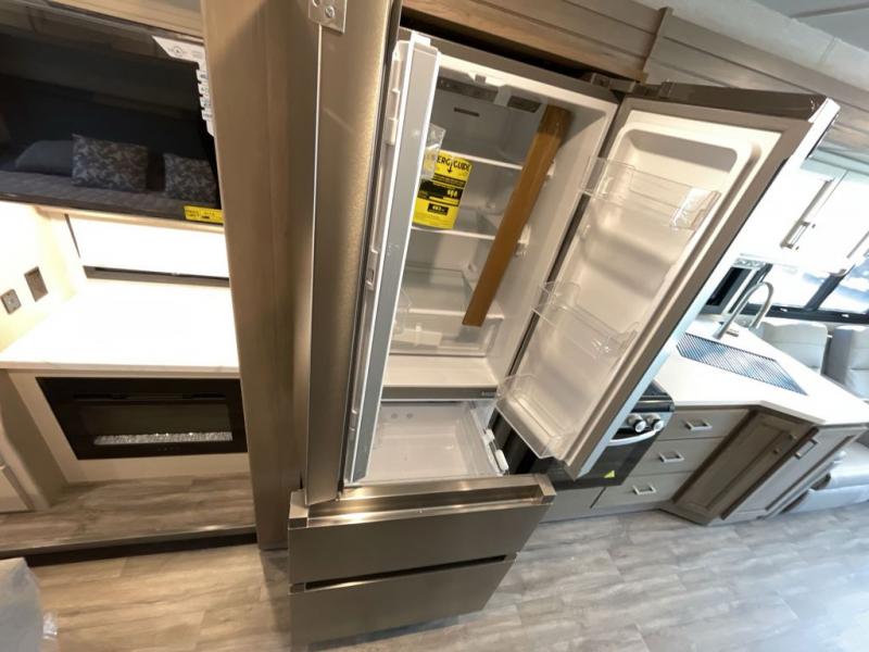 Hit the road in this spacious coach for five to six! The full-wall slide is what makes this model open, and there are plenty of comforts to make you feel at home, like the theater seating with footrests and the Smart TVs found in the living room, bedroom, and exterior! You can prepare meals inside on the three burner gas cooktop or in the convection microwave, but you may just found yourself outdoors at the exterior kitchen if the weather is nice. A full bath onboard lets you clean up each day, and the rear private bedroom will feel just like home with its king bed, closet, TV, and even a fireplace!