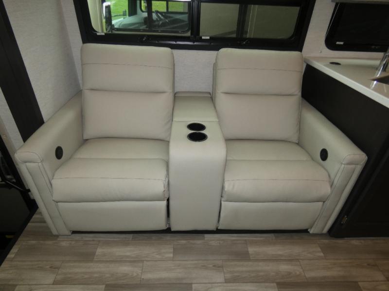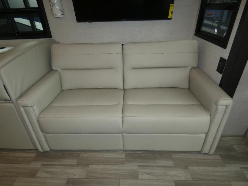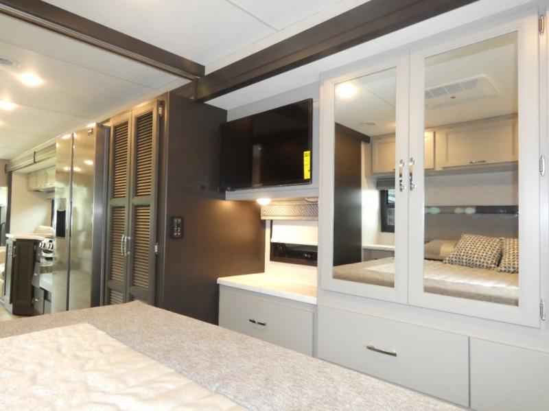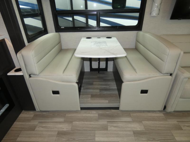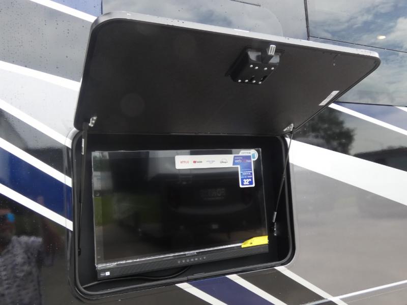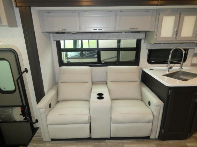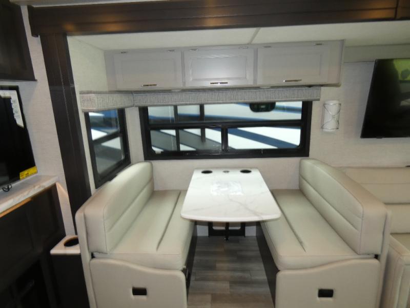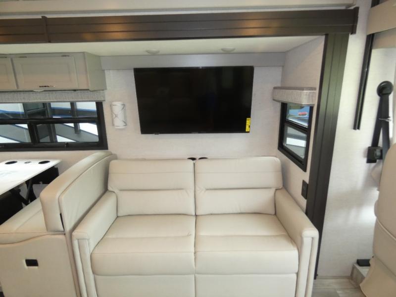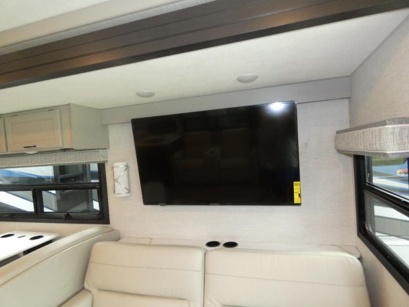 This spacious Class A motorhome has room to sleep eight! Enjoy the privacy of the rear king bedroom which has a spacious closet and a 32" LED Smart TV. Extra guests can utilize the Dream Dinette, the sofa bed, or the drop-down overhead bunk which has a Cotton Cloud mattress for comfort. As if that's not enough, there's a pair of leatherette theater seats with footrests so you can kick back and watch either the 39" or 50" LED Smart TV in the living room. You'll also find another TV outside. A full bath with 30" x 36" shower is conveniently located in the center so everyone has access, and the glass shower door and skylight make it feel roomy. The kitchen features a three-burner gas cooktop and oven, refrigerator, and stainless steel convection microwave. You will also appreciate the closet with stackable washer and dryer prep if you want to add those appliances!
