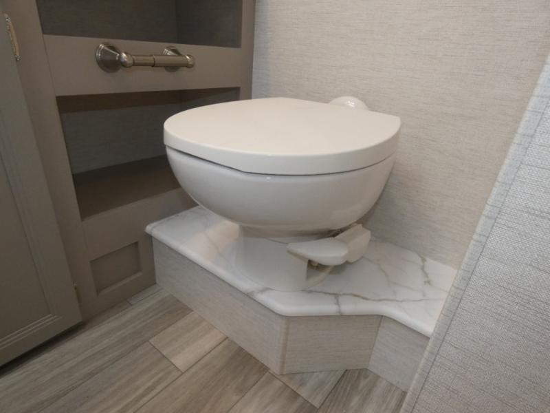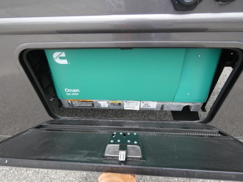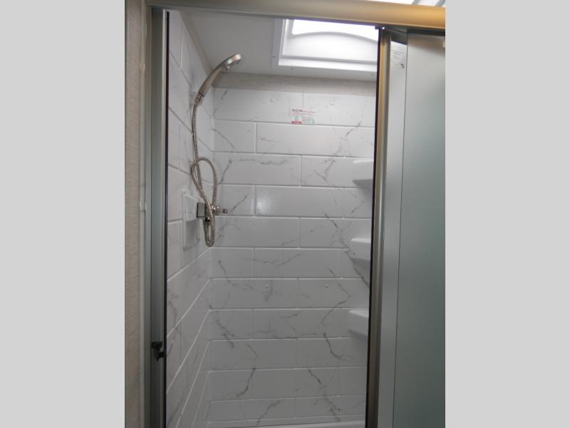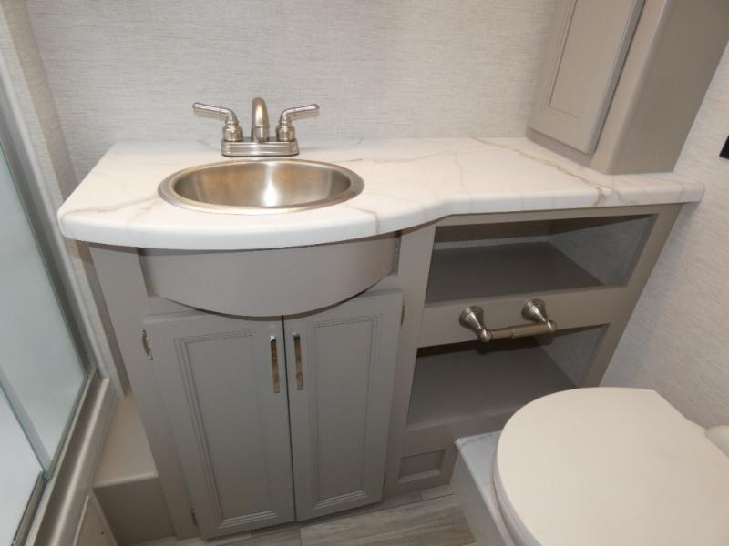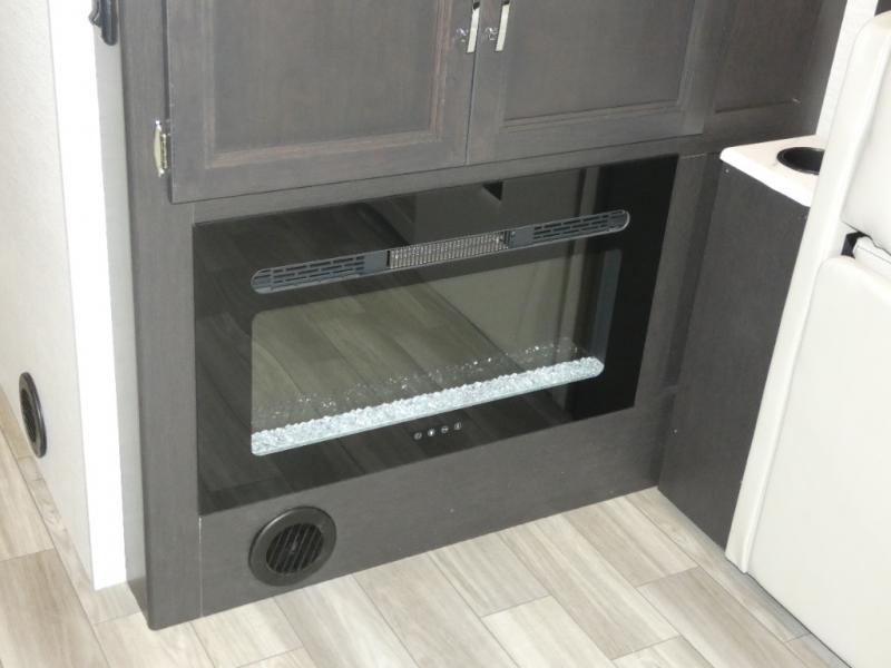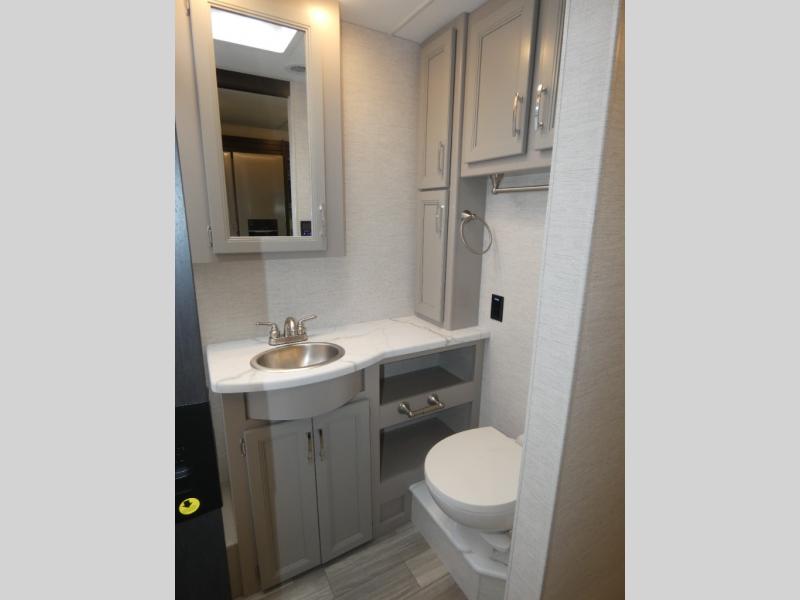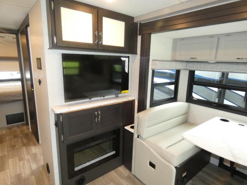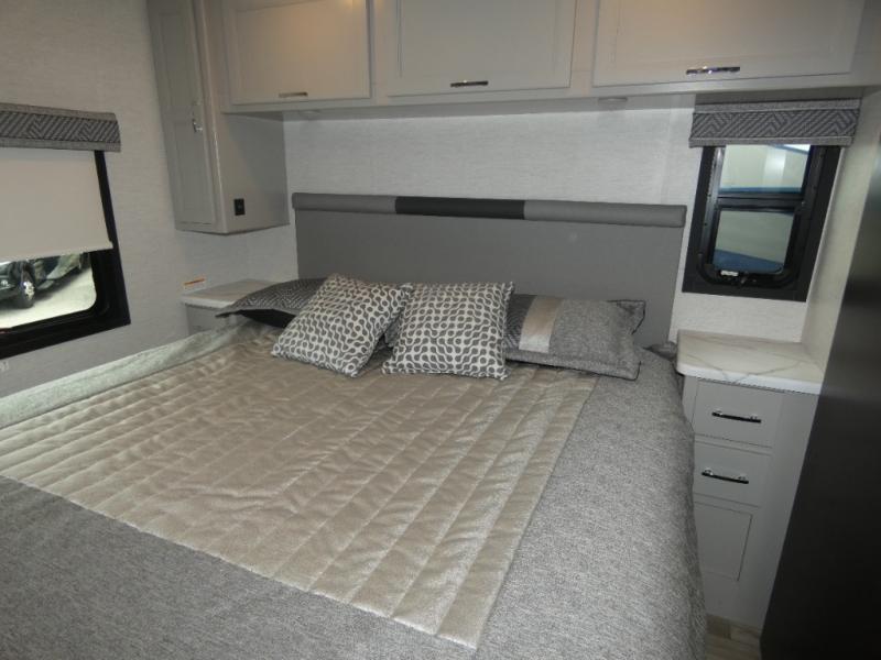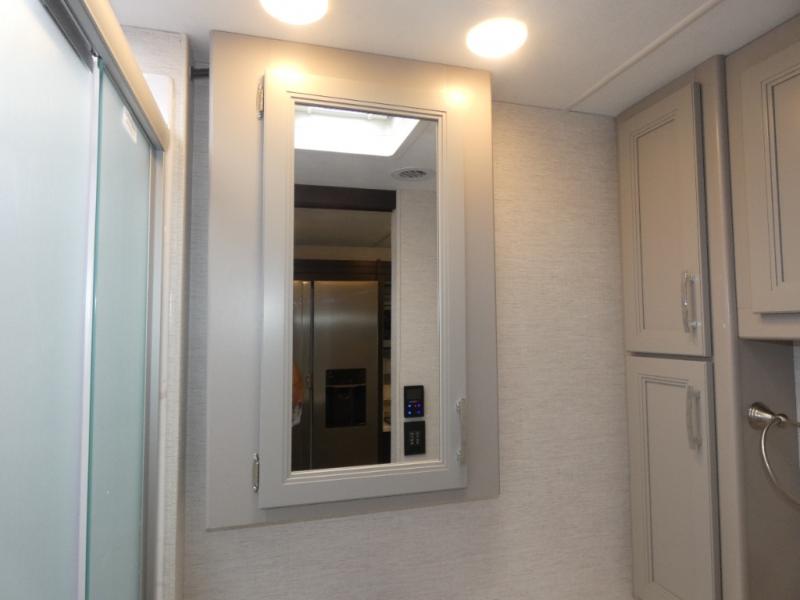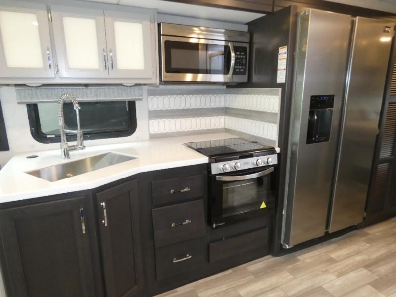 This spacious Class A motorhome has room to sleep eight! Enjoy the privacy of the rear king bedroom which has a spacious closet and a 32" LED Smart TV. Extra guests can utilize the Dream Dinette, the sofa bed, or the drop-down overhead bunk which has a Cotton Cloud mattress for comfort. As if that's not enough, there's a pair of leatherette theater seats with footrests so you can kick back and watch either the 39" or 50" LED Smart TV in the living room. You'll also find another TV outside. A full bath with 30" x 36" shower is conveniently located in the center so everyone has access, and the glass shower door and skylight make it feel roomy. The kitchen features a three-burner gas cooktop and oven, refrigerator, and stainless steel convection microwave. You will also appreciate the closet with stackable washer and dryer prep if you want to add those appliances!