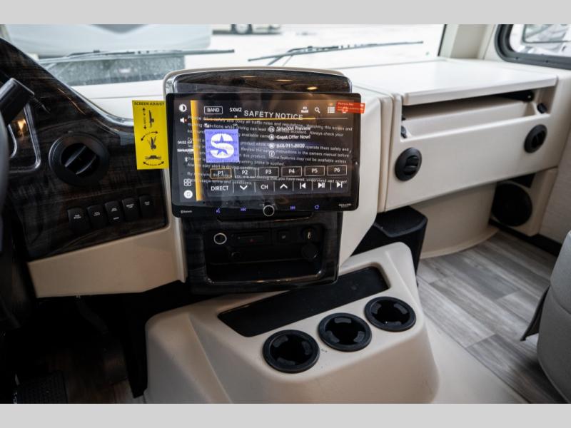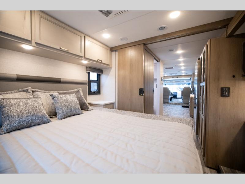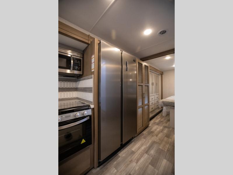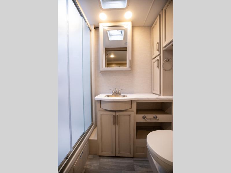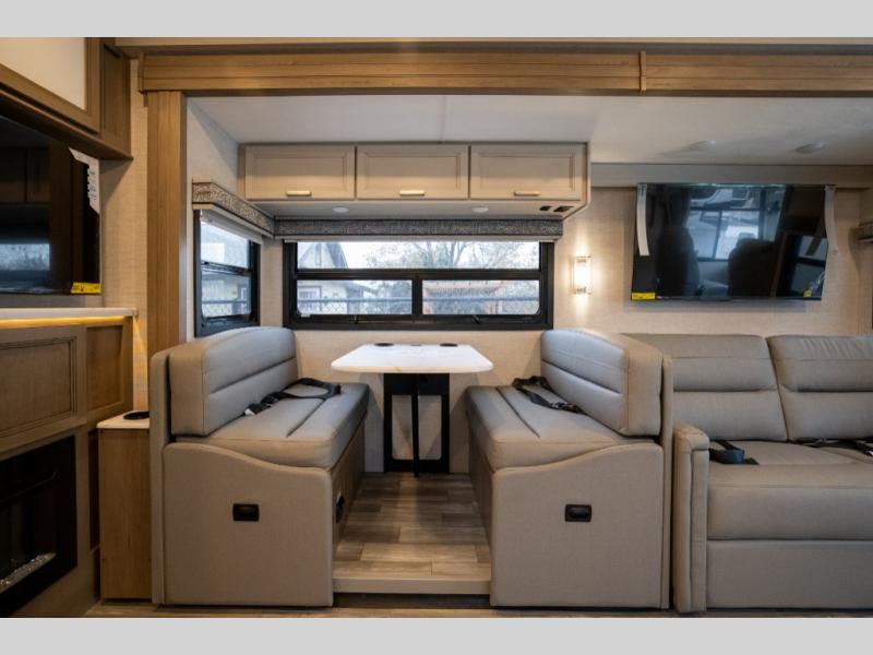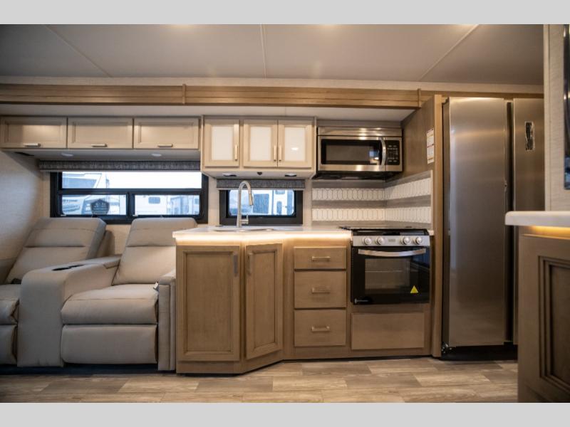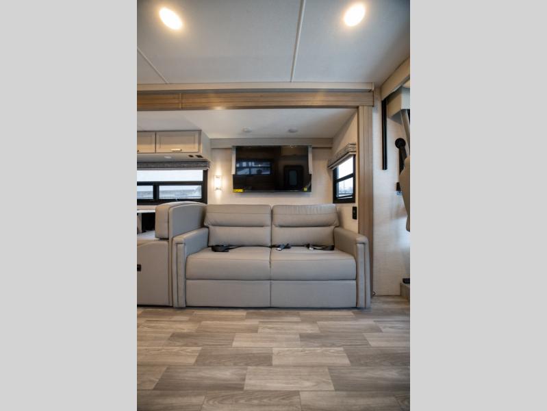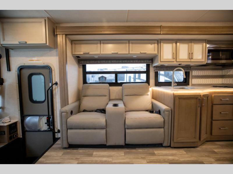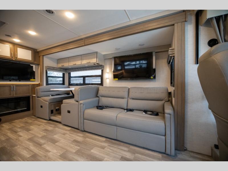 This spacious Class A motorhome has room to sleep eight! Enjoy the privacy of the rear king bedroom which has a spacious closet and a 32" LED Smart TV. Extra guests can utilize the Dream Dinette, the sofa bed, or the drop-down overhead bunk which has a Cotton Cloud mattress for comfort. As if that's not enough, there's a pair of leatherette theater seats with footrests so you can kick back and watch either the 39" or 50" LED Smart TV in the living room. You'll also find another TV outside. A full bath with 30" x 36" shower is conveniently located in the center so everyone has access, and the glass shower door and skylight make it feel roomy. The kitchen features a three-burner gas cooktop and oven, refrigerator, and stainless steel convection microwave. You will also appreciate the closet with stackable washer and dryer prep if you want to add those appliances!