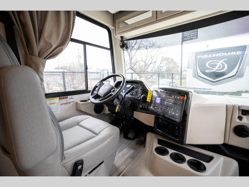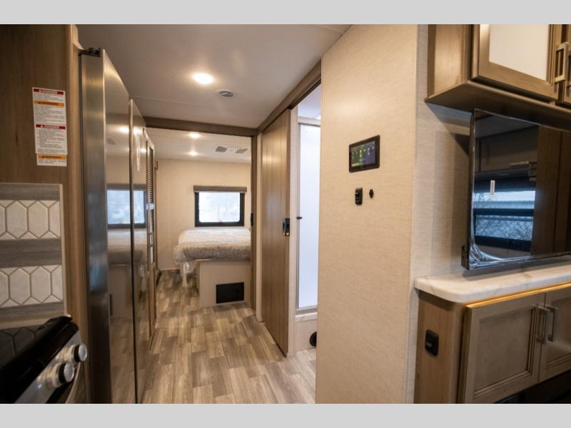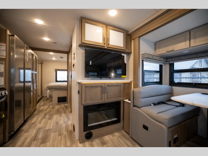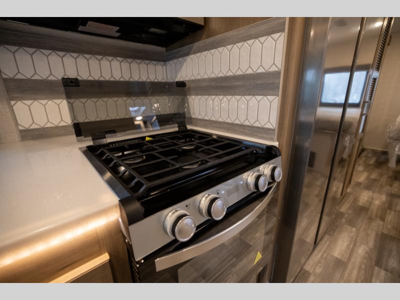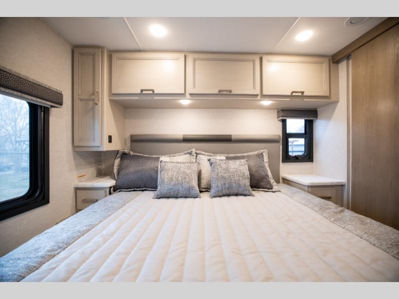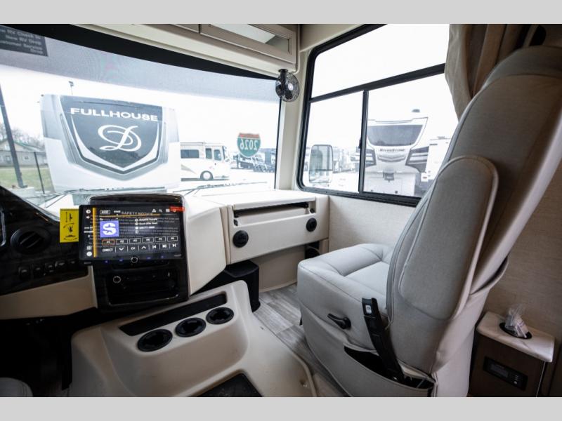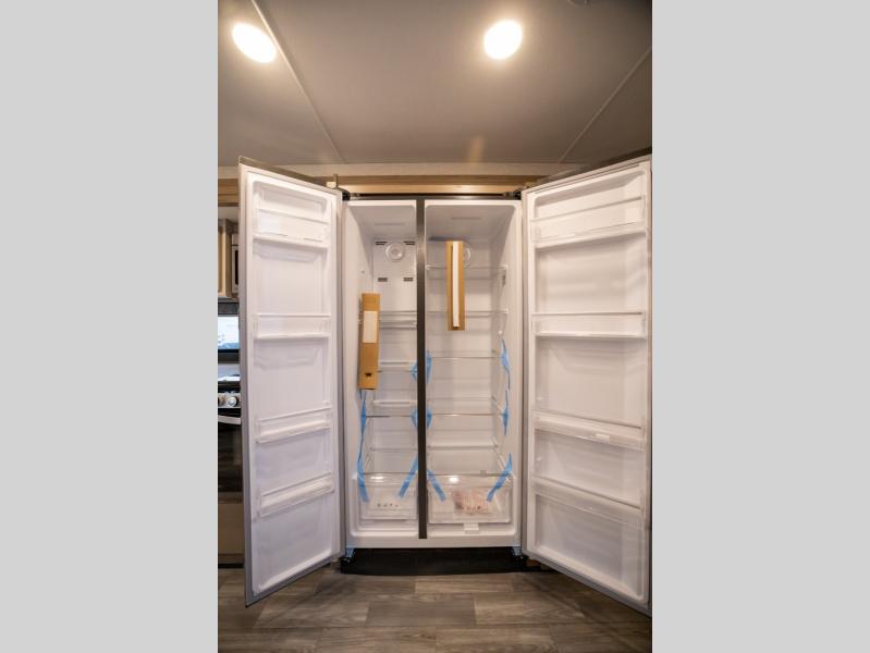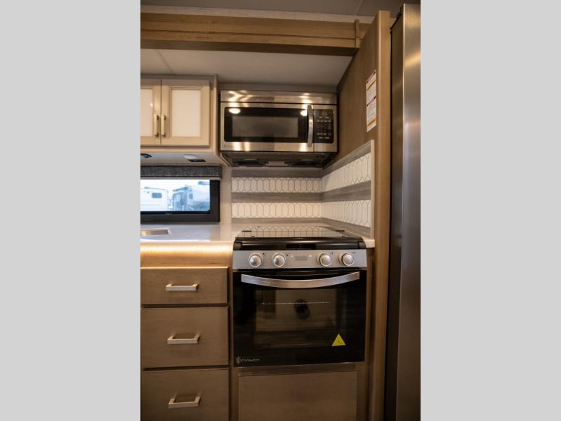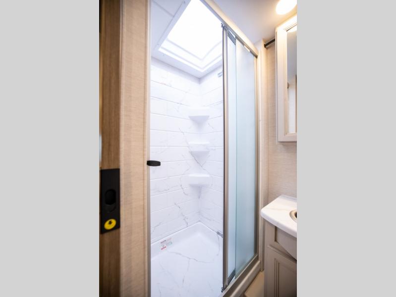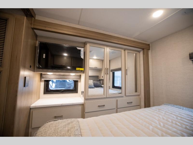 This spacious Class A motorhome has room to sleep eight! Enjoy the privacy of the rear king bedroom which has a spacious closet and a 32" LED Smart TV. Extra guests can utilize the Dream Dinette, the sofa bed, or the drop-down overhead bunk which has a Cotton Cloud mattress for comfort. As if that's not enough, there's a pair of leatherette theater seats with footrests so you can kick back and watch either the 39" or 50" LED Smart TV in the living room. You'll also find another TV outside. A full bath with 30" x 36" shower is conveniently located in the center so everyone has access, and the glass shower door and skylight make it feel roomy. The kitchen features a three-burner gas cooktop and oven, refrigerator, and stainless steel convection microwave. You will also appreciate the closet with stackable washer and dryer prep if you want to add those appliances!