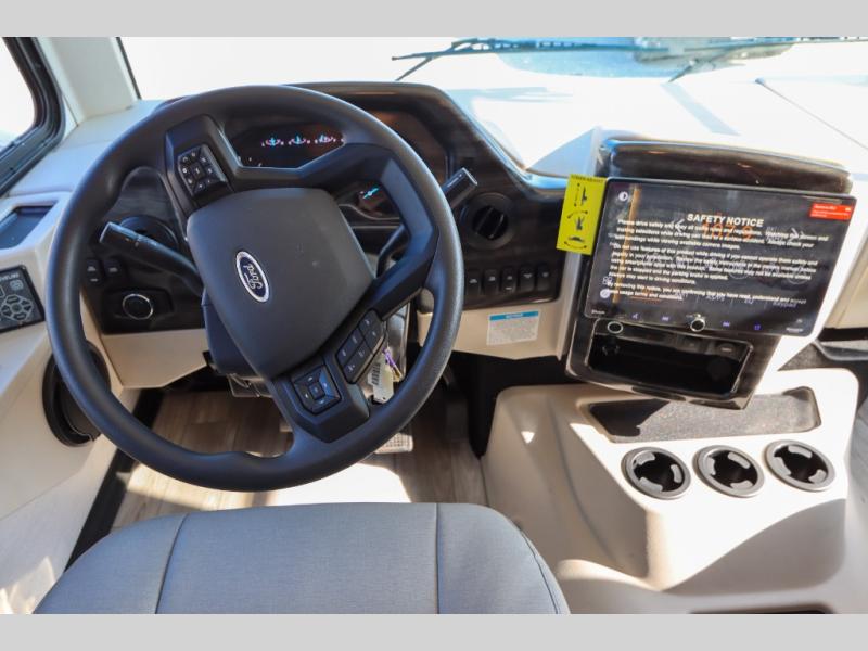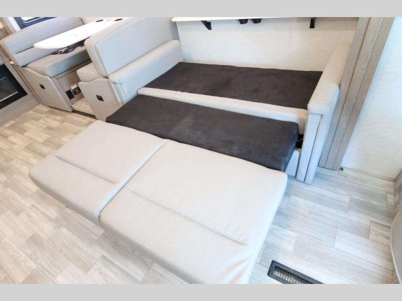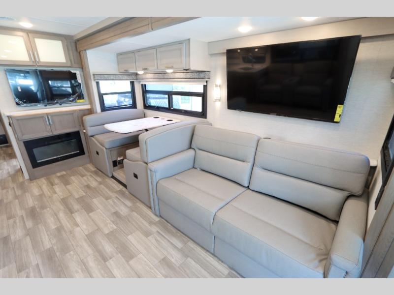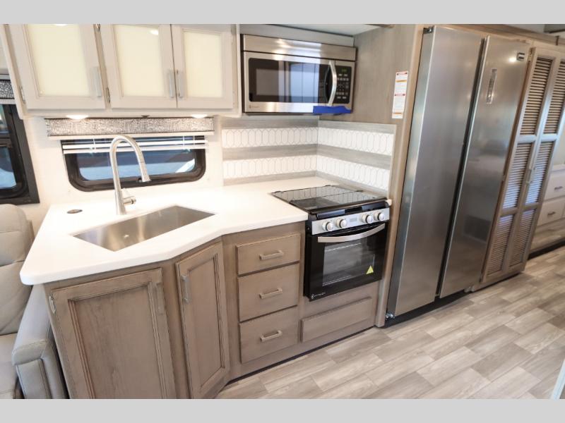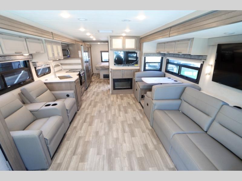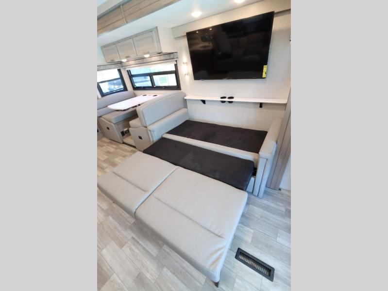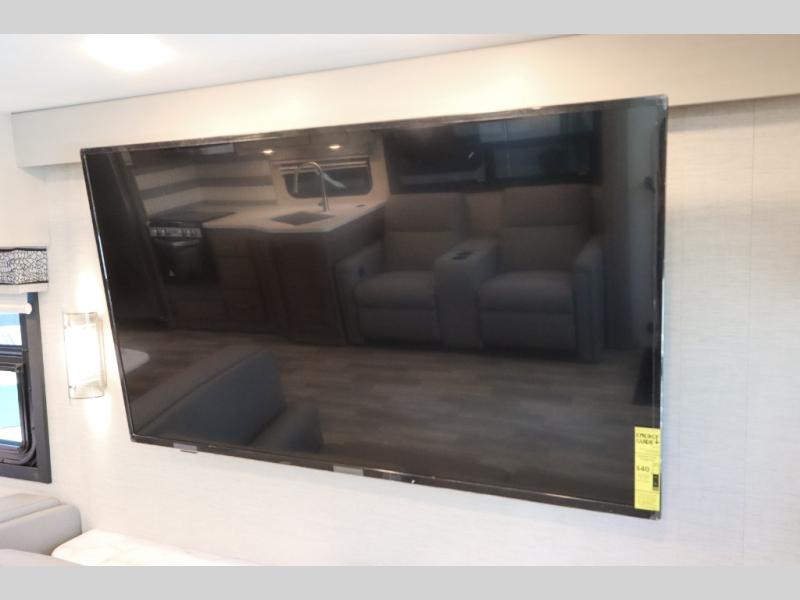 This spacious Class A motorhome has room to sleep eight! Enjoy the privacy of the rear king bedroom which has a spacious closet and a 32" LED Smart TV. Extra guests can utilize the Dream Dinette, the sofa bed, or the drop-down overhead bunk which has a Cotton Cloud mattress for comfort. As if that's not enough, there's a pair of leatherette theater seats with footrests so you can kick back and watch either the 39" or 50" LED Smart TV in the living room. You'll also find another TV outside. A full bath with 30" x 36" shower is conveniently located in the center so everyone has access, and the glass shower door and skylight make it feel roomy. The kitchen features a three-burner gas cooktop and oven, refrigerator, and stainless steel convection microwave. You will also appreciate the closet with stackable washer and dryer prep if you want to add those appliances!