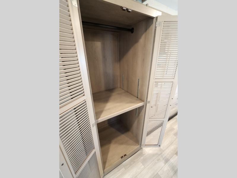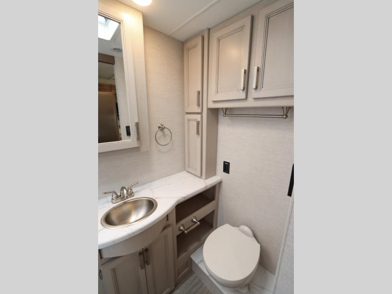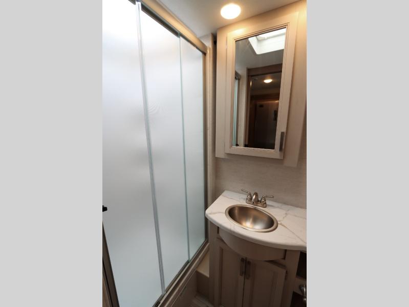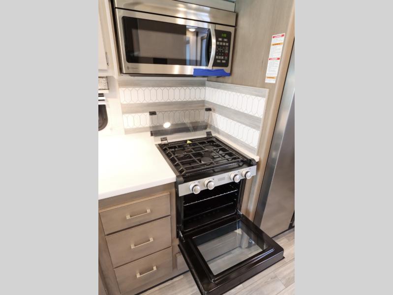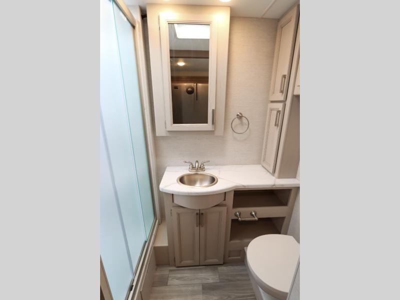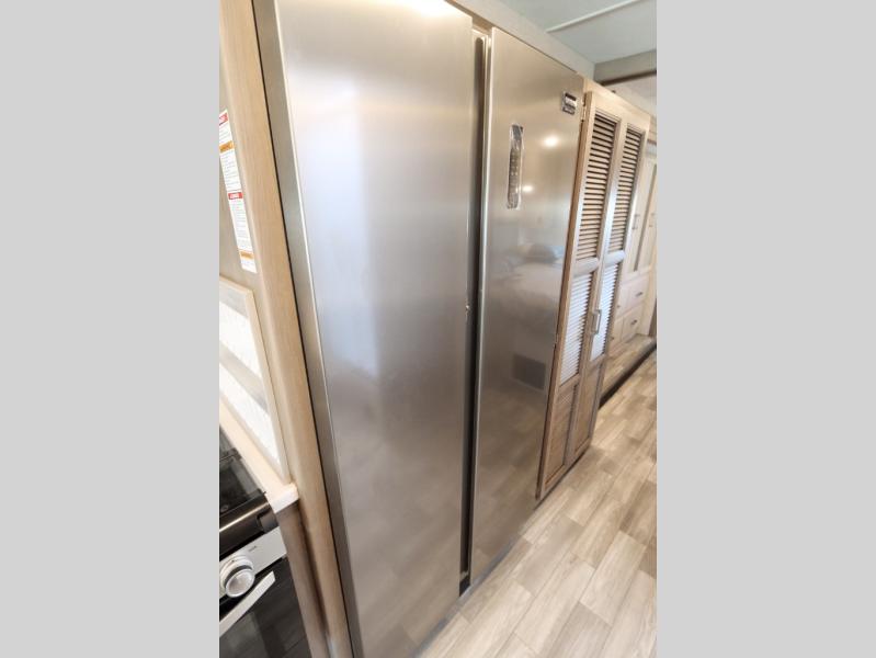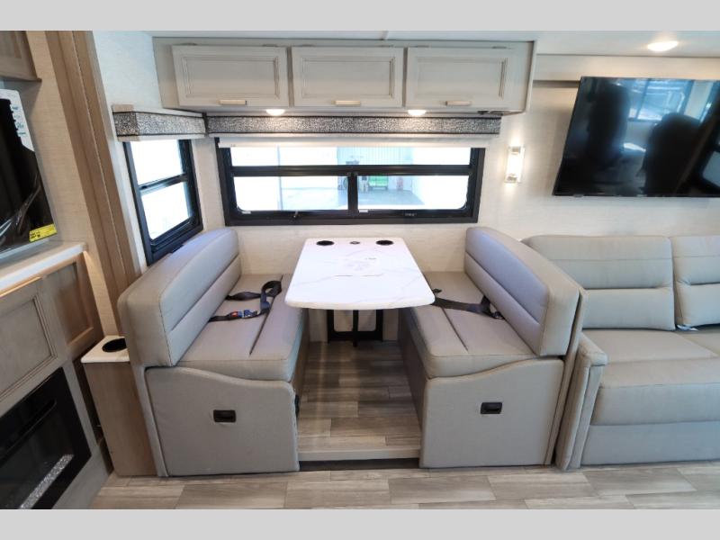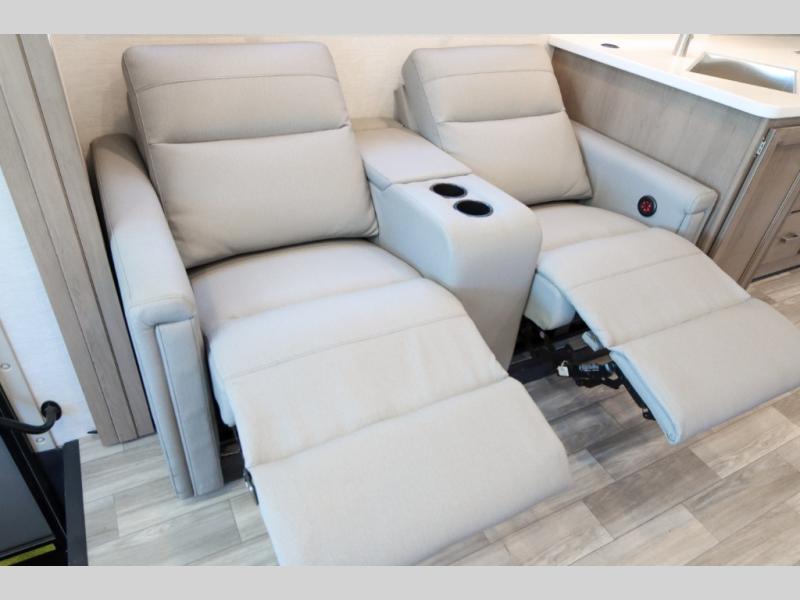 This spacious Class A motorhome has room to sleep eight! Enjoy the privacy of the rear king bedroom which has a spacious closet and a 32" LED Smart TV. Extra guests can utilize the Dream Dinette, the sofa bed, or the drop-down overhead bunk which has a Cotton Cloud mattress for comfort. As if that's not enough, there's a pair of leatherette theater seats with footrests so you can kick back and watch either the 39" or 50" LED Smart TV in the living room. You'll also find another TV outside. A full bath with 30" x 36" shower is conveniently located in the center so everyone has access, and the glass shower door and skylight make it feel roomy. The kitchen features a three-burner gas cooktop and oven, refrigerator, and stainless steel convection microwave. You will also appreciate the closet with stackable washer and dryer prep if you want to add those appliances!