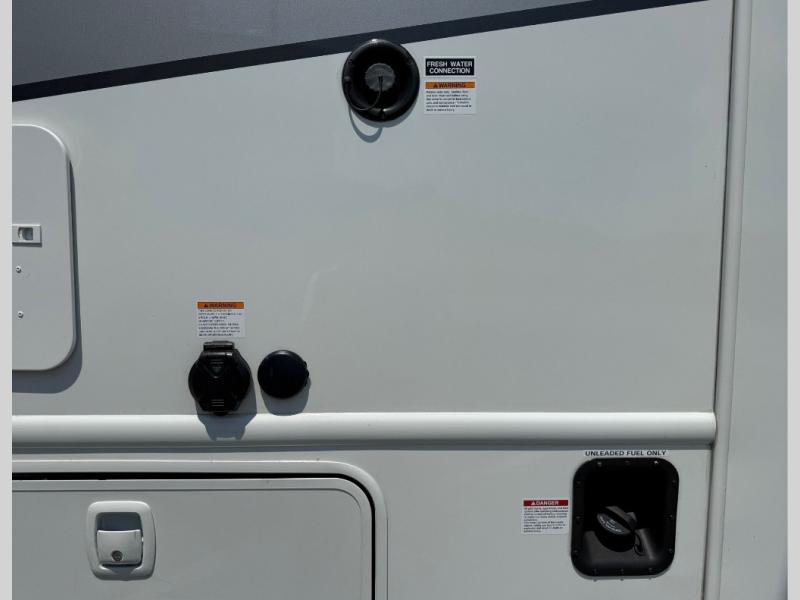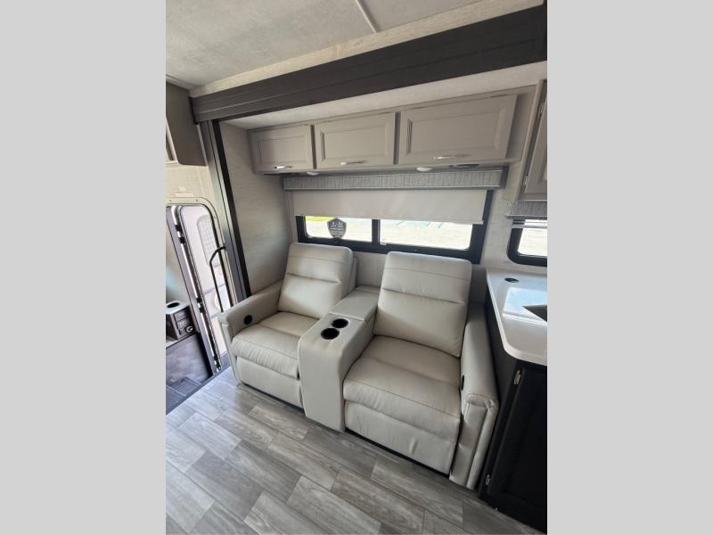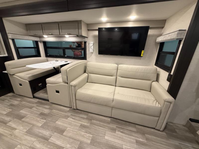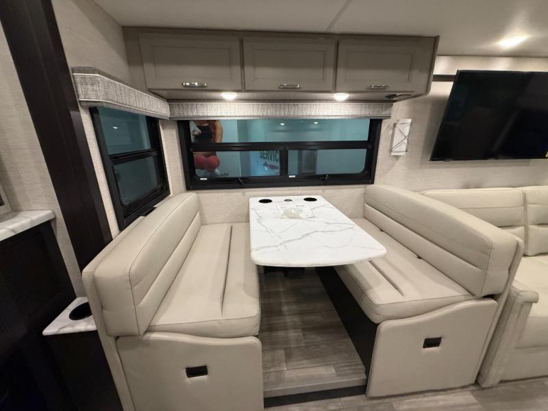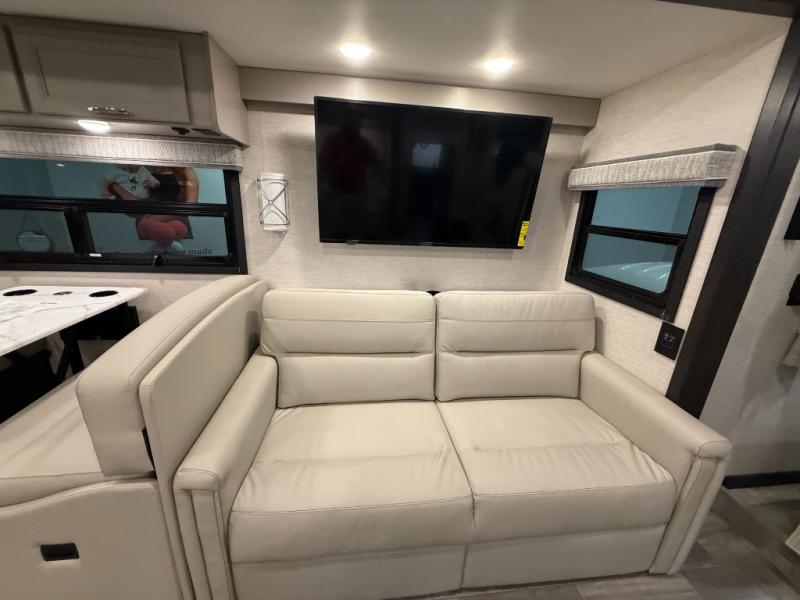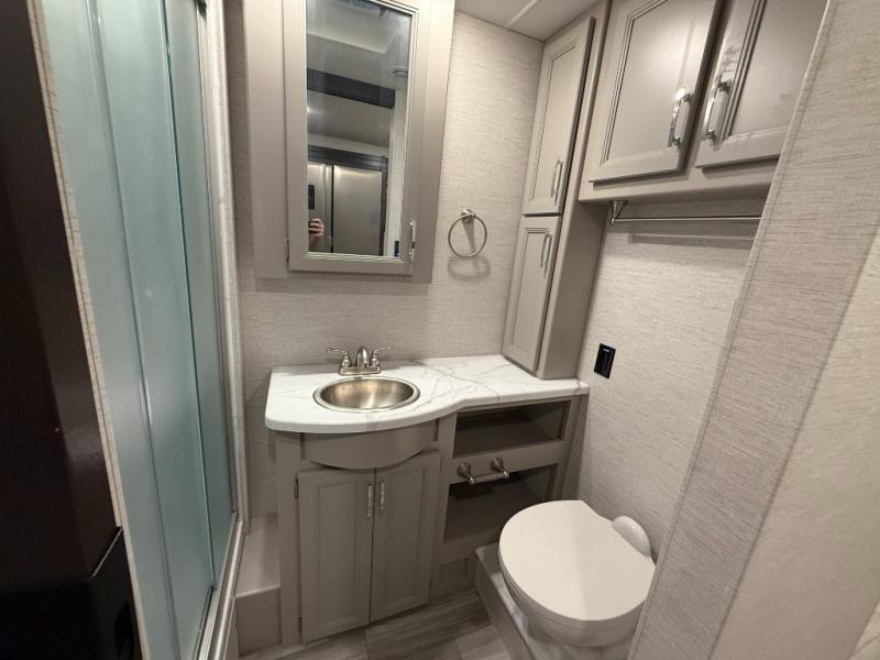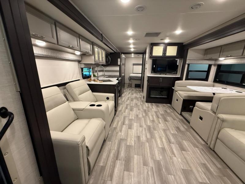 This spacious Class A motorhome has room to sleep eight! Enjoy the privacy of the rear king bedroom which has a spacious closet and a 32" LED Smart TV. Extra guests can utilize the Dream Dinette, the sofa bed, or the drop-down overhead bunk which has a Cotton Cloud mattress for comfort. As if that's not enough, there's a pair of leatherette theater seats with footrests so you can kick back and watch either the 40" or 50" LED Smart TV in the living room. You'll also find another TV outside. A full bath with 30" x 36" shower is conveniently located in the center so everyone has access, and the glass shower door and skylight make it feel roomy. The kitchen features a three-burner gas cooktop and oven, refrigerator, and stainless steel convection microwave. You will also appreciate the closet with stackable washer and dryer prep if you want to add those appliances!