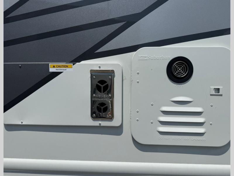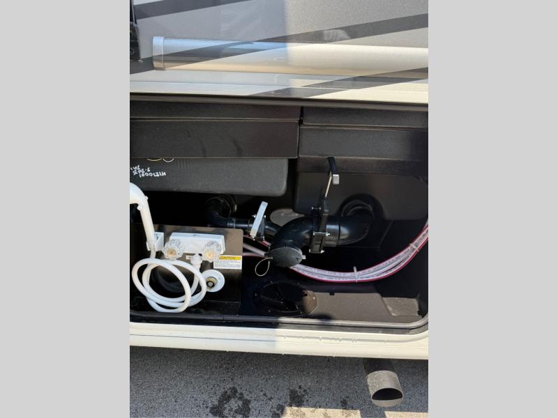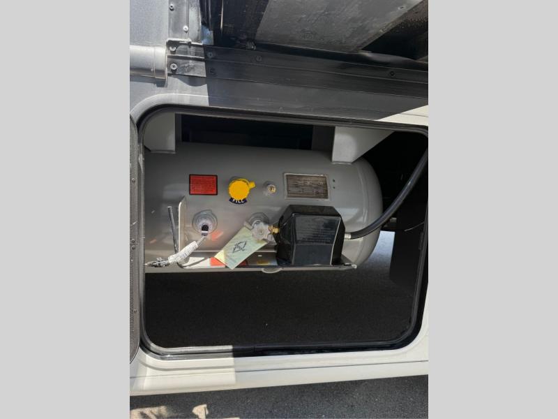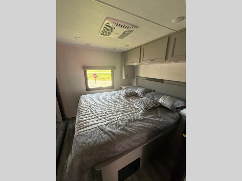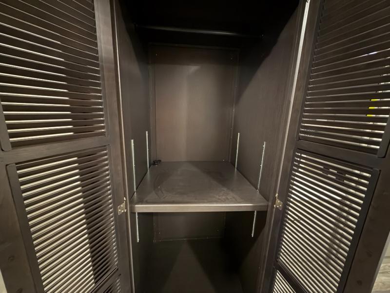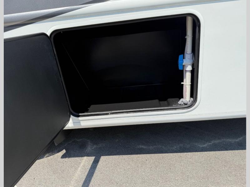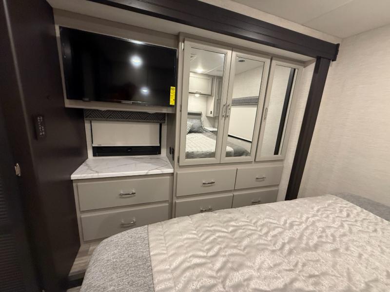 This spacious Class A motorhome has room to sleep eight! Enjoy the privacy of the rear king bedroom which has a spacious closet and a 32" LED Smart TV. Extra guests can utilize the Dream Dinette, the sofa bed, or the drop-down overhead bunk which has a Cotton Cloud mattress for comfort. As if that's not enough, there's a pair of leatherette theater seats with footrests so you can kick back and watch either the 40" or 50" LED Smart TV in the living room. You'll also find another TV outside. A full bath with 30" x 36" shower is conveniently located in the center so everyone has access, and the glass shower door and skylight make it feel roomy. The kitchen features a three-burner gas cooktop and oven, refrigerator, and stainless steel convection microwave. You will also appreciate the closet with stackable washer and dryer prep if you want to add those appliances!