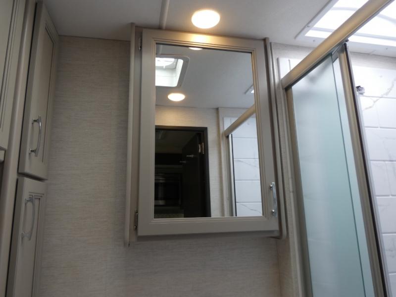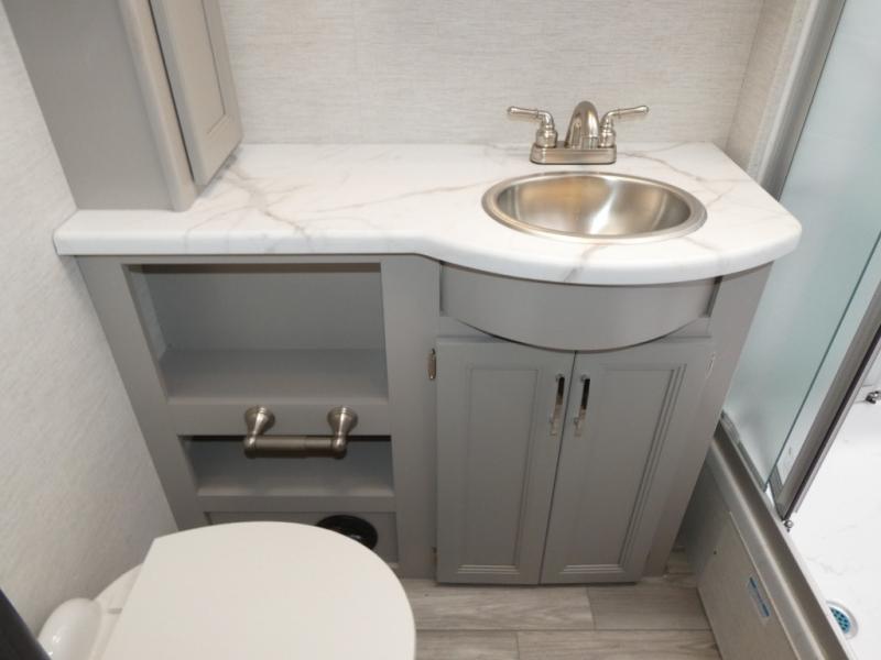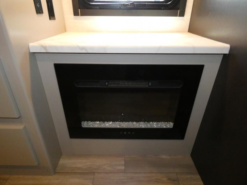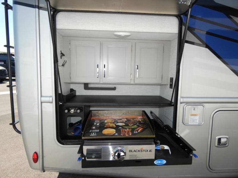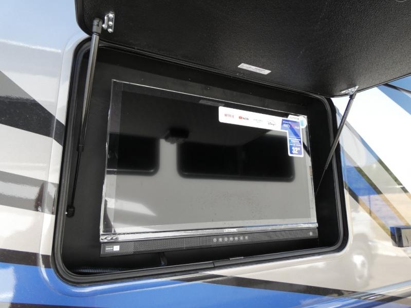 The Luminate MM30 Class A gas motorhome is super spacious featuring a full wall slide along the roadside, and with the drop-down overhead bunk easily sleeps four! There is a 68" theater seat with footrests for two within the full-wall slide for movie night and a Dream Dinette opposite for dining and games. You will also love the rear master bedroom which features a spacious king bed and plenty of storage, plus a 32" Smart TV above a fireplace. When it comes to cooking, you can choose from the fully equipped kitchen with three-burner gas cooktop and oven, convection microwave, and residential refrigerator. Or, you can step outside and cook in the fresh air at the exterior kitchen. You can even enjoy the 32" exterior Smart TV while you're out there!
