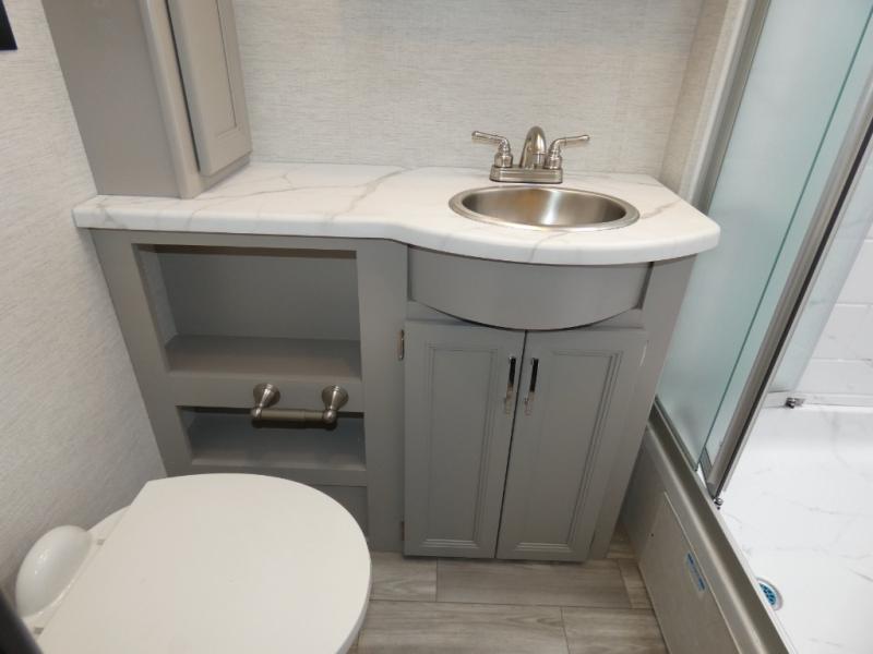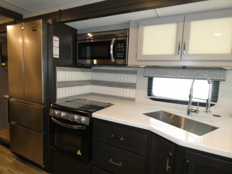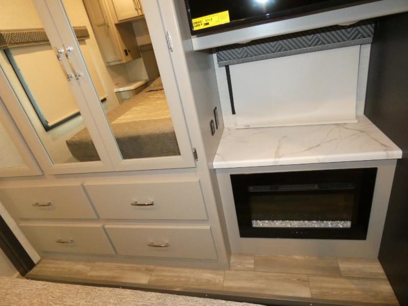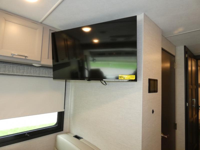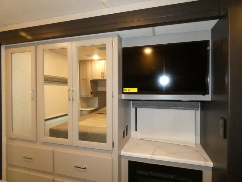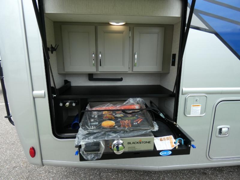 The Luminate MM30 Class A gas motorhome is super spacious featuring a full wall slide along the roadside, and with the drop-down overhead bunk easily sleeps four! There is a 68" theater seat with footrests for two within the full-wall slide for movie night and a Dream Dinette opposite for dining and games. You will also love the rear master bedroom which features a spacious king bed and plenty of storage, plus a 32" Smart TV above a fireplace. When it comes to cooking, you can choose from the fully equipped kitchen with three-burner gas cooktop and oven, convection microwave, and residential refrigerator. Or, you can step outside and cook in the fresh air at the exterior kitchen. You can even enjoy the 32" exterior Smart TV while you're out there!