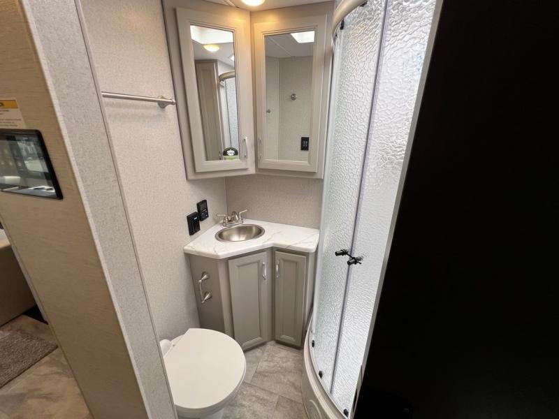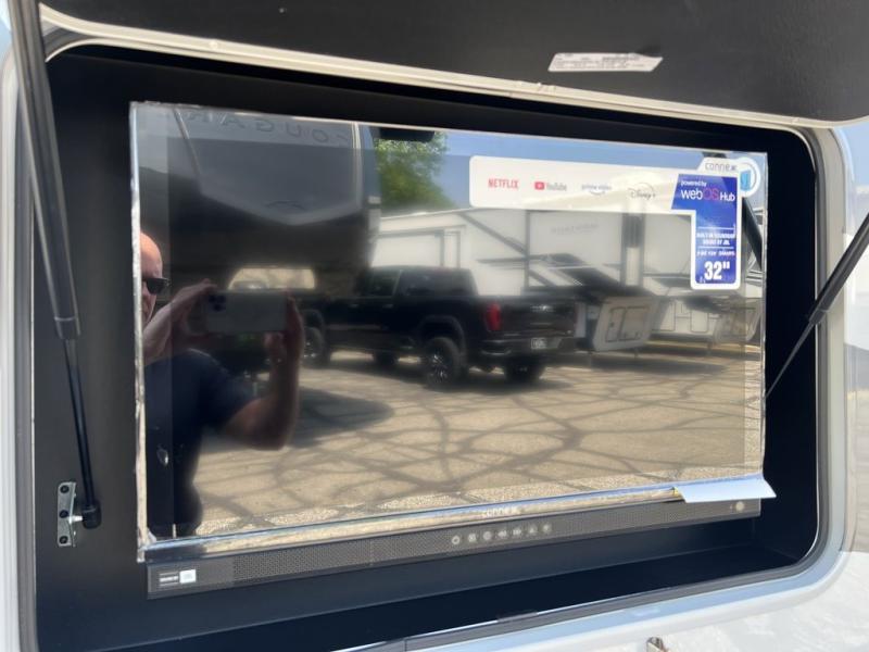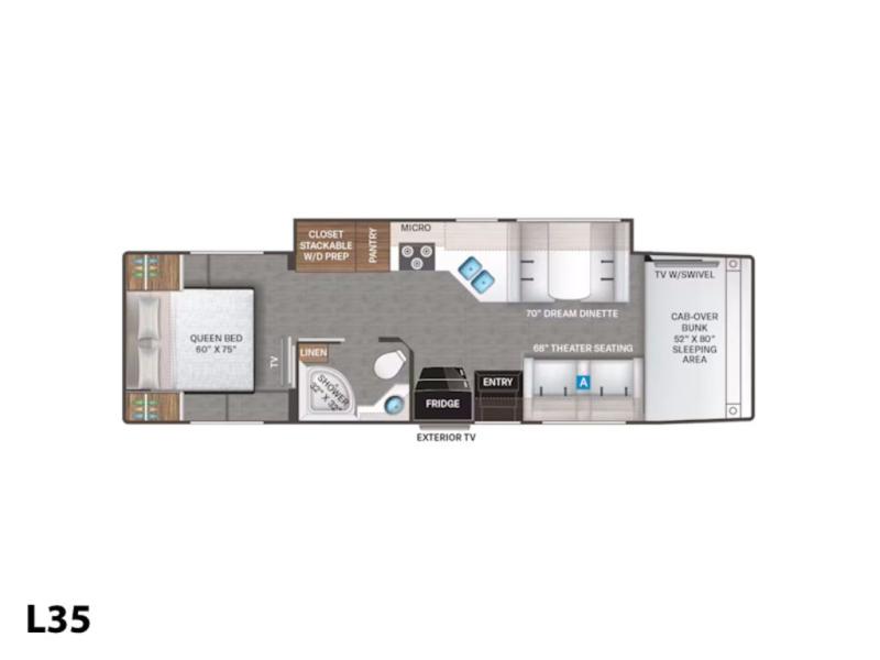 This motorhome has everything you need to create unforgettable memories on the road. Retreat to the serene rear bedroom, featuring a plush queen bed, dual wardrobe beside the bed, and a 32” Smart TV. Conveniently located in the hallway are a closet with washer and dryer prep, and a pantry for storing all your essentials. In front of it, you'll find a spacious full bathroom with a linen closet, perfect for freshening up on the go. The kitchen boasts a residential refrigerator, three-burner cooktop, microwave, and 70” Dream Dinette. Relax and unwind in the 68” theater seating, while watching the 40” Smart TV located over the cab, plus, additional sleeping space is available in the 52” x 80” bunk over cab. And when you're ready to take the party outside, enjoy your favorite shows and movies on the exterior 32” Smart TV.
