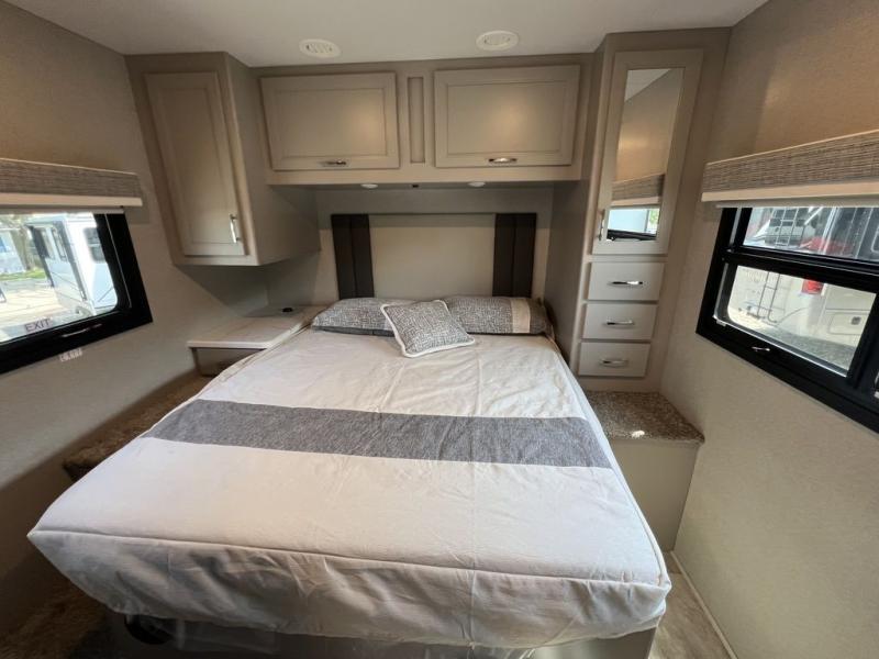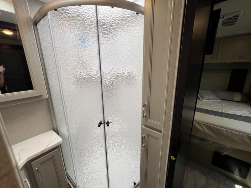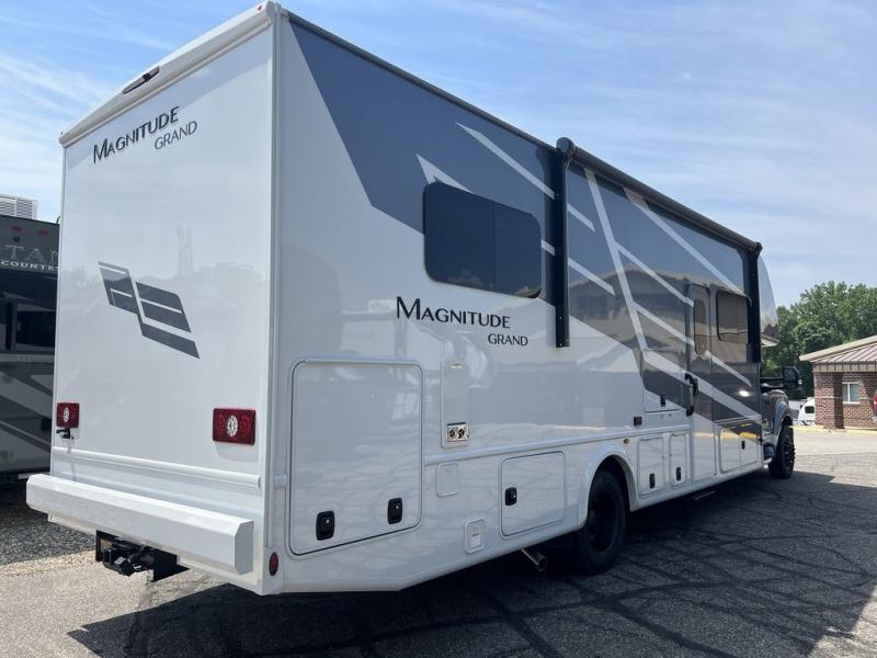 The Magnitude GRAND Super C diesel motorhomes by Thor Motor Coach are built to last, featuring Vacu-bond laminated roofs and floors with block foam insulation for unparalleled durability and climate control which ensures a comfortable and quiet living space. Stay connected and entertained on the go with the innovative sync-enhanced voice recognition communication and entertainment system. With just the sound of your voice, you can control everything from navigation to music playlists. Setting up camp has never been easier, thanks to our automatic leveling jacks with a touchpad, simply press a button and let the system do the work for you. Inside, you'll enjoy incredible interior features like a spacious 84” interior ceiling height, perfect for comfortable living, solid countertops, designer headboard, bedspread, and pillow shams. Plus you can beat the heat with the dual 13,500 BTU roof air conditioners, providing superior cooling power to keep you comfortable in even the warmest climates. Explore our motorhome collection today and discover a new standard of luxury and adventure.