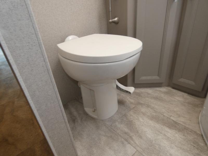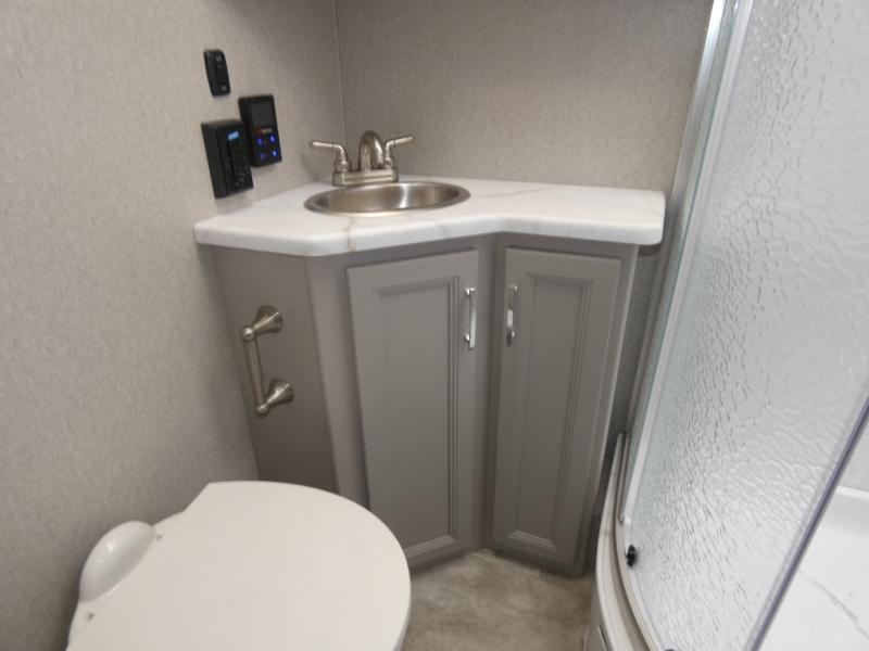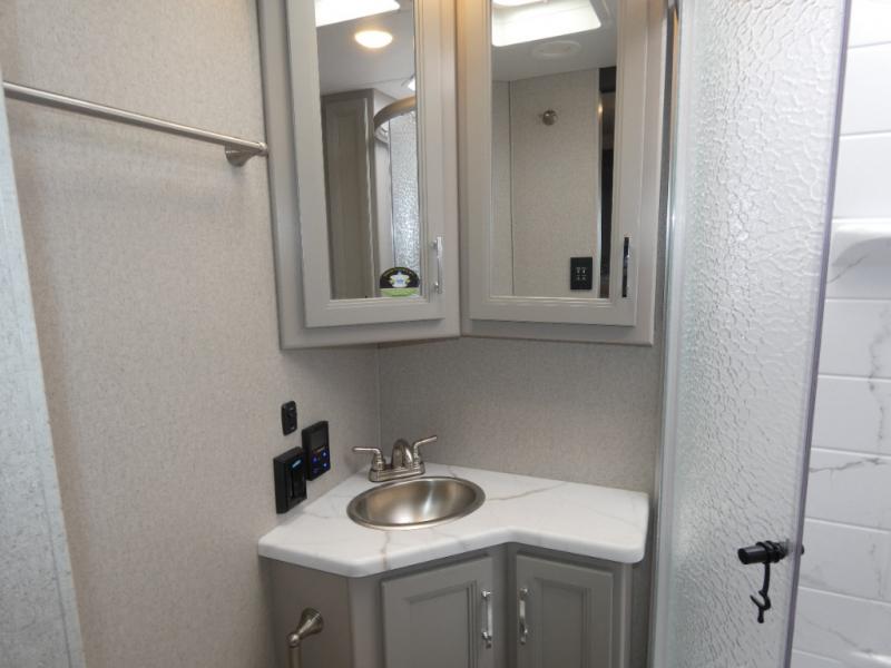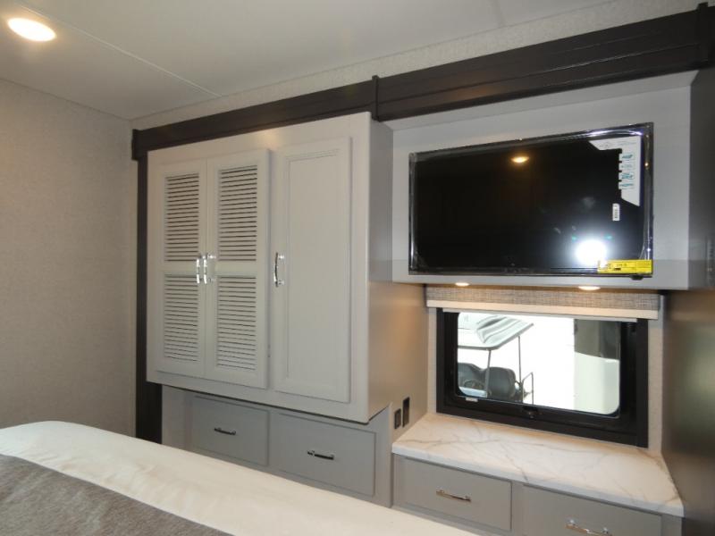 The rear bedroom is a peaceful oasis, featuring a plush king bed, a spacious closet with a washer and dryer prep, a dresser, and a 32” Smart TV. You can accommodate the whole family with 26” x 72” bunk beds which also convert to a closet, in front, you will find a full bathroom with linen closet which ensures everyone stays fresh on the go. The kitchen is a gourmet's delight, boasting a residential refrigerator, a pantry perfect for keeping your stuff organized, a three-burner cooktop, microwave, and a 70” dream dinette ideal for grabbing meals with family and friends. Relax in the 68” theater seating area, while watching a movie in the 40” Smart TV. Additional sleeping space is available in the front bunk over the cab, plus you can spend entertaining yourself on the outside thanks to the 32” Smart TV on the exterior.