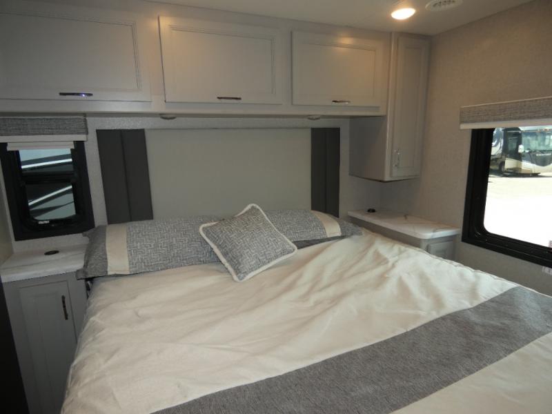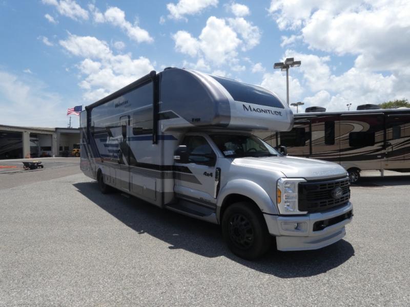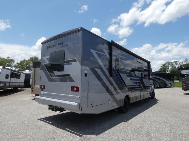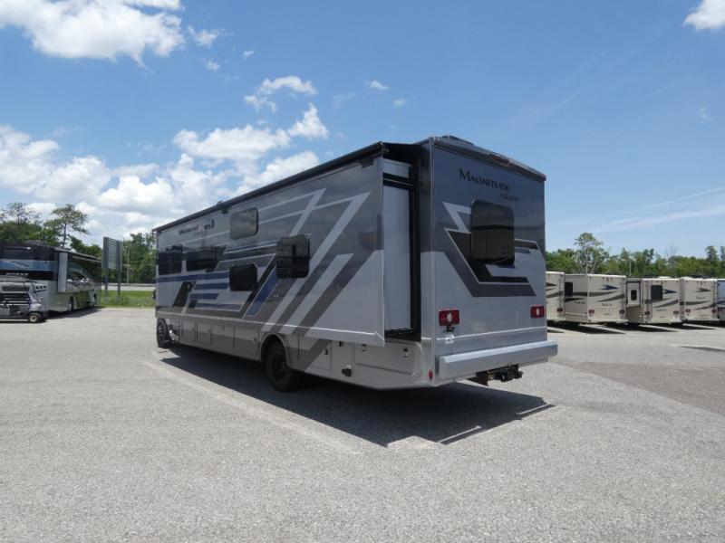 The Magnitude GRAND Super C diesel motorhomes by Thor Motor Coach are built to last, featuring Vacu-bond laminated roofs and floors with block foam insulation for unparalleled durability and climate control which ensures a comfortable and quiet living space. Stay connected and entertained on the go with the innovative sync-enhanced voice recognition communication and entertainment system. With just the sound of your voice, you can control everything from navigation to music playlists. Setting up camp has never been easier, thanks to our automatic leveling jacks with a touchpad, simply press a button and let the system do the work for you. Inside, you'll enjoy incredible interior features like a spacious 84” interior ceiling height, perfect for comfortable living, solid countertops, designer headboard, bedspread, and pillow shams. Plus you can beat the heat with the dual 13,500 BTU roof air conditioners, providing superior cooling power to keep you comfortable in even the warmest climates. Explore our motorhome collection today and discover a new standard of luxury and adventure.