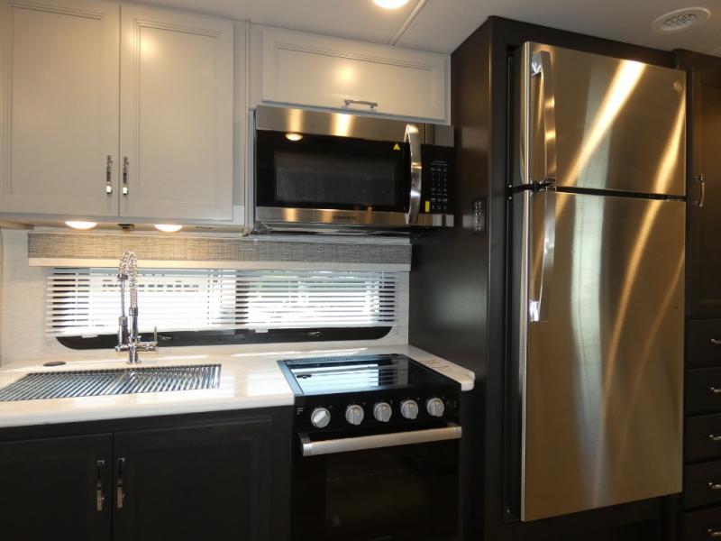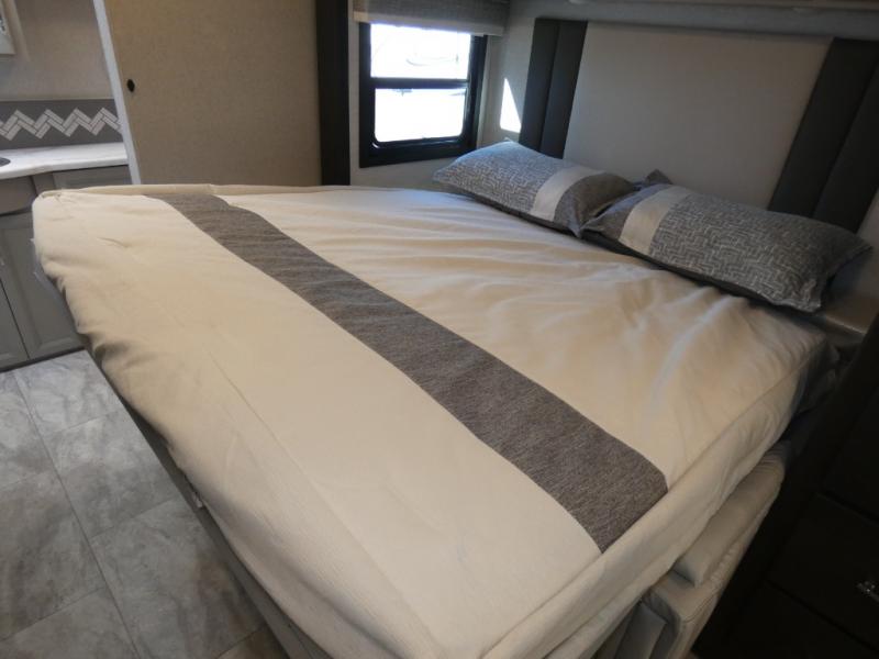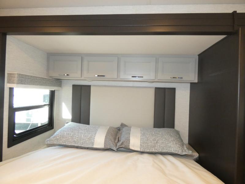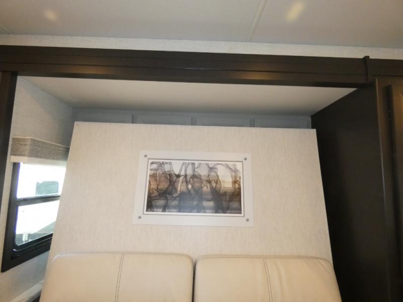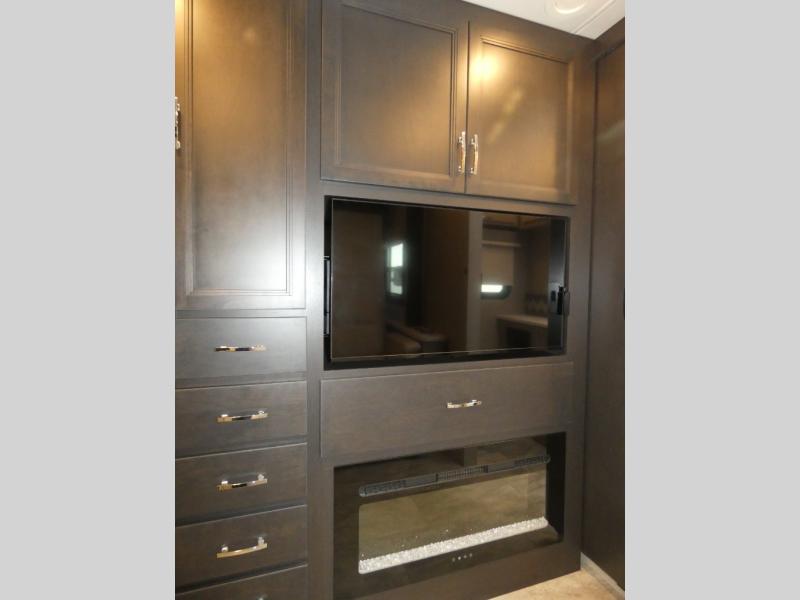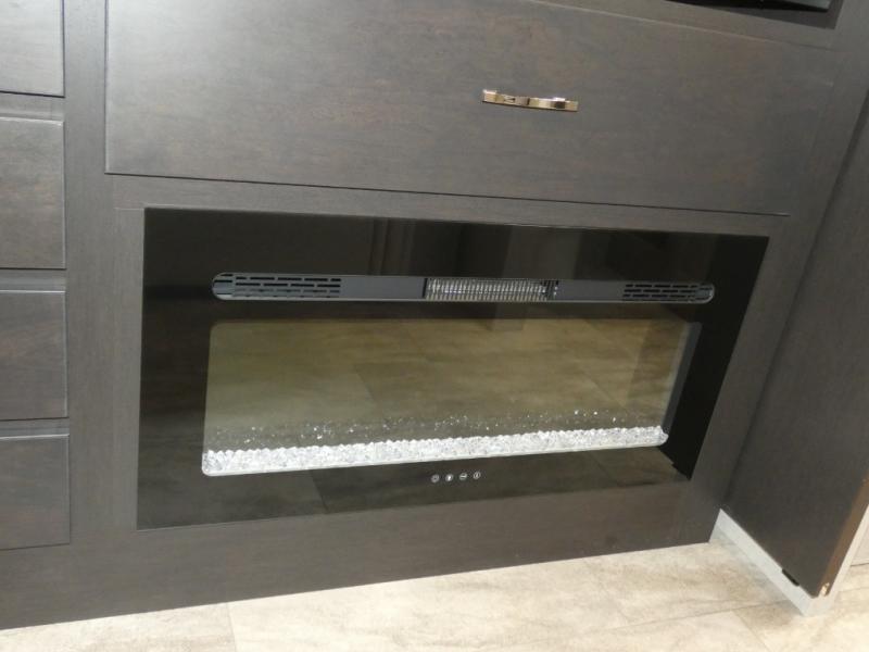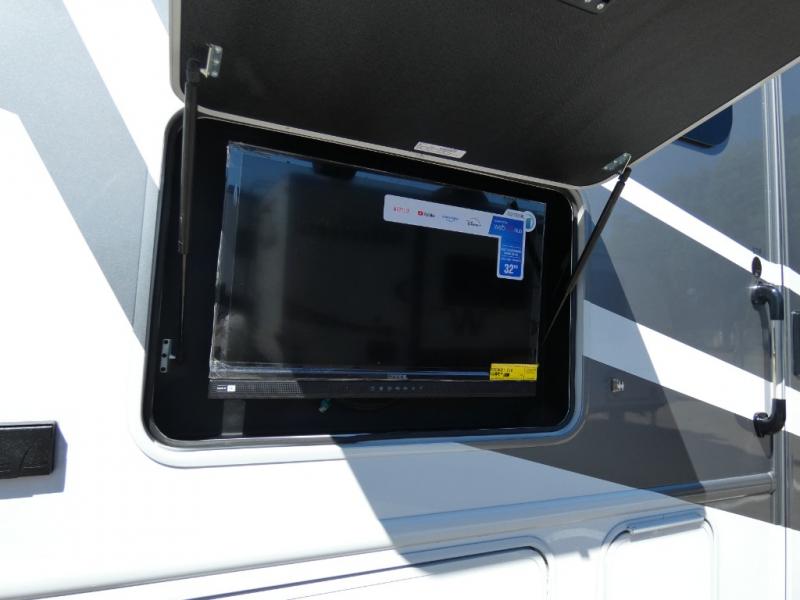 Relax in the full rear bathroom, featuring a spacious 30” x 36” shower. The living area boasts a versatile sofa with a murphy bed, perfect for guests or extra sleeping space. Cozy up by the fireplace, enjoy your favorite shows on the TV, and organize your stuff in the ample shelving and storage. The closet also provides additional space for your belongings. The kitchen is a culinary dream, equipped with a pantry, drawers, fridge, three-burner cooktop, and a microwave. Gather with family and friends at the 70” dream dinette, perfect for meals and game nights. Additional sleeping space is available in the front bunk over the cab, and when you're ready to take the party outside, enjoy your favorite shows on the exterior TV.
