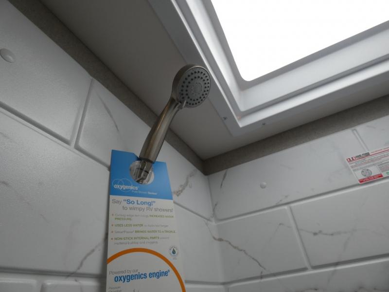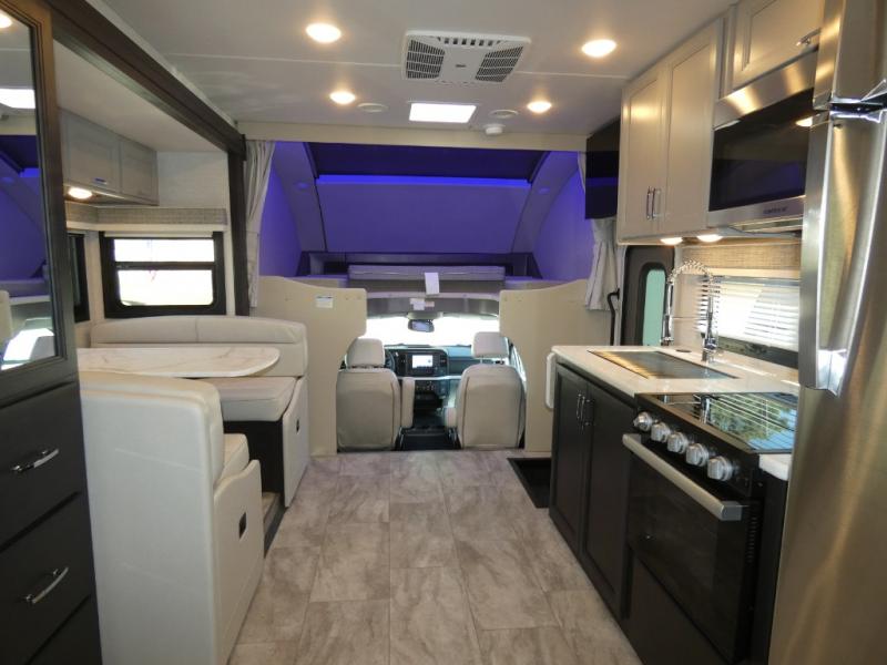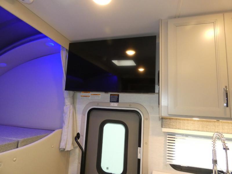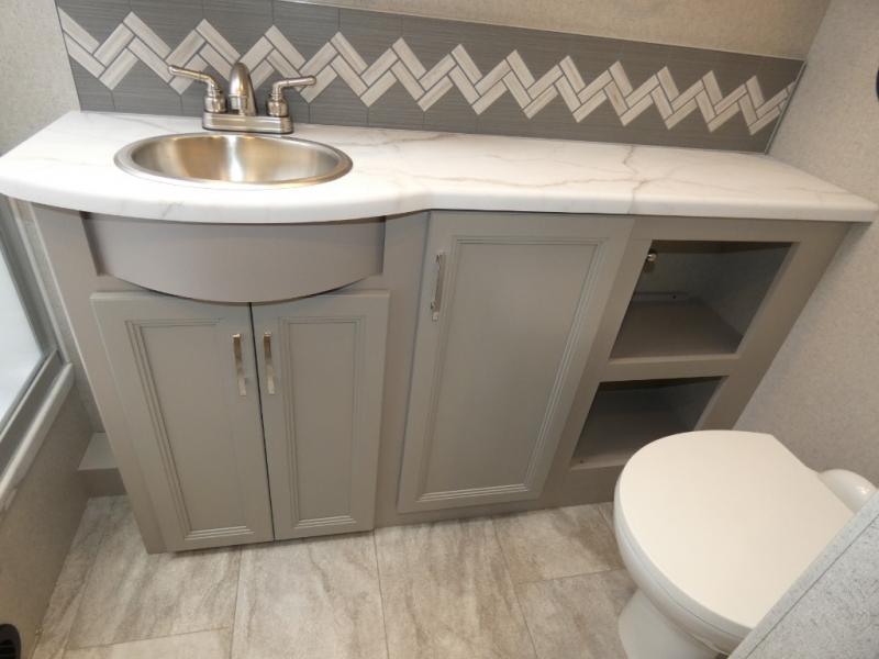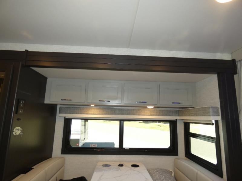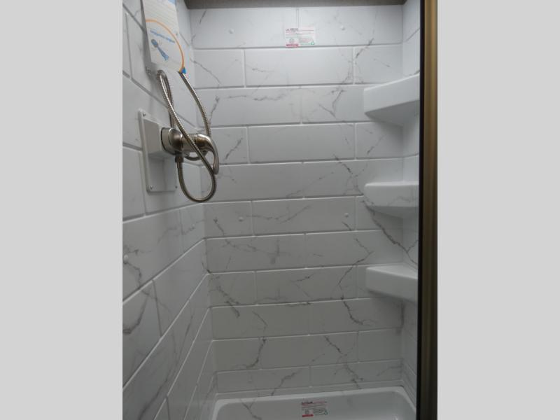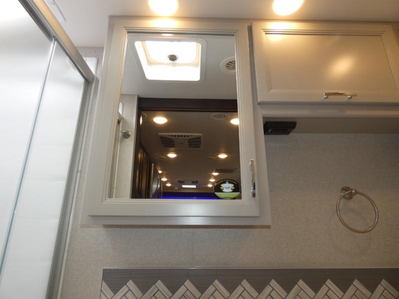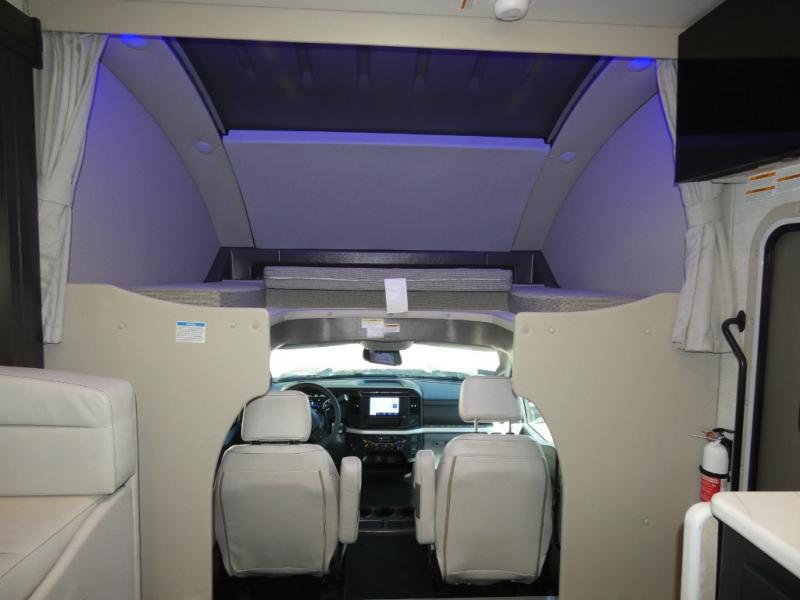 Relax in the full rear bathroom, featuring a spacious 30” x 36” shower. The living area boasts a versatile sofa with a murphy bed, perfect for guests or extra sleeping space. Cozy up by the fireplace, enjoy your favorite shows on the TV, and organize your stuff in the ample shelving and storage. The closet also provides additional space for your belongings. The kitchen is a culinary dream, equipped with a pantry, drawers, fridge, three-burner cooktop, and a microwave. Gather with family and friends at the 70” dream dinette, perfect for meals and game nights. Additional sleeping space is available in the front bunk over the cab, and when you're ready to take the party outside, enjoy your favorite shows on the exterior TV.