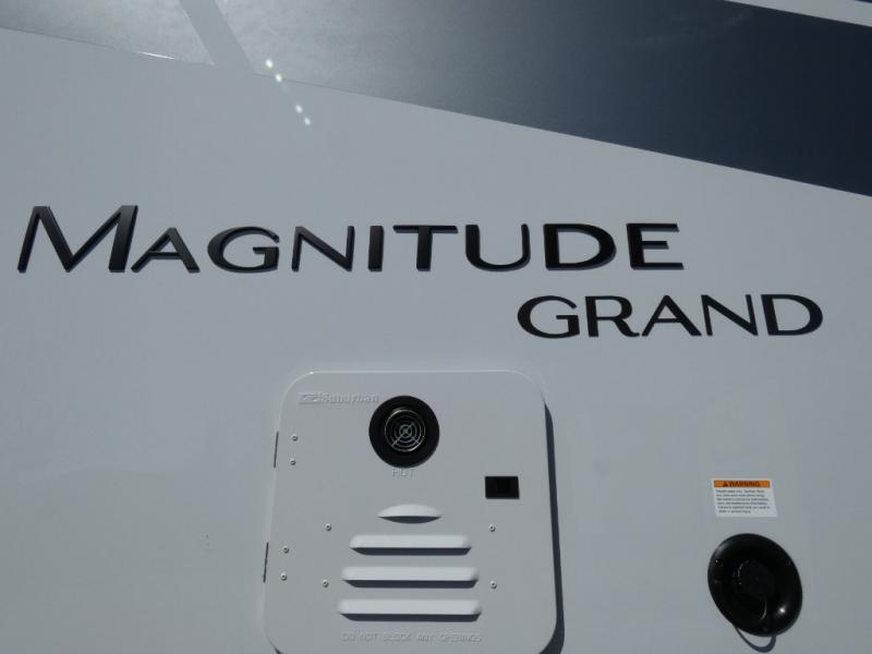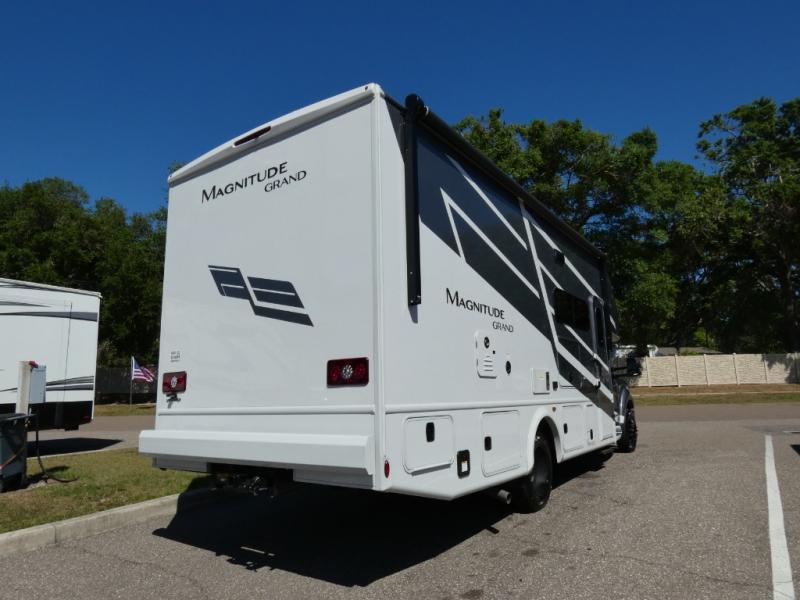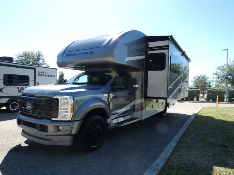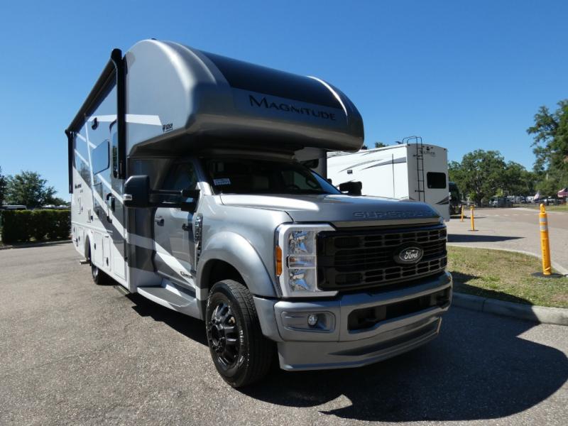 The Magnitude GRAND Super C diesel motorhomes by Thor Motor Coach are built to last, featuring Vacu-bond laminated roofs and floors with block foam insulation for unparalleled durability and climate control which ensures a comfortable and quiet living space. Stay connected and entertained on the go with the innovative sync-enhanced voice recognition communication and entertainment system. With just the sound of your voice, you can control everything from navigation to music playlists. Setting up camp has never been easier, thanks to our automatic leveling jacks with a touchpad, simply press a button and let the system do the work for you. Inside, you'll enjoy incredible interior features like a spacious 84” interior ceiling height, perfect for comfortable living, solid countertops, designer headboard, bedspread, and pillow shams. Plus you can beat the heat with the dual 13,500 BTU roof air conditioners, providing superior cooling power to keep you comfortable in even the warmest climates. Explore our motorhome collection today and discover a new standard of luxury and adventure.
