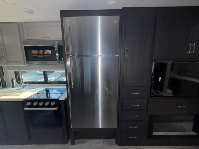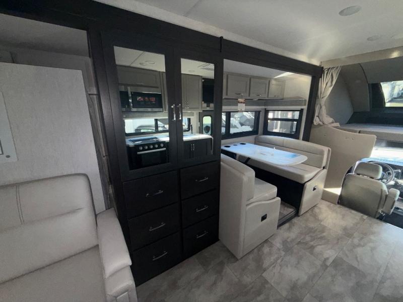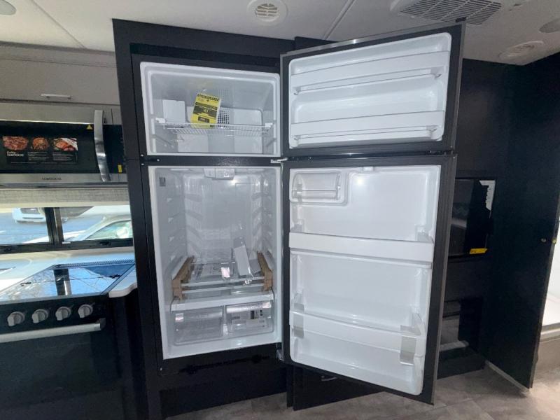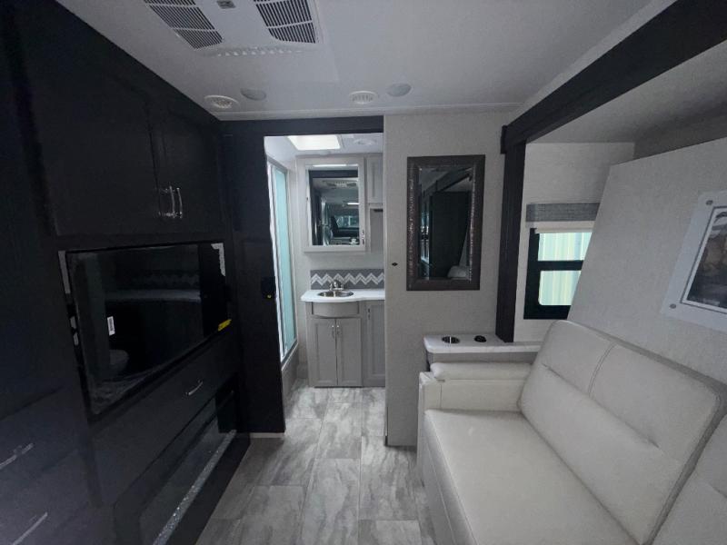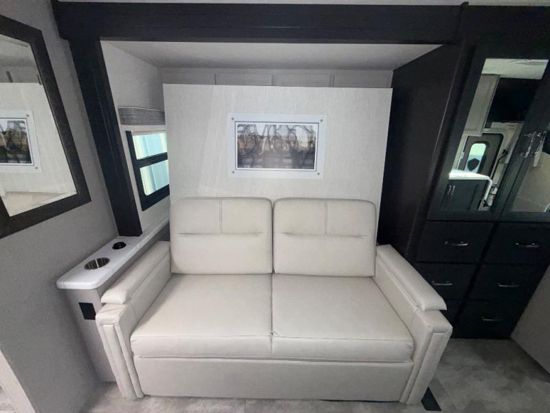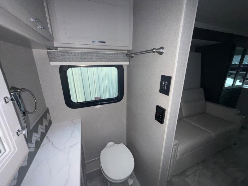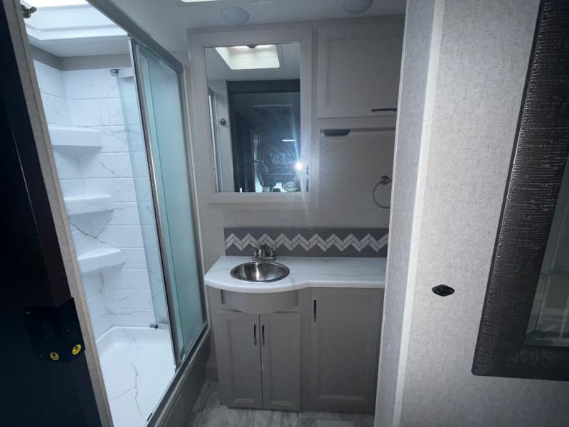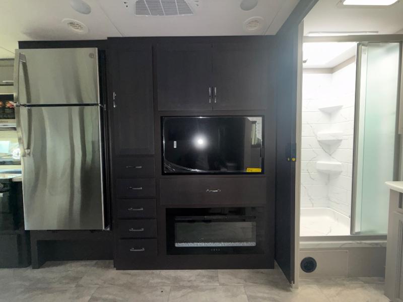 Relax in the full rear bathroom, featuring a spacious 30” x 36” shower. The living area boasts a versatile sofa with a murphy bed, perfect for guests or extra sleeping space. Cozy up by the fireplace, enjoy your favorite shows on the TV, and organize your stuff in the ample shelving and storage. The closet also provides additional space for your belongings. The kitchen is a culinary dream, equipped with a pantry, drawers, fridge, three-burner cooktop, and a microwave. Gather with family and friends at the 70” dream dinette, perfect for meals and game nights. Additional sleeping space is available in the front bunk over the cab, and when you're ready to take the party outside, enjoy your favorite shows on the exterior TV.