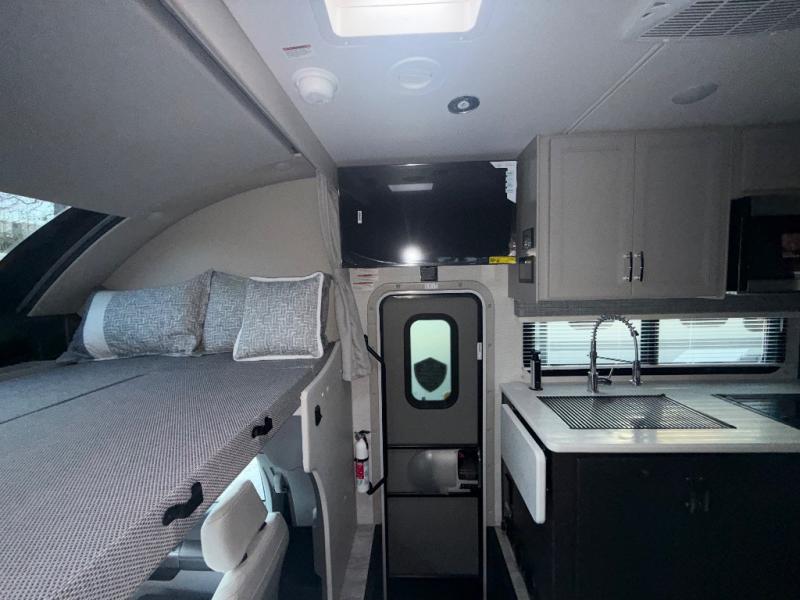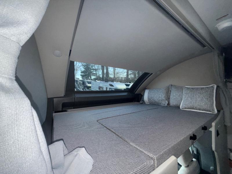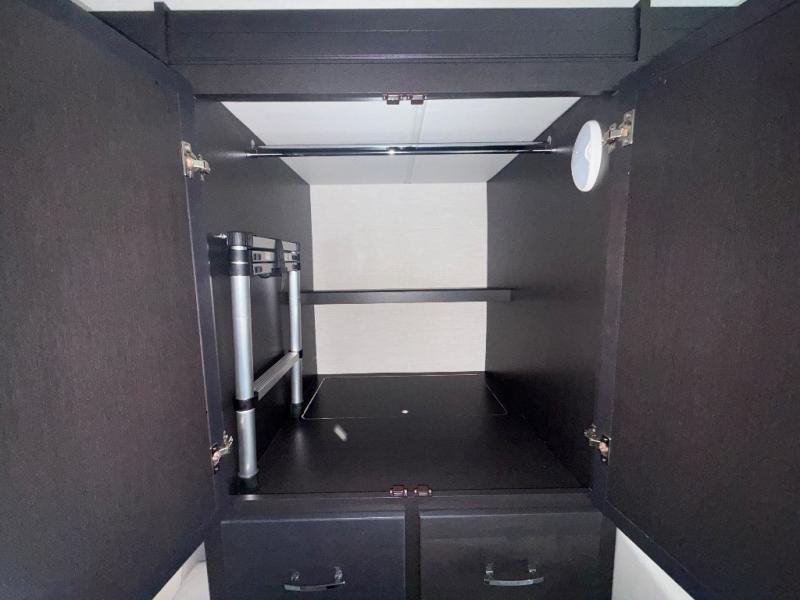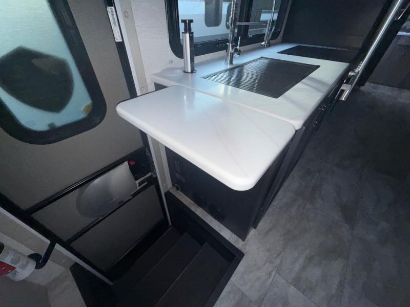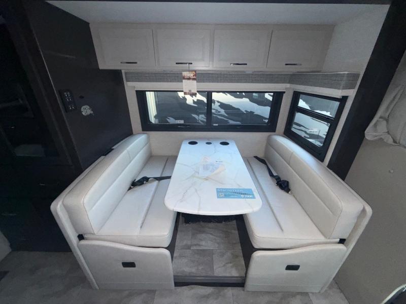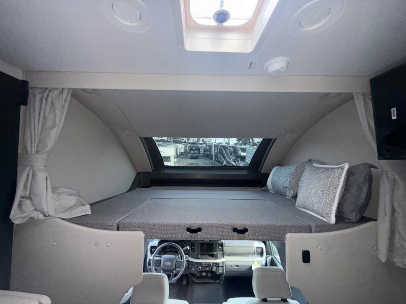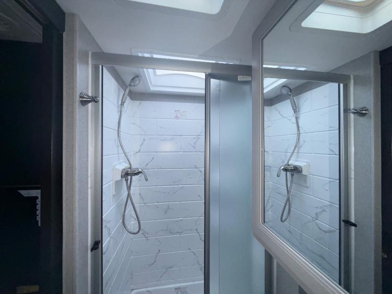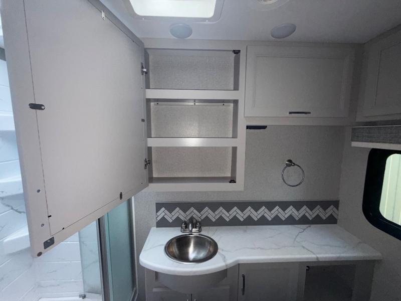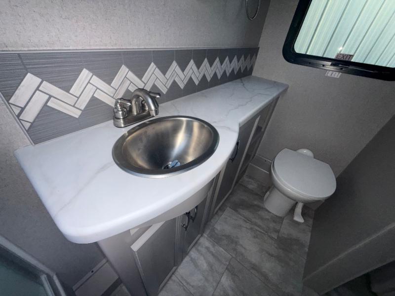 Relax in the full rear bathroom, featuring a spacious 30” x 36” shower. The living area boasts a versatile sofa with a murphy bed, perfect for guests or extra sleeping space. Cozy up by the fireplace, enjoy your favorite shows on the TV, and organize your stuff in the ample shelving and storage. The closet also provides additional space for your belongings. The kitchen is a culinary dream, equipped with a pantry, drawers, fridge, three-burner cooktop, and a microwave. Gather with family and friends at the 70” dream dinette, perfect for meals and game nights. Additional sleeping space is available in the front bunk over the cab, and when you're ready to take the party outside, enjoy your favorite shows on the exterior TV.