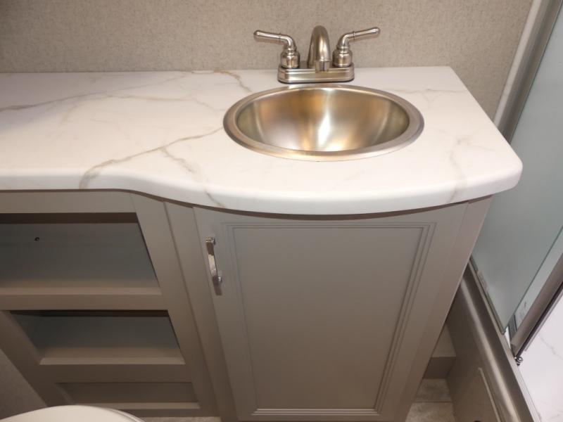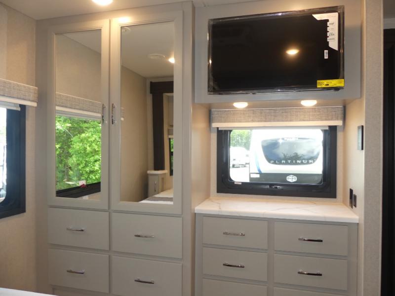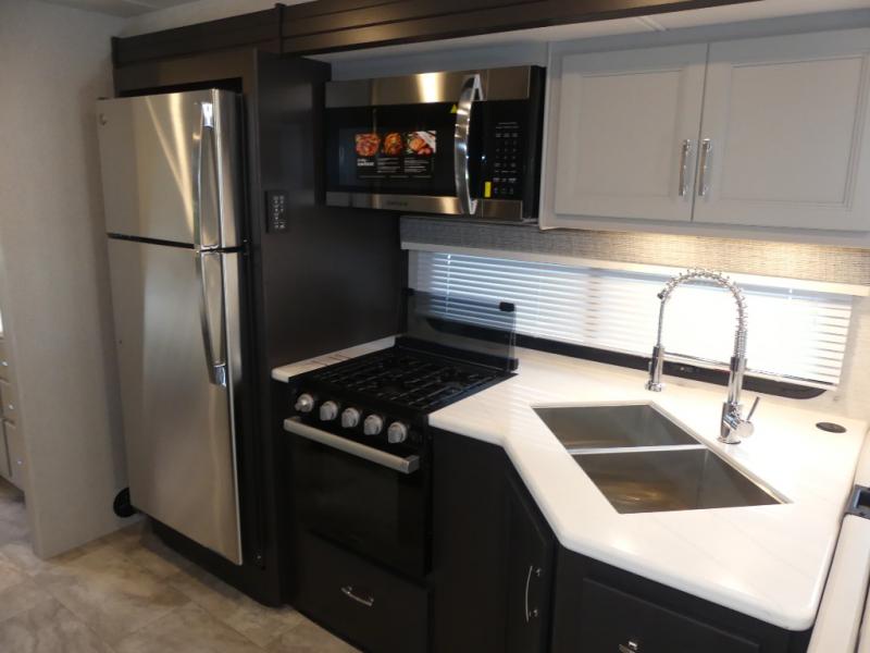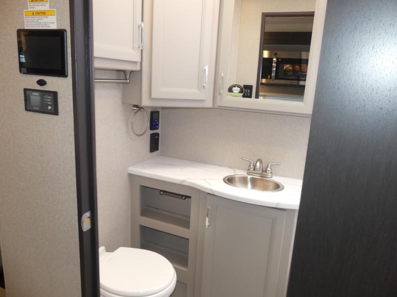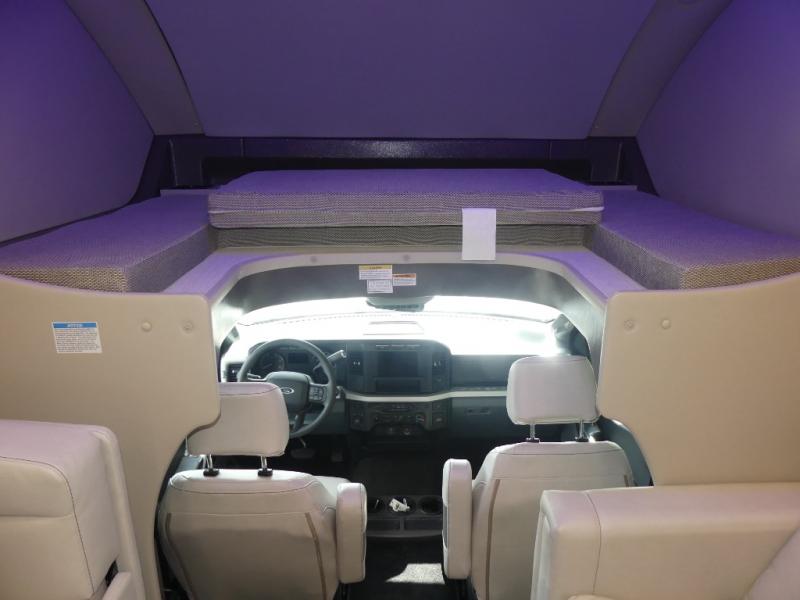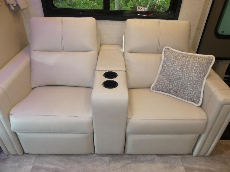 Escape to luxury with this incredible motorhome! The rear bedroom is a serene retreat, featuring a plush queen bed, spacious closet, dresser, and 32” Smart TV. A convenient full bathroom with a pantry and broom closet completes the space, perfect for freshening up on the go. The kitchen is a culinary haven, equipped with a residential refrigerator, three-burner cooktop, microwave, and 70” dream dinette where you can comfortably eat delicious meals. Relax in the 68” theater seating area, complete with 40” Smart TV, perfect for family movie nights or game days. Additional sleeping space is available in the bunk over cab, ensuring everyone has a comfortable place to rest. Create entertaining moments outside with the 32” exterior smart TV under the shade of the 14’ awning perfect for outdoor fun.