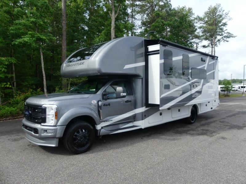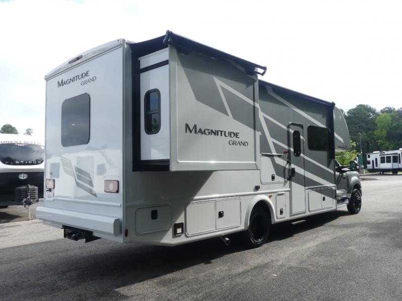 The Magnitude GRAND Super C diesel motorhomes by Thor Motor Coach are built to last, featuring Vacu-bond laminated roofs and floors with block foam insulation for unparalleled durability and climate control which ensures a comfortable and quiet living space. Stay connected and entertained on the go with the innovative sync-enhanced voice recognition communication and entertainment system. With just the sound of your voice, you can control everything from navigation to music playlists. Setting up camp has never been easier, thanks to our automatic leveling jacks with a touchpad, simply press a button and let the system do the work for you. Inside, you'll enjoy incredible interior features like a spacious 84” interior ceiling height, perfect for comfortable living, solid countertops, designer headboard, bedspread, and pillow shams. Plus you can beat the heat with the dual 13,500 BTU roof air conditioners, providing superior cooling power to keep you comfortable in even the warmest climates. Explore our motorhome collection today and discover a new standard of luxury and adventure.