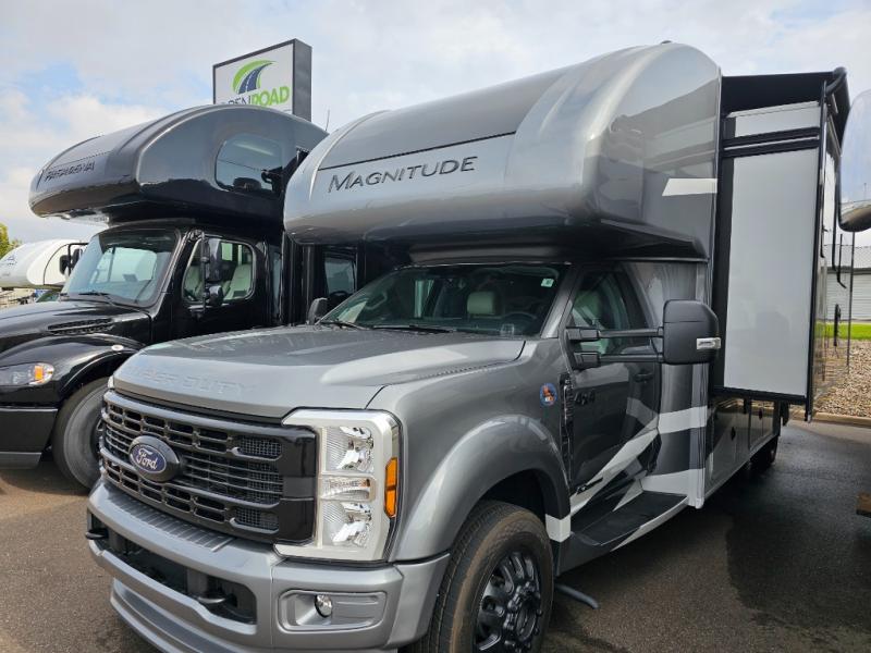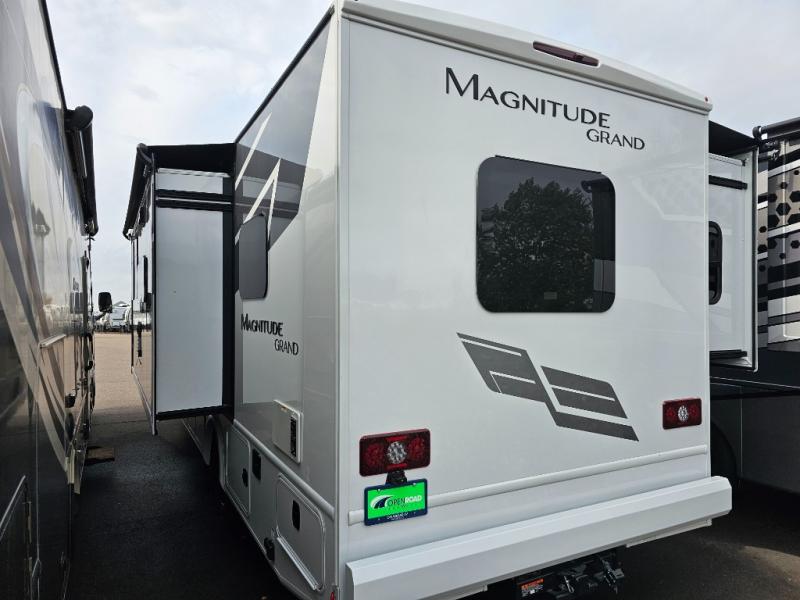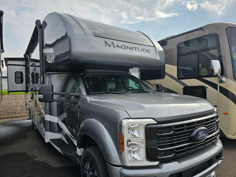 The Magnitude GRAND Super C diesel motorhomes by Thor Motor Coach are built to last, featuring Vacu-bond laminated roofs and floors with block foam insulation for unparalleled durability and climate control which ensures a comfortable and quiet living space. Stay connected and entertained on the go with the innovative sync-enhanced voice recognition communication and entertainment system. With just the sound of your voice, you can control everything from navigation to music playlists. Setting up camp has never been easier, thanks to our automatic leveling jacks with a touchpad, simply press a button and let the system do the work for you. Inside, you'll enjoy incredible interior features like a spacious 84” interior ceiling height, perfect for comfortable living, solid countertops, designer headboard, bedspread, and pillow shams. Plus you can beat the heat with the dual 13,500 BTU roof air conditioners, providing superior cooling power to keep you comfortable in even the warmest climates. Explore our motorhome collection today and discover a new standard of luxury and adventure.