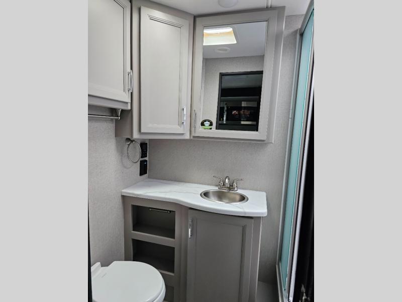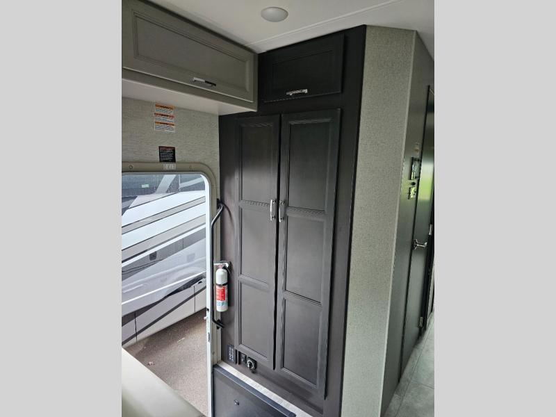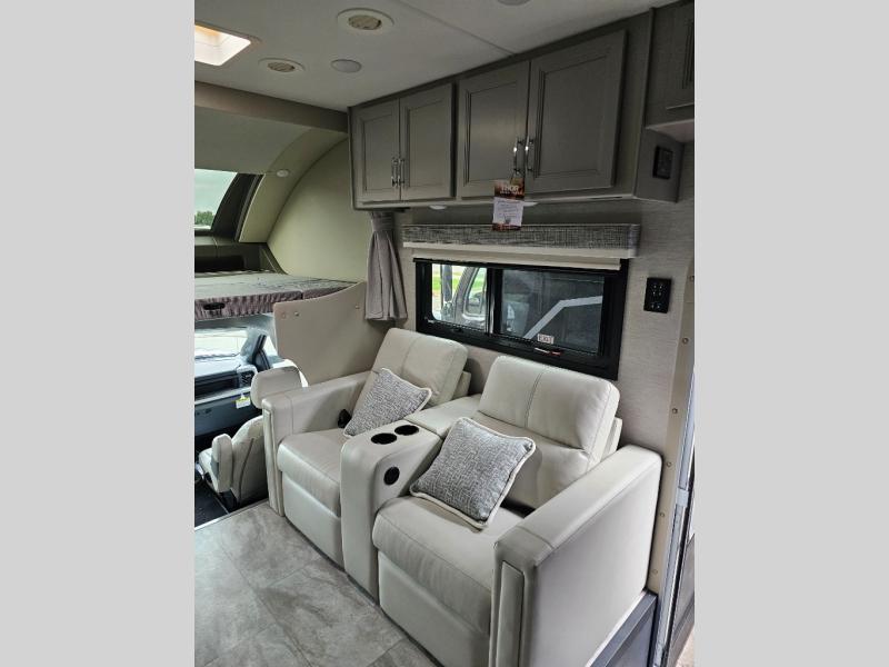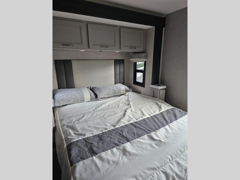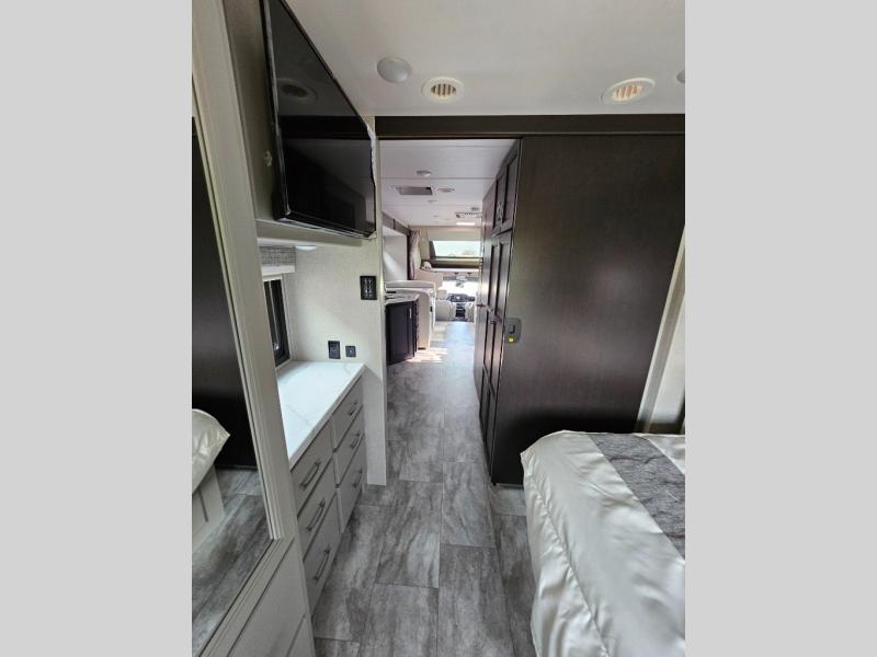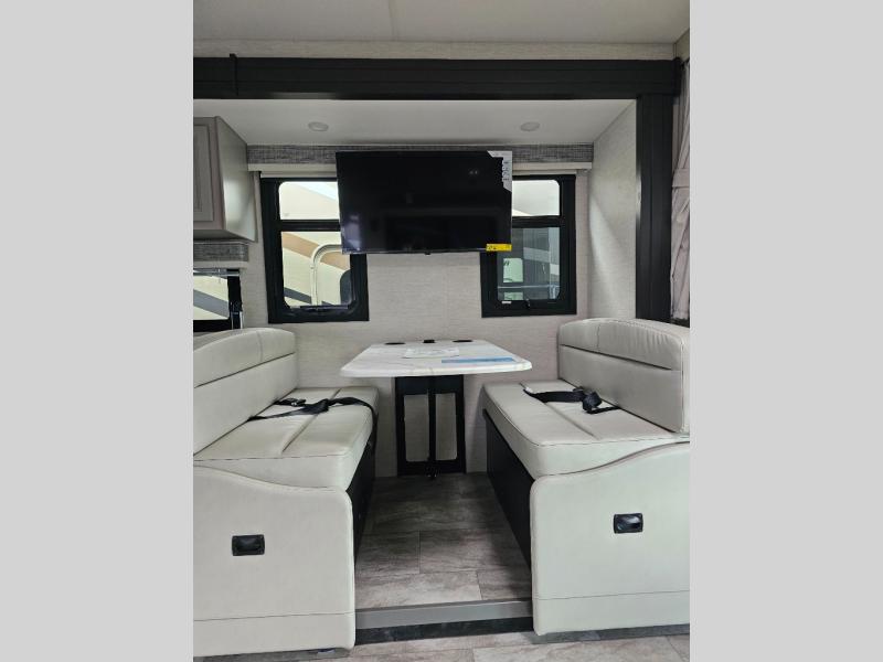 Escape to luxury with this incredible motorhome! The rear bedroom is a serene retreat, featuring a plush queen bed, spacious closet, dresser, and 32” Smart TV. A convenient full bathroom with a pantry and broom closet completes the space, perfect for freshening up on the go. The kitchen is a culinary haven, equipped with a residential refrigerator, three-burner cooktop, microwave, and 70” dream dinette where you can comfortably eat delicious meals. Relax in the 68” theater seating area, complete with 40” Smart TV, perfect for family movie nights or game days. Additional sleeping space is available in the bunk over cab, ensuring everyone has a comfortable place to rest. Create entertaining moments outside with the 32” exterior smart TV under the shade of the 14’ awning perfect for outdoor fun.