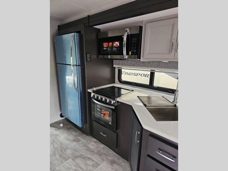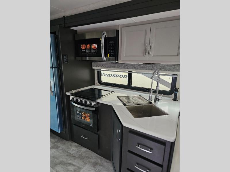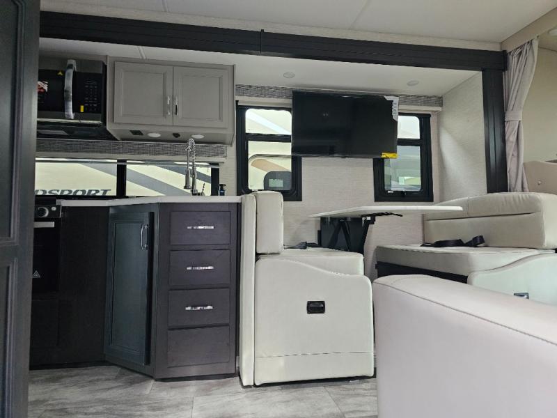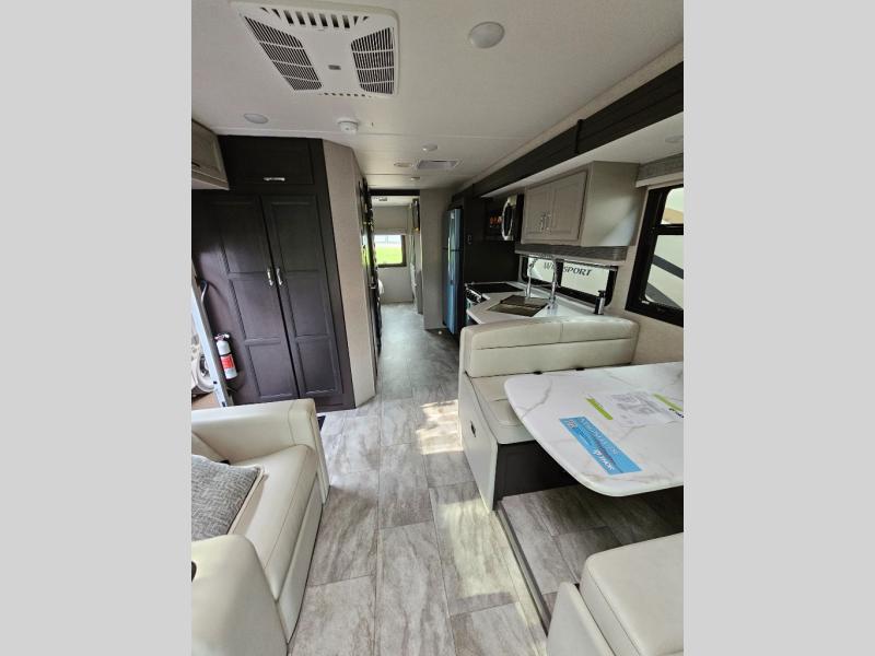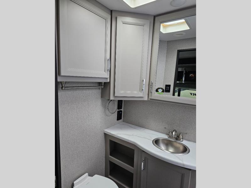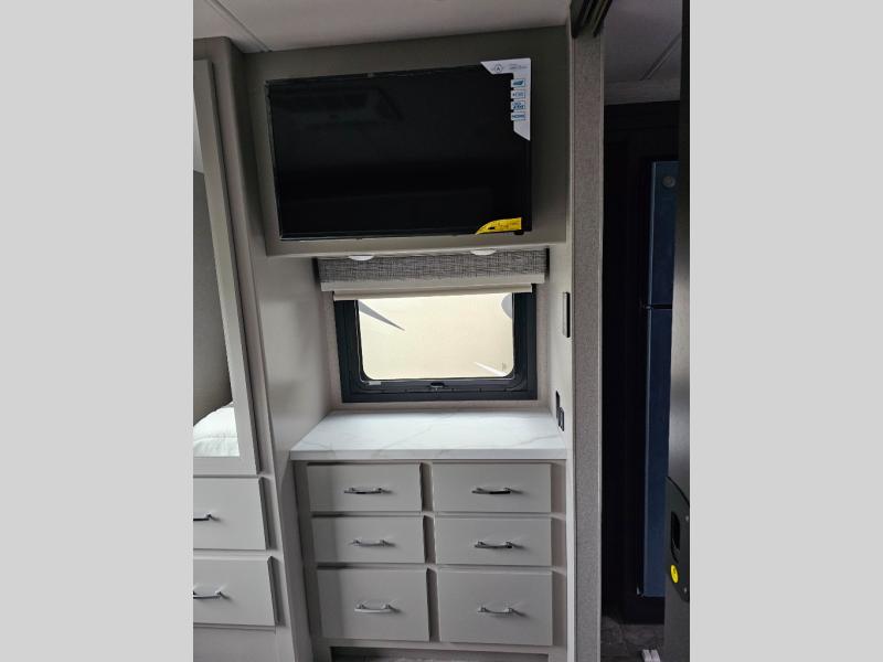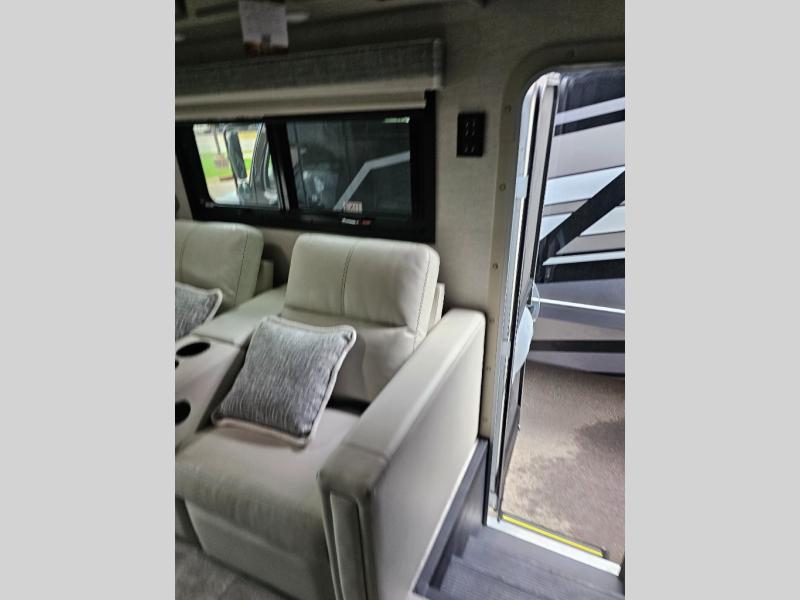 Escape to luxury with this incredible motorhome! The rear bedroom is a serene retreat, featuring a plush queen bed, spacious closet, dresser, and 32” Smart TV. A convenient full bathroom with a pantry and broom closet completes the space, perfect for freshening up on the go. The kitchen is a culinary haven, equipped with a residential refrigerator, three-burner cooktop, microwave, and 70” dream dinette where you can comfortably eat delicious meals. Relax in the 68” theater seating area, complete with 40” Smart TV, perfect for family movie nights or game days. Additional sleeping space is available in the bunk over cab, ensuring everyone has a comfortable place to rest. Create entertaining moments outside with the 32” exterior smart TV under the shade of the 14’ awning perfect for outdoor fun.