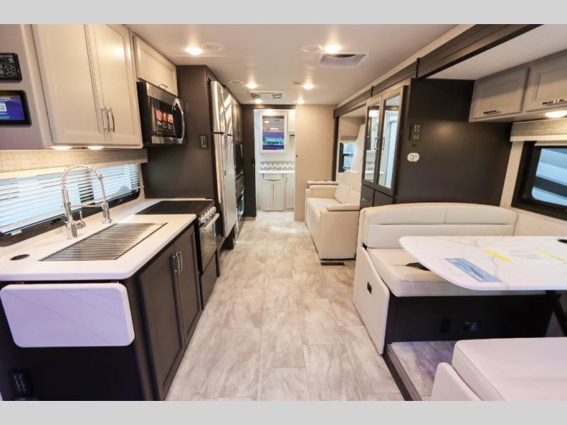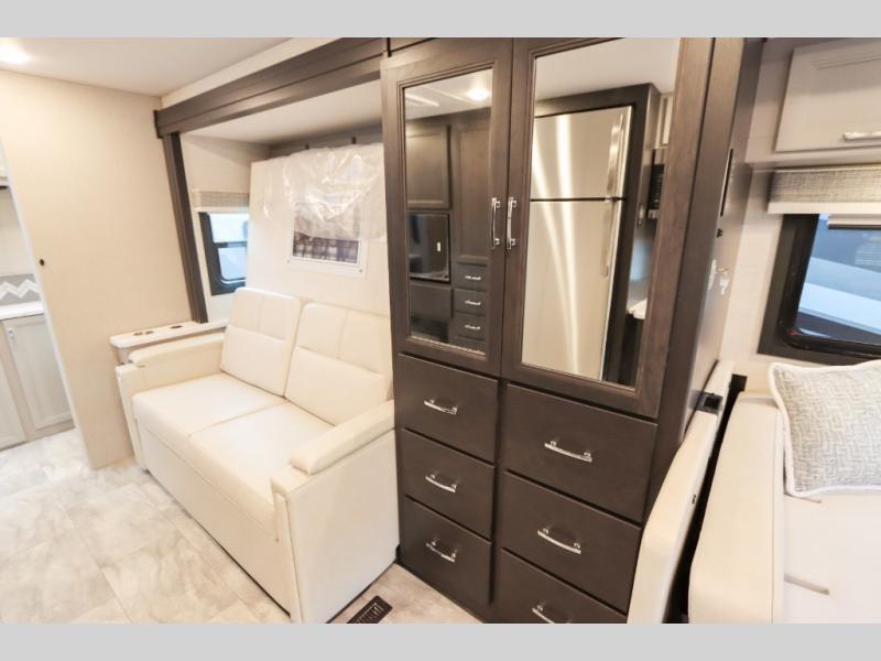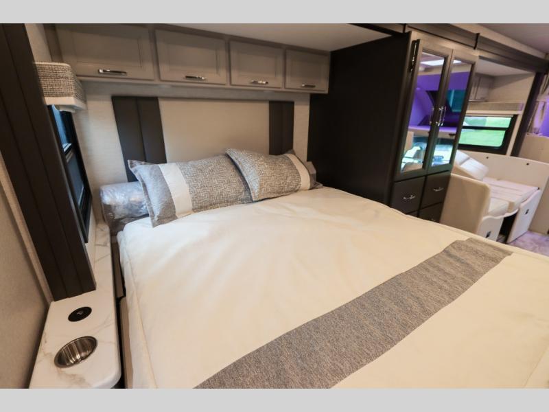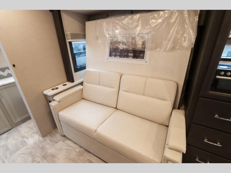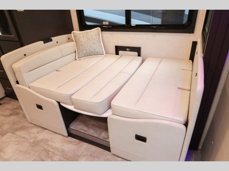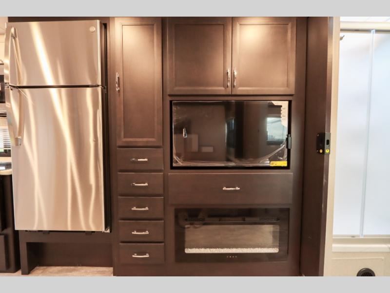 Enjoy traveling in this Magnitude Super C diesel motorhome that can easily sleep four or five! The rear bath provides a space saving sliding door, a 30" x 36" shower, a vanity with sink, and toilet. The Murphy bed allows versatility when you travel with friends providing plenty of seating and space during the day when the sofa is in place, then at night a 60" x 74" bed folds down. There is a closet in between the Murphy bed and 70" Dream Dinette which also provides seating during the day for meals or games, and can easily be transformed into sleeping space at night. Lastly, a 52" x 80" cab-over bunk that the kids will certainly be drawing straws for. And don't worry about having to stop for fast food since the kitchen includes a two-burner gas range with single induction cooktop, a convection microwave, and a stainless steel 16 cu. ft. residential refrigerator with an icemaker for your perishables! Oh, and did we mention fireplace and TV opposite the Murphy bed/sofa?!