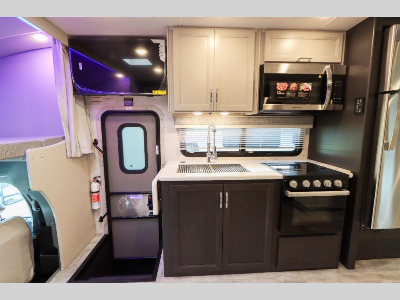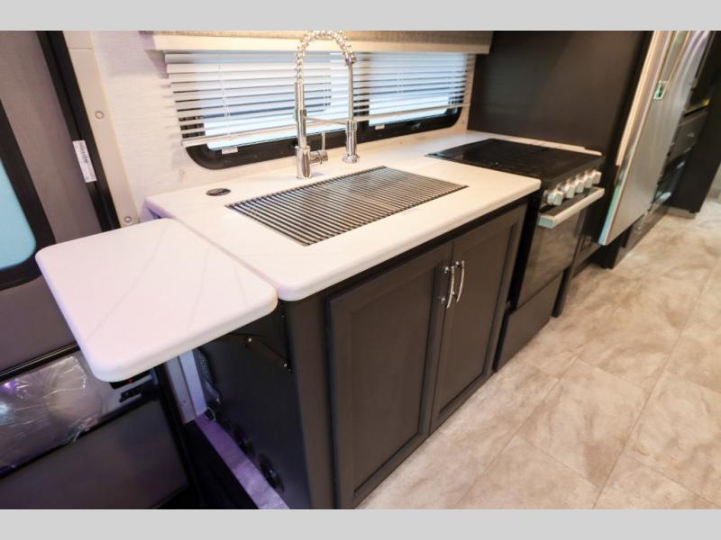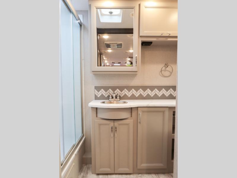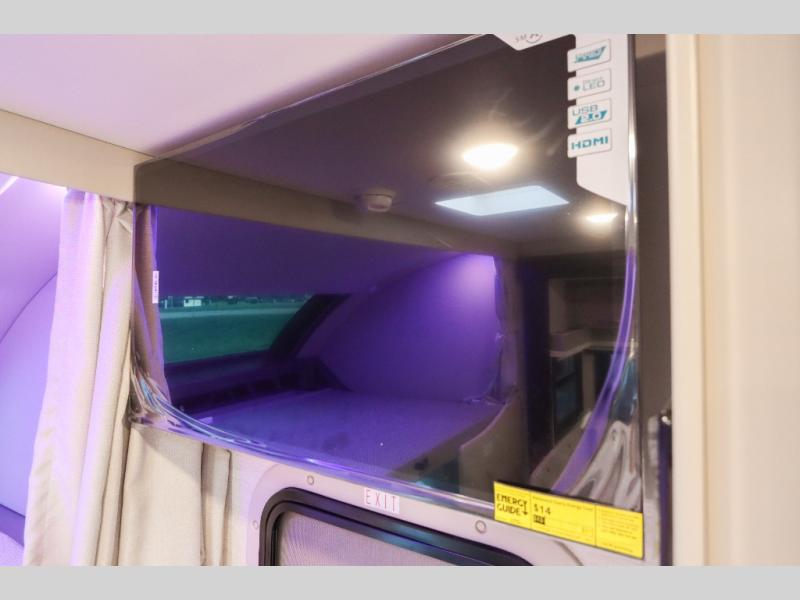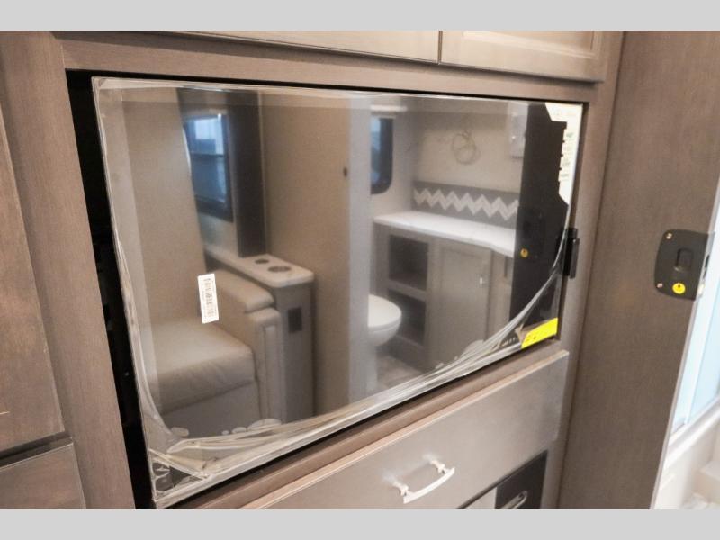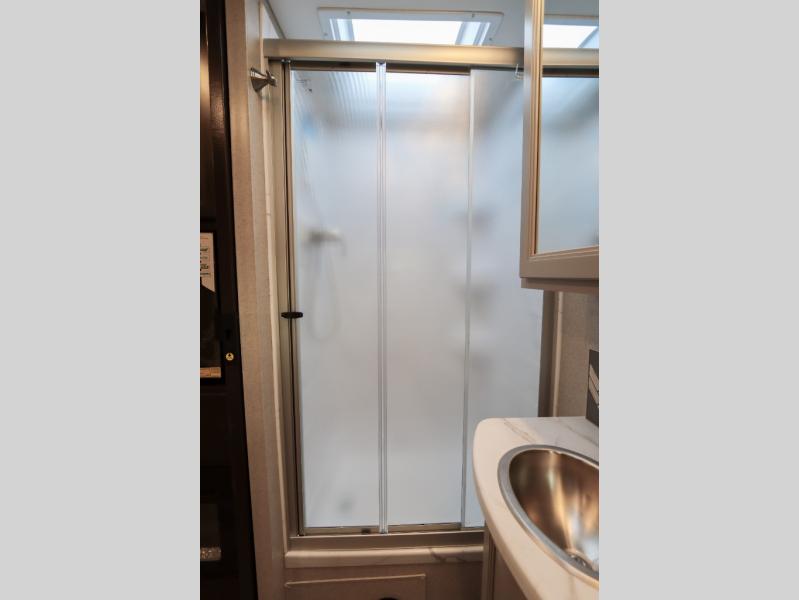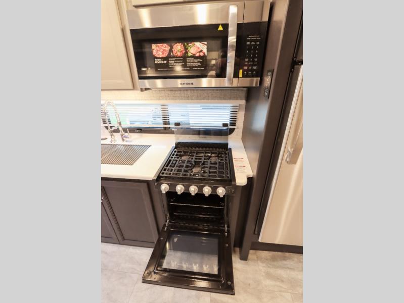 Enjoy traveling in this Magnitude Super C diesel motorhome that can easily sleep four or five! The rear bath provides a space saving sliding door, a 30" x 36" shower, a vanity with sink, and toilet. The Murphy bed allows versatility when you travel with friends providing plenty of seating and space during the day when the sofa is in place, then at night a 60" x 74" bed folds down. There is a closet in between the Murphy bed and 70" Dream Dinette which also provides seating during the day for meals or games, and can easily be transformed into sleeping space at night. Lastly, a 52" x 80" cab-over bunk that the kids will certainly be drawing straws for. And don't worry about having to stop for fast food since the kitchen includes a two-burner gas range with single induction cooktop, a convection microwave, and a stainless steel 16 cu. ft. residential refrigerator with an icemaker for your perishables! Oh, and did we mention fireplace and TV opposite the Murphy bed/sofa?!