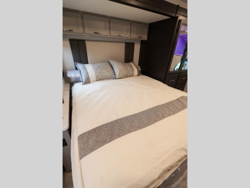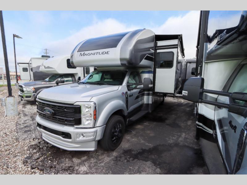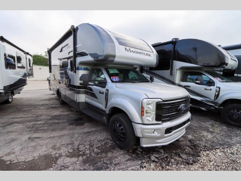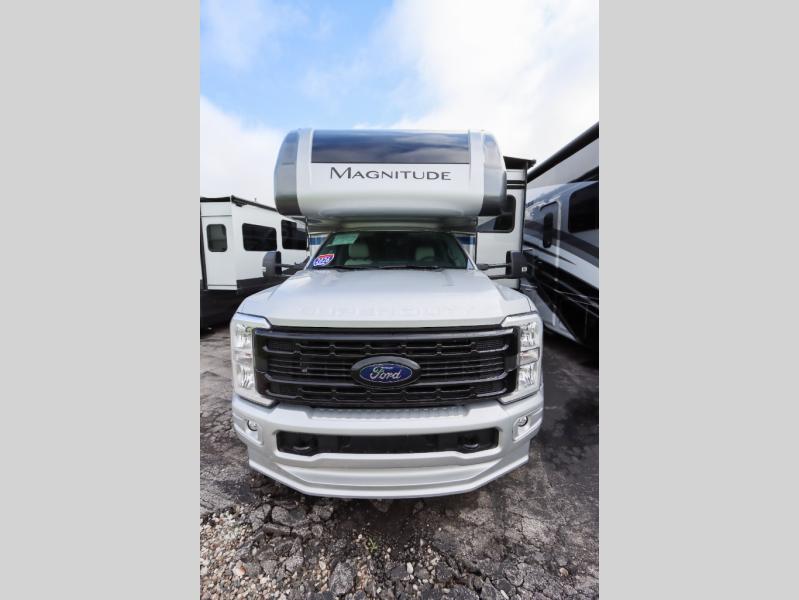 Make your journeys fantastic with the Thor Motor Coach Magnitude Super C diesel motorhome! Each model features a 4 x 4 turbo diesel engine, allowing you to tackle tough terrain! The powered sky view shade above the cab area will let you feel the sun's rays while you travel down the road, and the rearview mirror with a backup monitor, AM/FM and SiriusXM radio, and 8" color LCD touchscreen will make the drive that much easier. The 7' interior ceiling will accommodate passengers of any height, and the pop-up outlet in the kitchen will give you a convenient location to charge devices. The dual 13,500 BTU roof air conditioners will keep you cool on the hottest days in summer, and the Onan RV QD diesel generator will power your coach and all of its electrical functions. You will also find a Winegard® ConnecT™ Wi-Fi extender + 4G and a Bluetooth coach radio system in the bedroom for some extra entertainment.