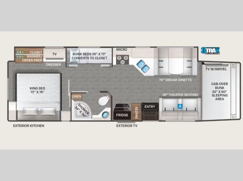 Travel in true comfort in this Omni Trail Super C diesel coach with its full-wall slide to provide maximum floor space when indoors. A residential refrigerator and complete kitchen set up inside, plus the outdoor kitchen offers you plenty of options for cooking any day you travel. Your family and/or guests will enjoy the comfortable theater seating inside along with a 70" Dream Dinette for game time and dining. You can also choose an optional sofa in place of the theater seating if you prefer. A private rear bedroom with a king-sized bed will keep you well rested while on the road, and a set of bunk beds plus a cabover bunk with a 52" x 80" sleeping area makes it easy to bring along extra family members or friends.