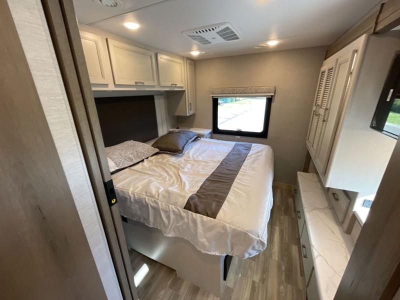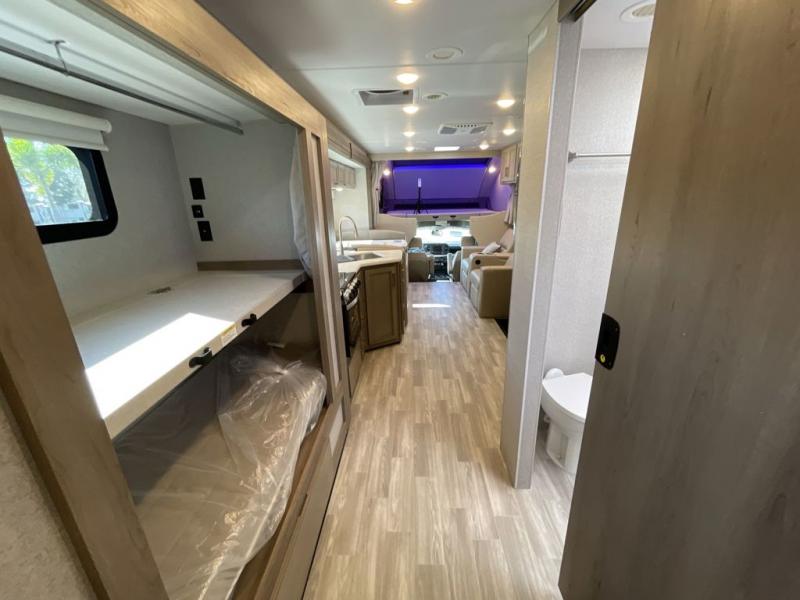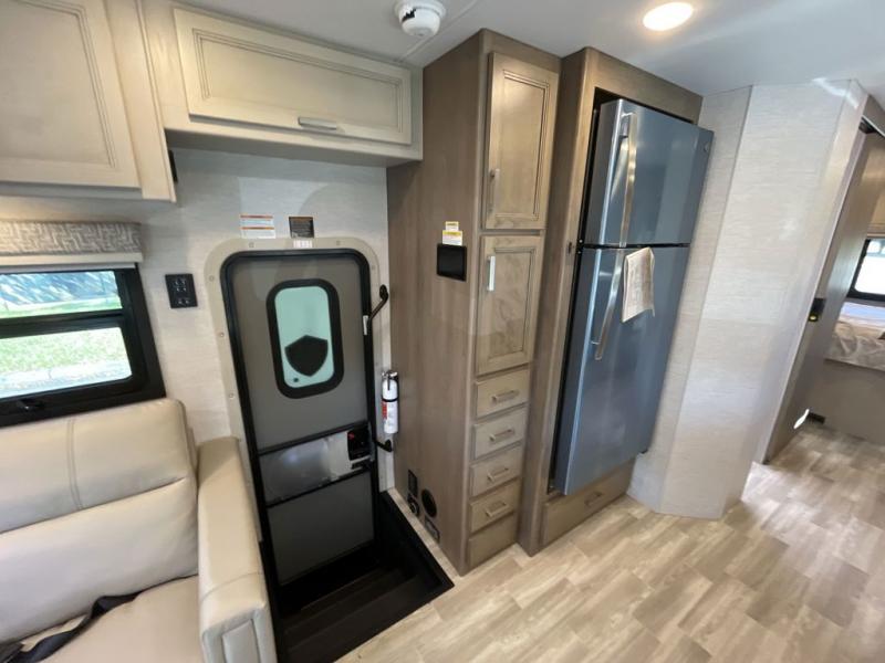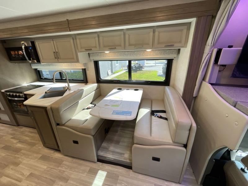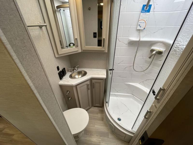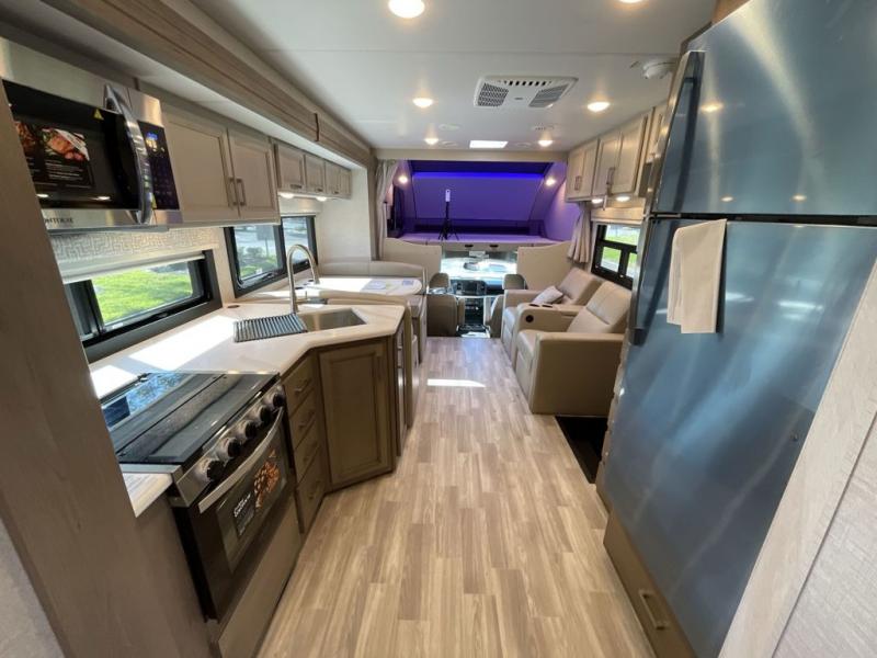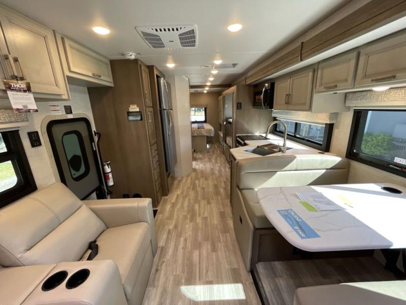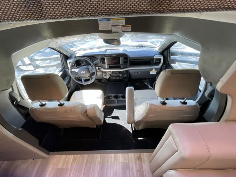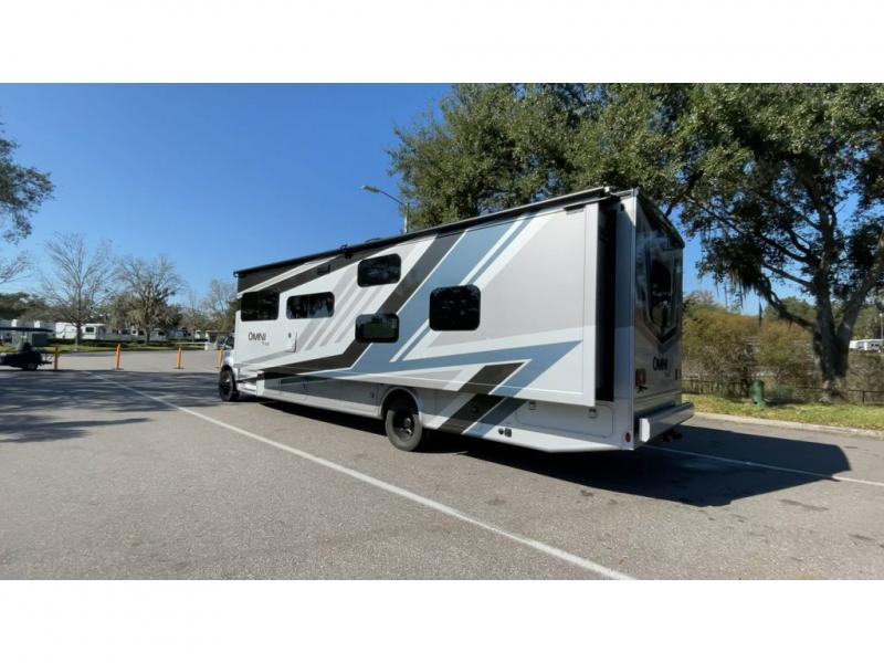 The Omni Trail Super C diesel motorhome by Thor Motor Coach starts with a durable welded tubular steel floor, vacu-bond laminated roof, walls, and floors with block foam insulation, and HD-MAX exterior with partial paint. Each model includes either a F550 or F600 Power Stroke 4 x 4 Turbo Diesel engine that will allow you to maneuver tougher terrain when the adventure calls for it. The cockpit is every captain's dream with its power adjustable driver's seat, side view camera system, heated remote exterior mirrors, and more. You can control all of your coach's functions with the RapidCamp+ multiplex wiring control system, and the Winegard ConnecT Wi-Fi extender with 5G will allow you to stay in touch with the outside world as you travel. Each model includes residential linoleum throughout, Leatherette furniture, solid surface countertops in the kitchen, and a glass shower door for that added touch of luxury. Come see all the other great features the Omni Trail Super C diesel motorhome has to offer!