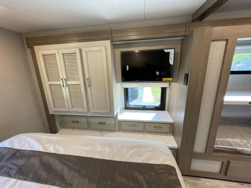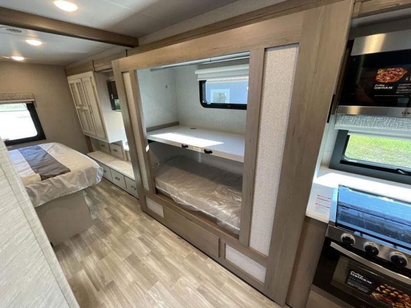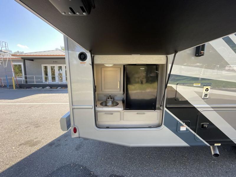 Travel in true comfort in this Omni Trail Super C diesel coach with its full-wall slide to provide maximum floor space when indoors. A residential refrigerator and complete kitchen set up inside, plus the outdoor kitchen offers you plenty of options for cooking any day you travel. Your family and/or guests will enjoy the comfortable theater seating inside along with a 70" Dream Dinette for game time and dining. You can also choose an optional sofa in place of the theater seating if you prefer. A private rear bedroom with a king-sized bed will keep you well rested while on the road, and a set of bunk beds plus a cabover bunk with a 52" x 80" sleeping area makes it easy to bring along extra family members or friends.