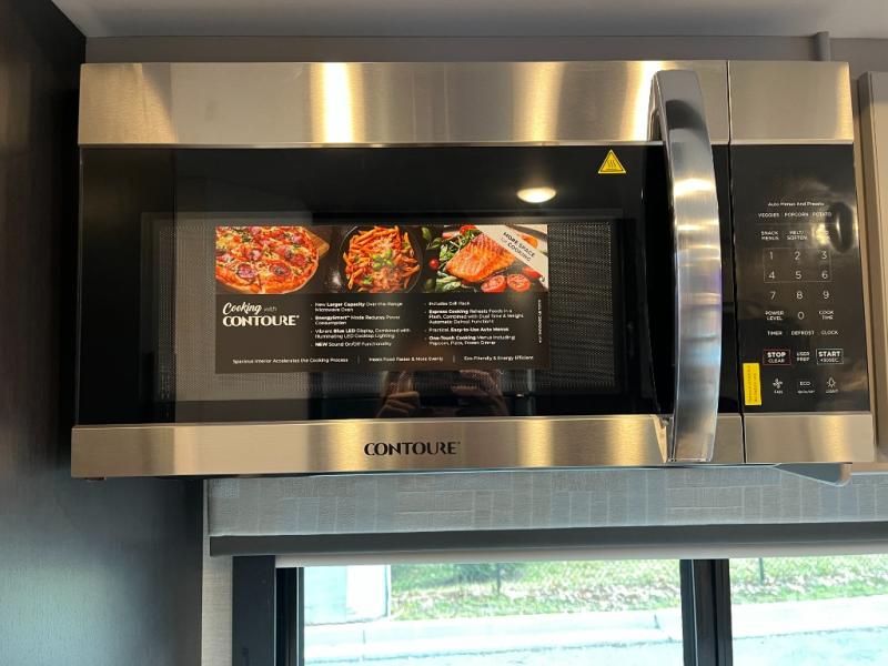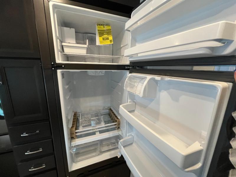 Cook with ease in a functional, residential-style kitchen featuring a large refrigerator, cooktop, convection microwave, and generous counter space. Smart storage keeps cookware and essentials organized and within reach.
