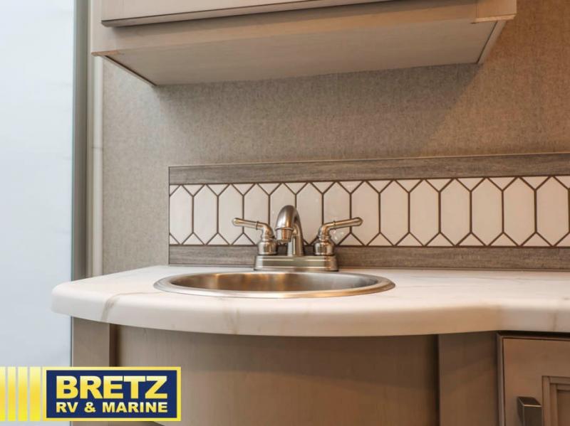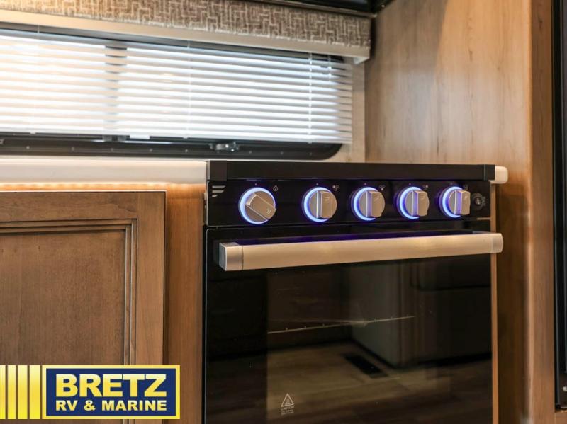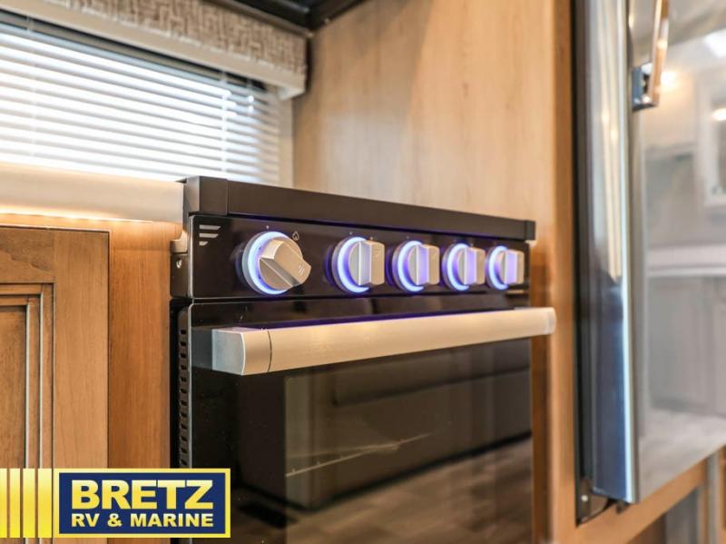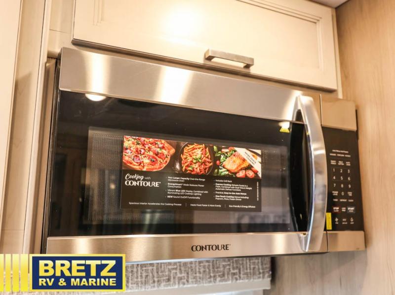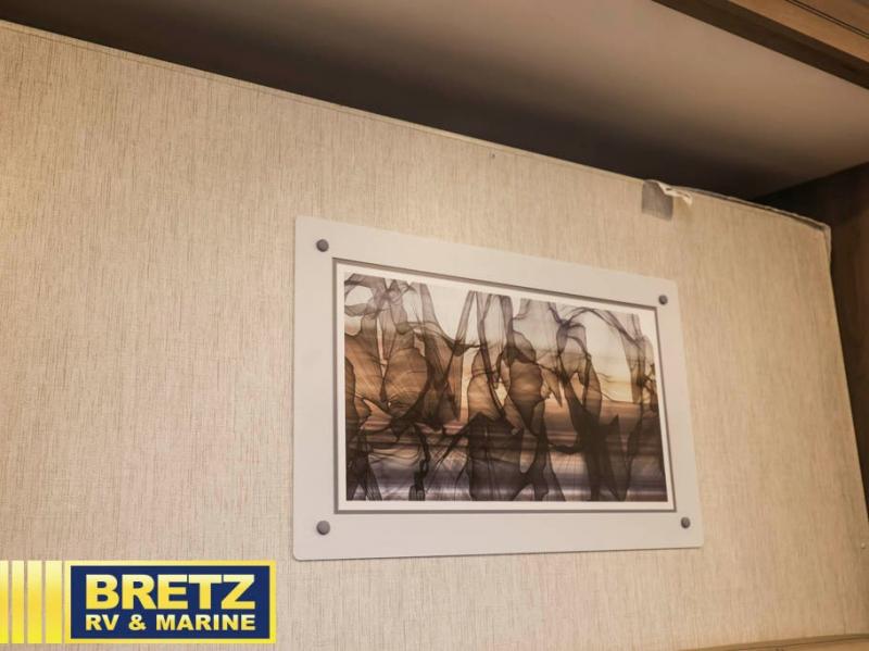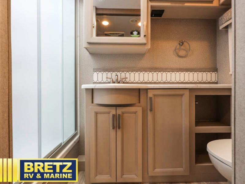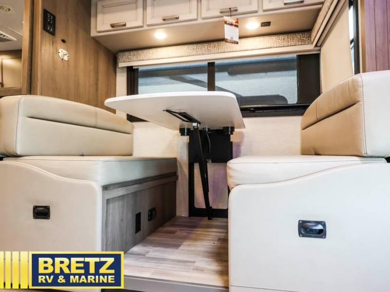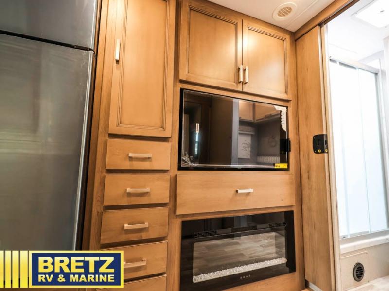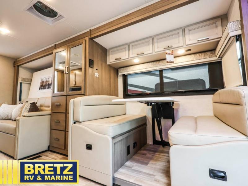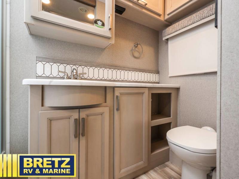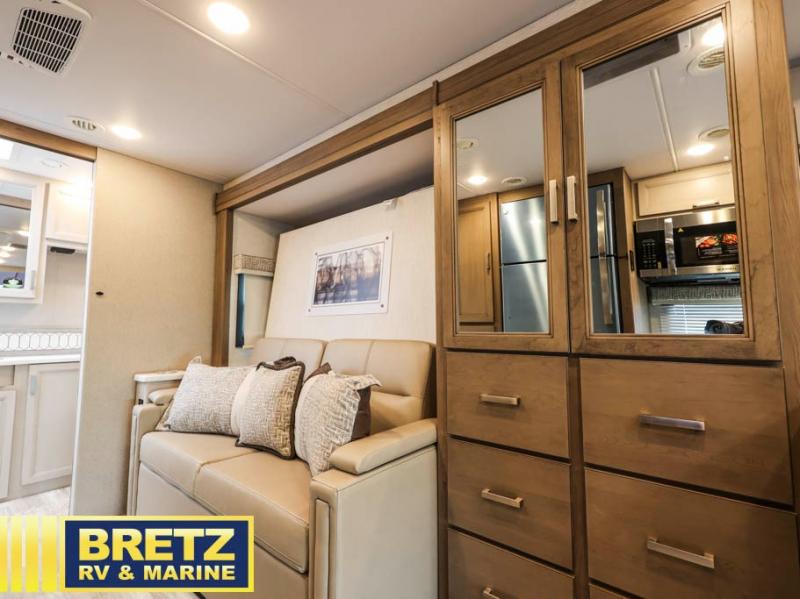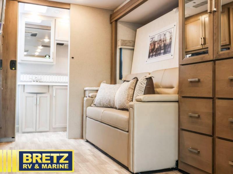 Pack your bags and experience a trip of a lifetime in this motorhome! The sofa with a 60" x 74" Murphy bed offers the versatility of a seating space during the day and a sleeping space at night. You also have a 52" x 80" bunk over cab for added sleeping or storage space. Freshen up after a long day of traveling in the full rear bathroom which has a 30" x 36" shower and plenty of countertop space to set your belongings. After the chef has prepared a delicious home cooked meal in the fully equipped kitchen, you can comfortably enjoy it at the 70" Dream Dinette which can also transform into a sleeping space. Across from the sofa is a fireplace with a TV and shelving/storage, plus you even have an exterior TV for a relaxing evening watching your favorite movies!
