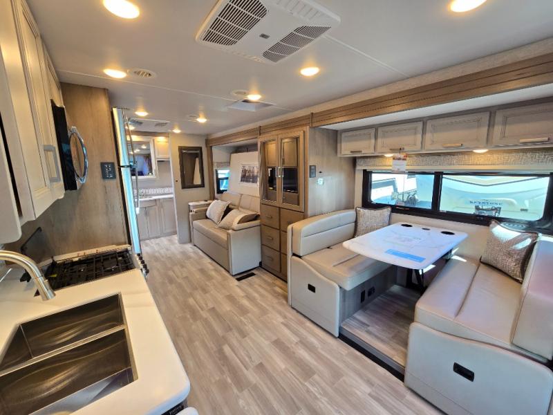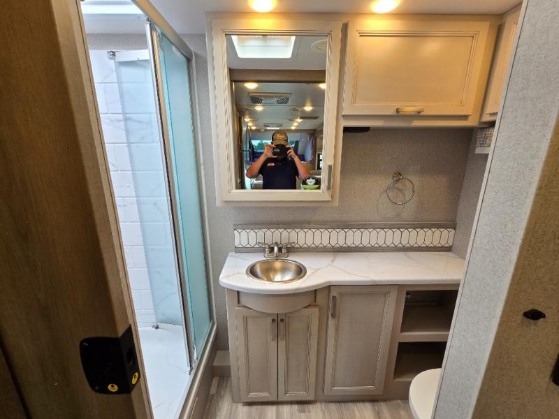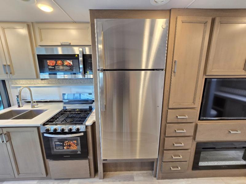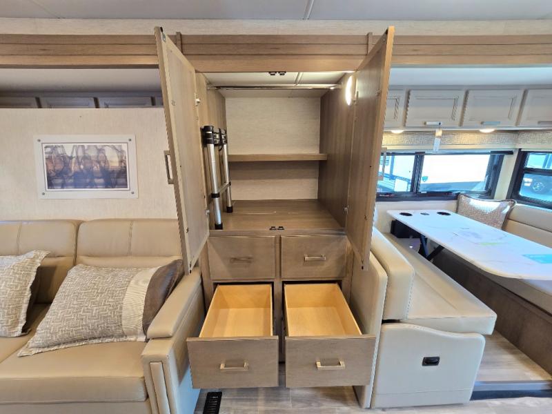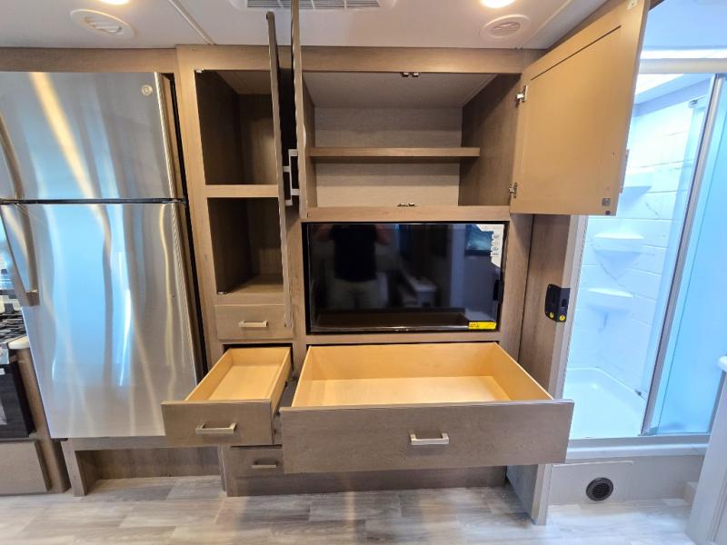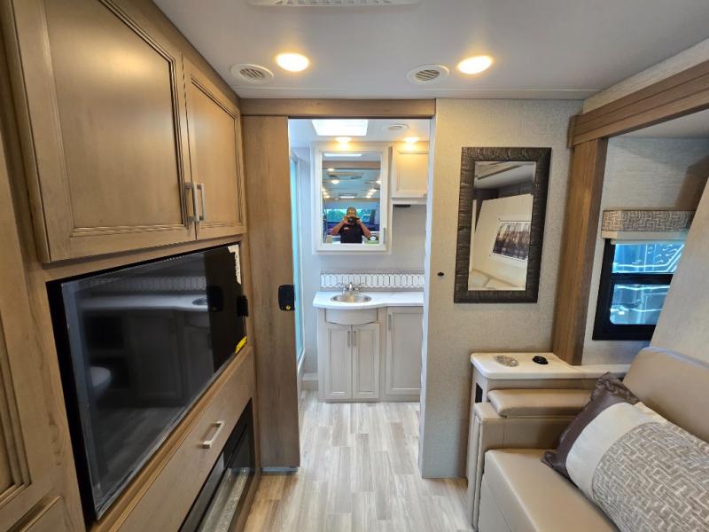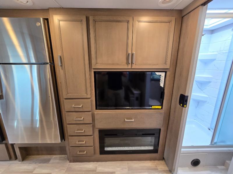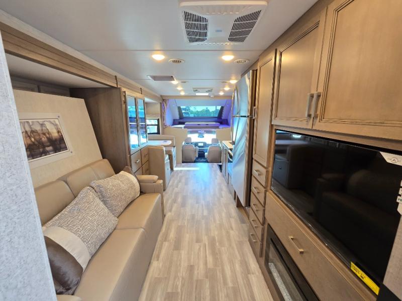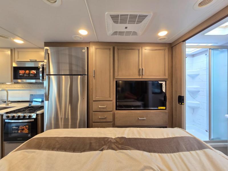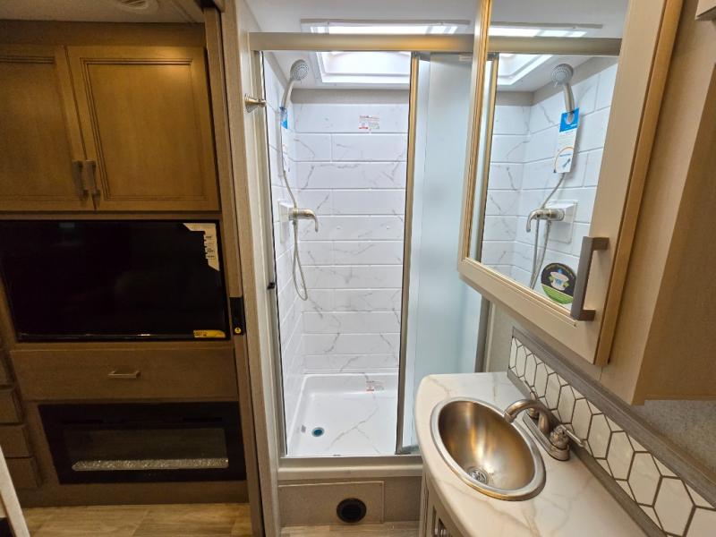 Pack your bags and experience a trip of a lifetime in this motorhome! The sofa with a 60" x 74" Murphy bed offers the versatility of a seating space during the day and a sleeping space at night. You also have a 52" x 80" bunk over cab for added sleeping or storage space. Freshen up after a long day of traveling in the full rear bathroom which has a 30" x 36" shower and plenty of countertop space to set your belongings. After the chef has prepared a delicious home cooked meal in the fully equipped kitchen, you can comfortably enjoy it at the 70" Dream Dinette which can also transform into a sleeping space. Across from the sofa is a fireplace with a TV and shelving/storage, plus you even have an exterior TV for a relaxing evening watching your favorite movies!