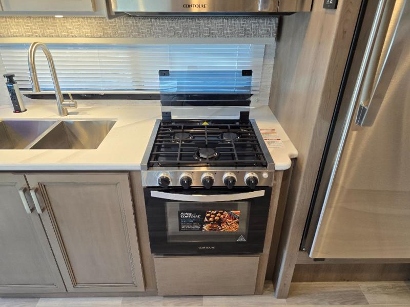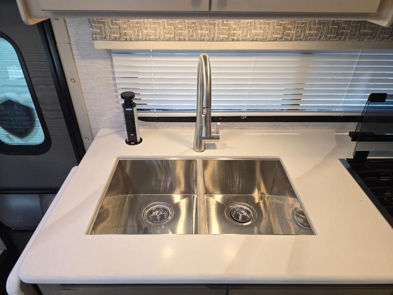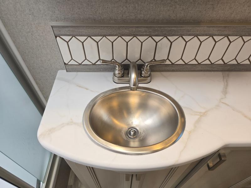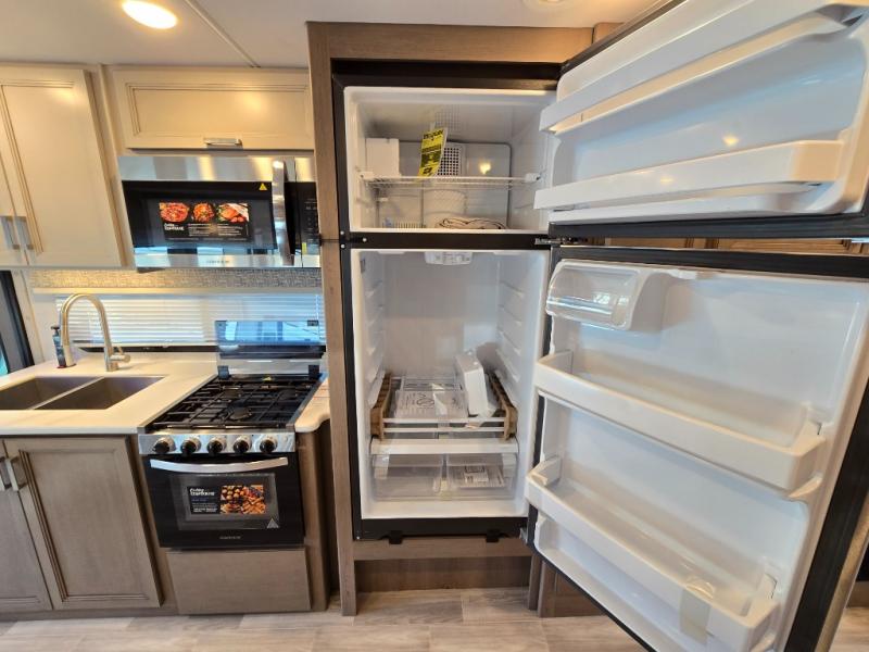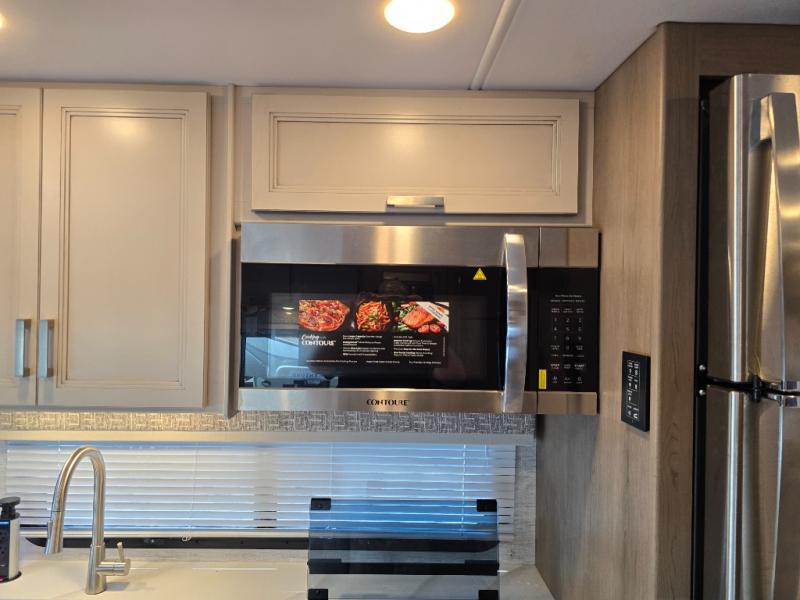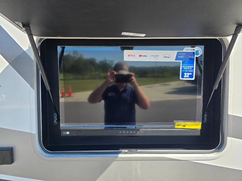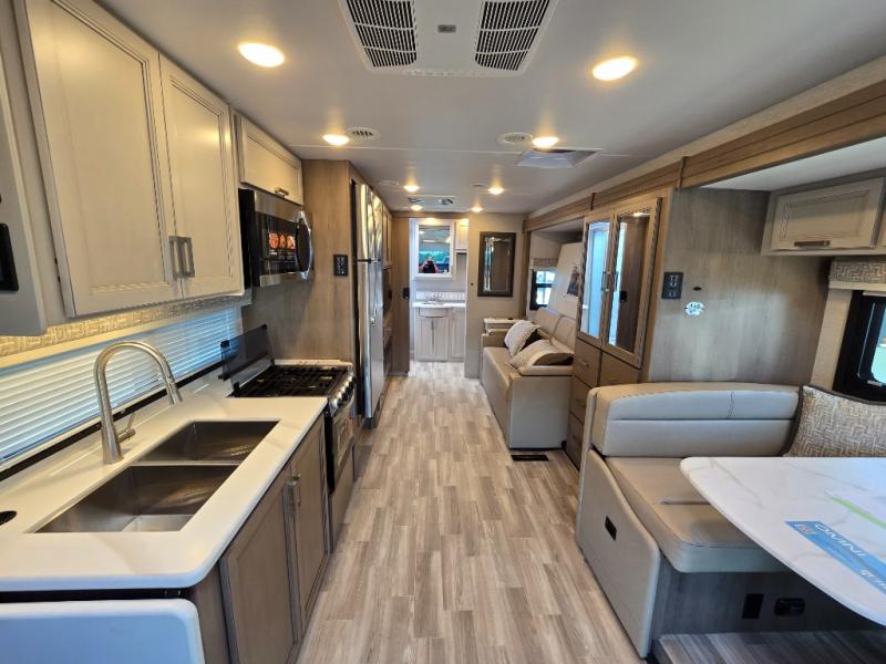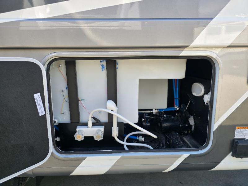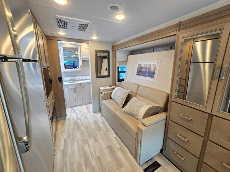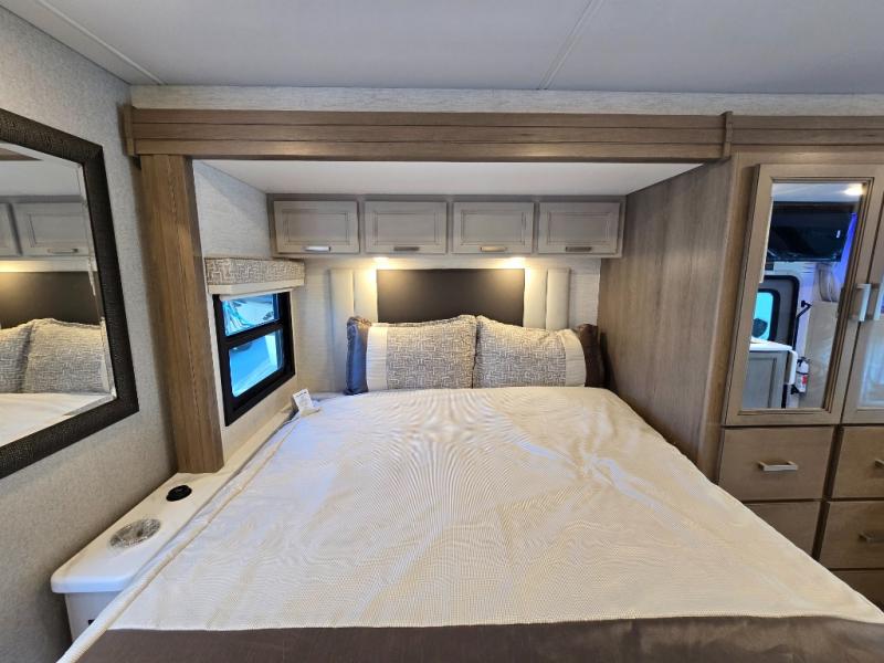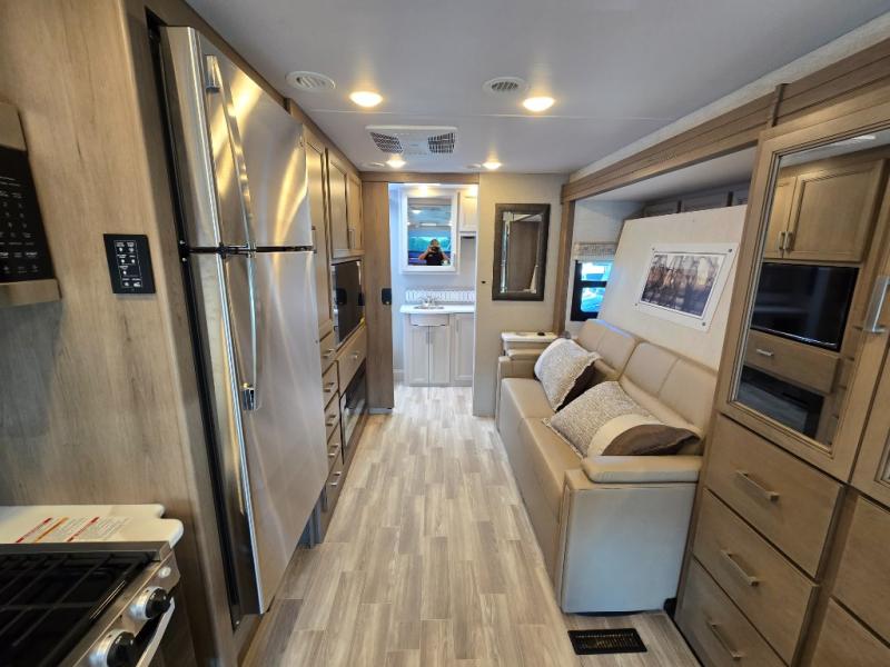 Pack your bags and experience a trip of a lifetime in this motorhome! The sofa with a 60" x 74" Murphy bed offers the versatility of a seating space during the day and a sleeping space at night. You also have a 52" x 80" bunk over cab for added sleeping or storage space. Freshen up after a long day of traveling in the full rear bathroom which has a 30" x 36" shower and plenty of countertop space to set your belongings. After the chef has prepared a delicious home cooked meal in the fully equipped kitchen, you can comfortably enjoy it at the 70" Dream Dinette which can also transform into a sleeping space. Across from the sofa is a fireplace with a TV and shelving/storage, plus you even have an exterior TV for a relaxing evening watching your favorite movies!