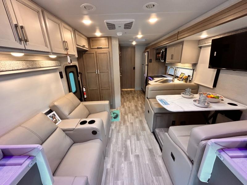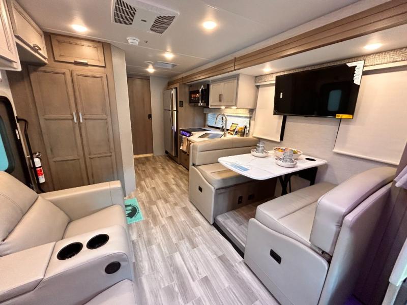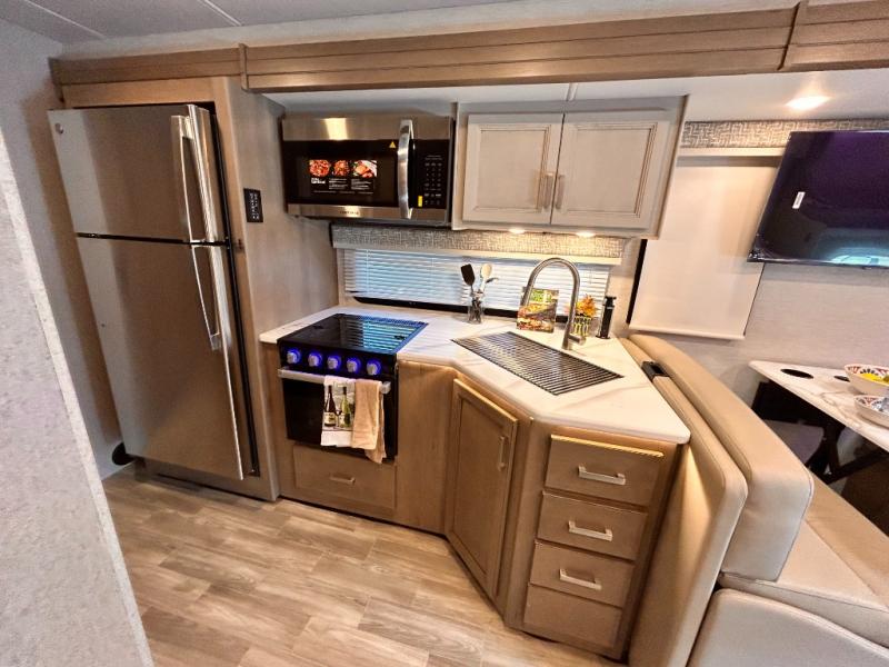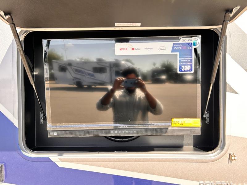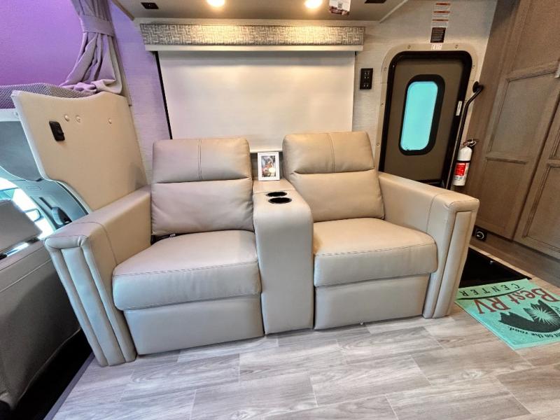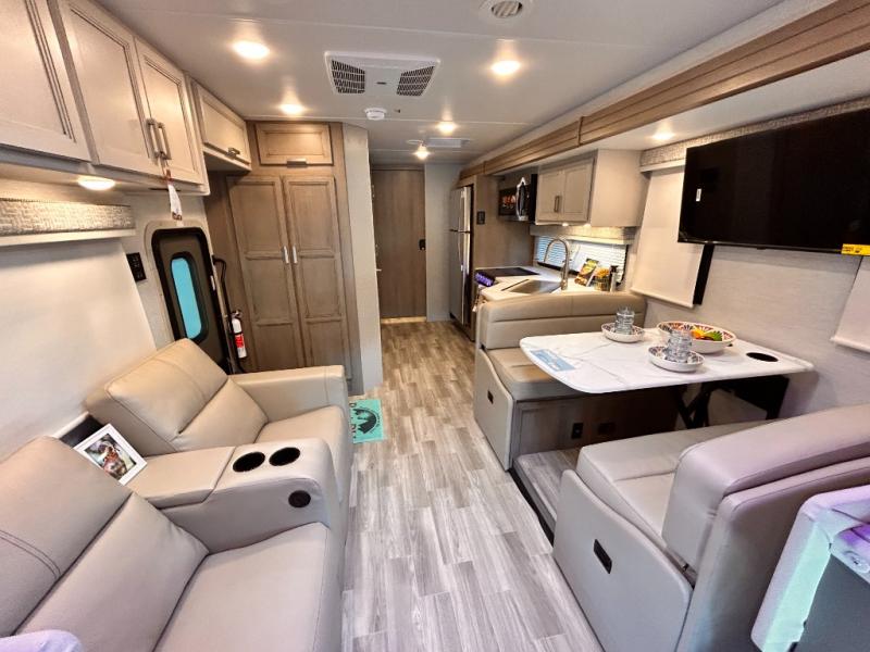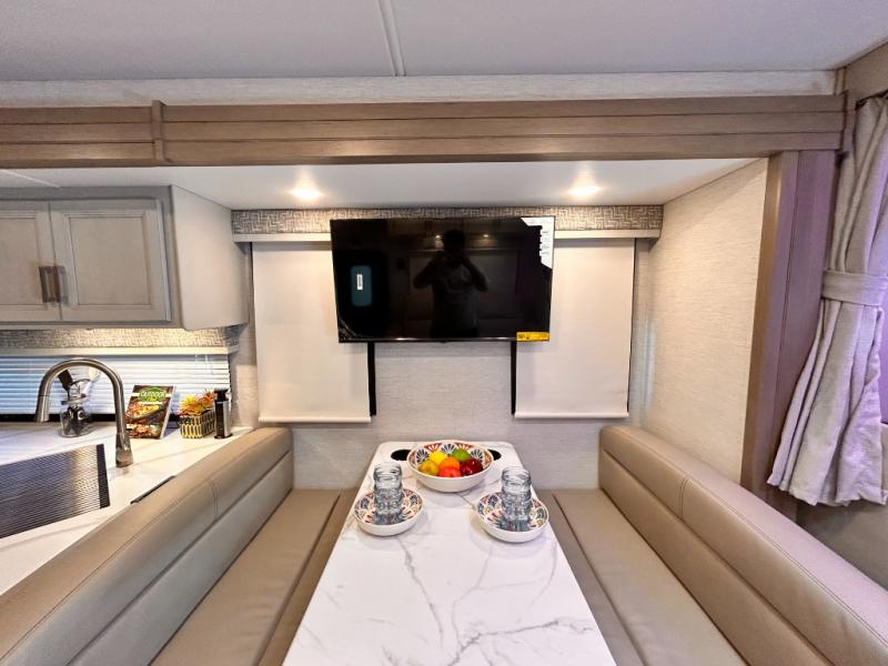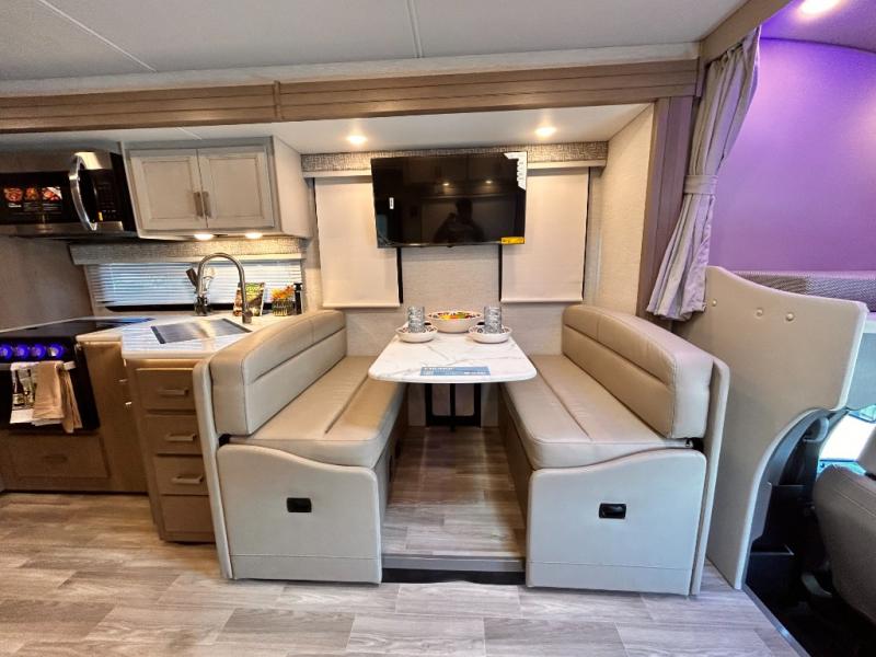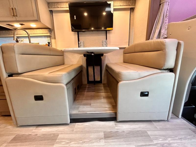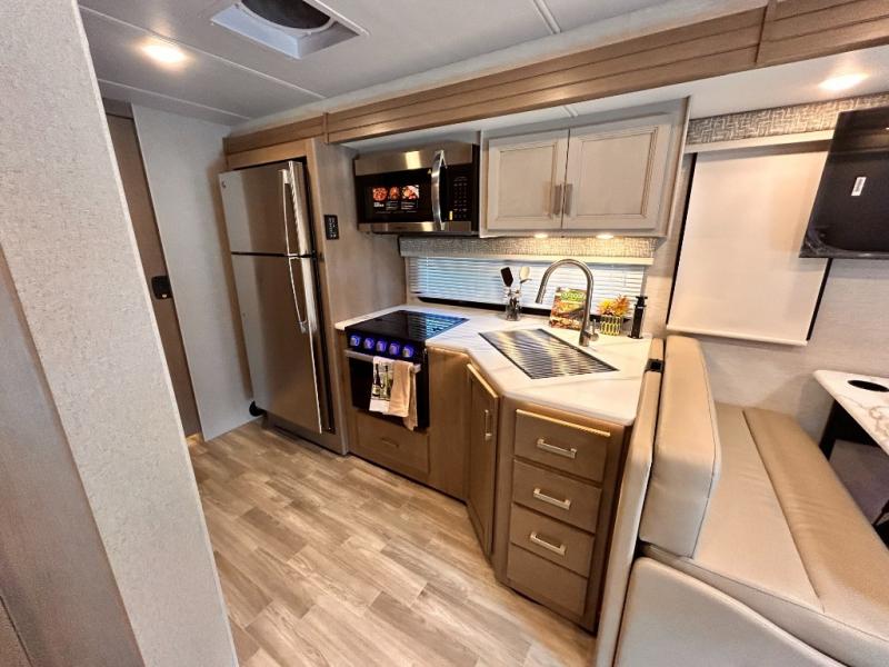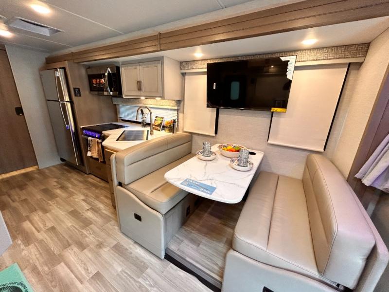 If you've been wanting to travel the country in style, now is the time with this motorhome that can sleep five people each night. The 40" living room Smart TV is directly across from the theater seating for easy viewing, plus there is a 32" bedroom Smart TV and an 32" exterior Smart TV for all your entertainment needs. The Dream Dinette will be the perfect place to enjoy breakfast each morning as you plan out your day, or you may just want to sit at the picnic table under the 14' power awning. This model includes a mid-ship full bath with a shower skylight that will not only provide more natural light, but will give you more head room as you wash up. The rear private bedroom will feel just like home with its 60" x 75" queen bed slide out, plus there is a wardrobe to keep your clothes tidy!