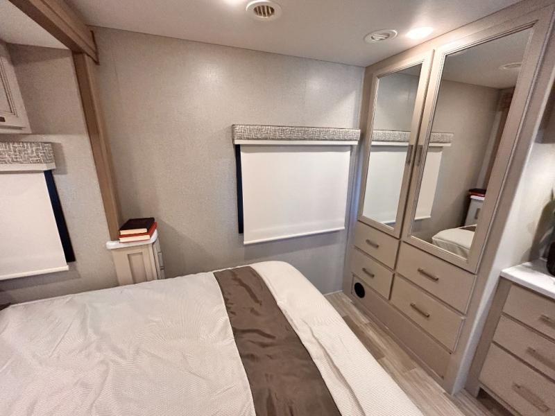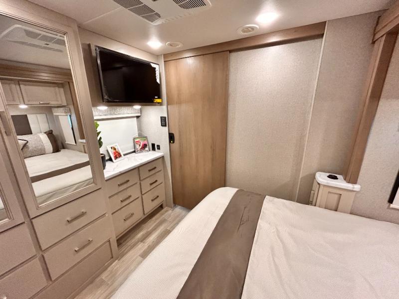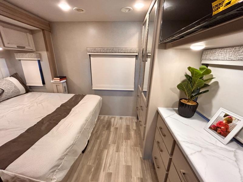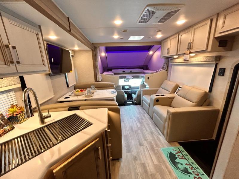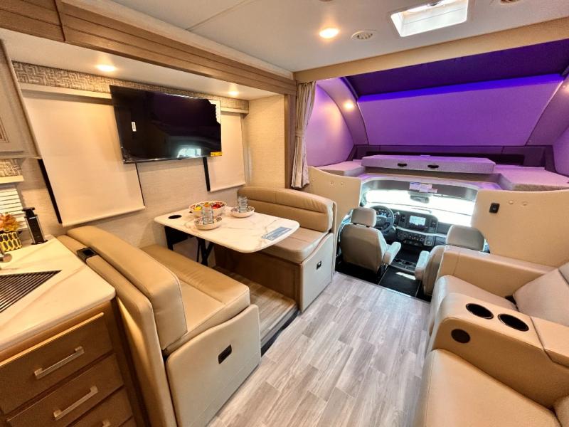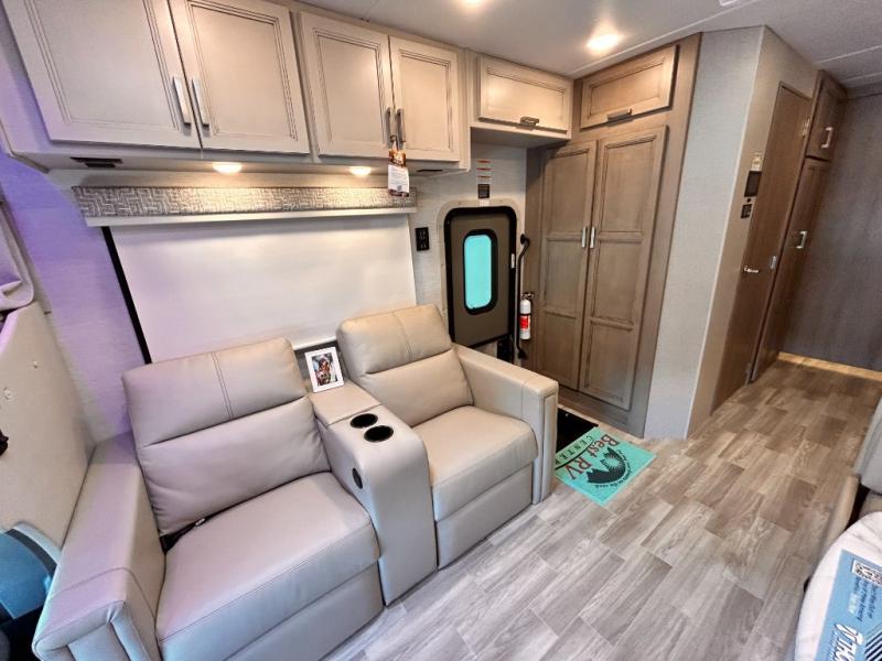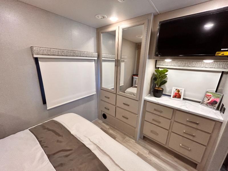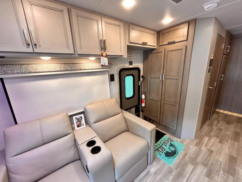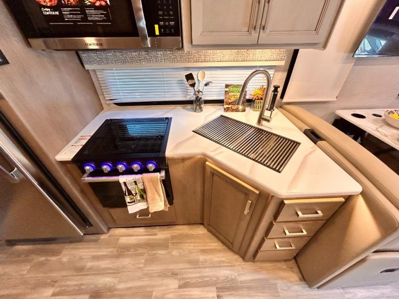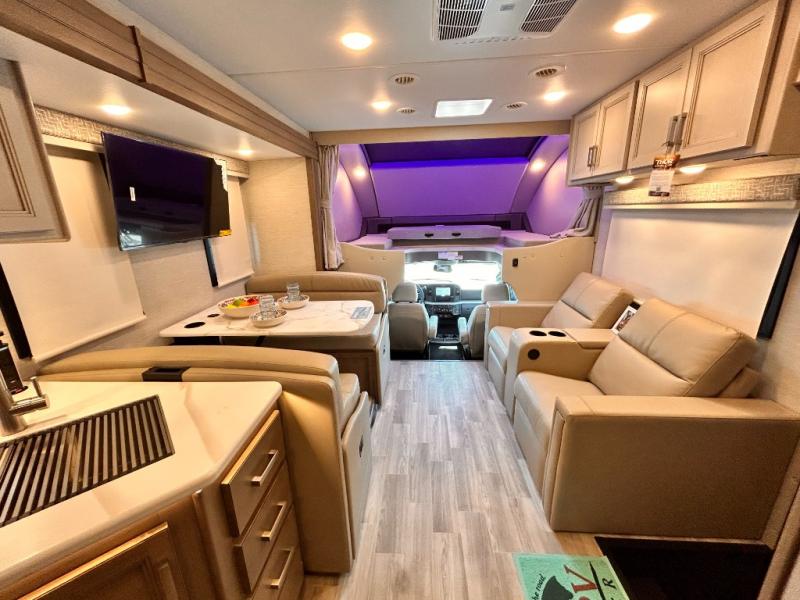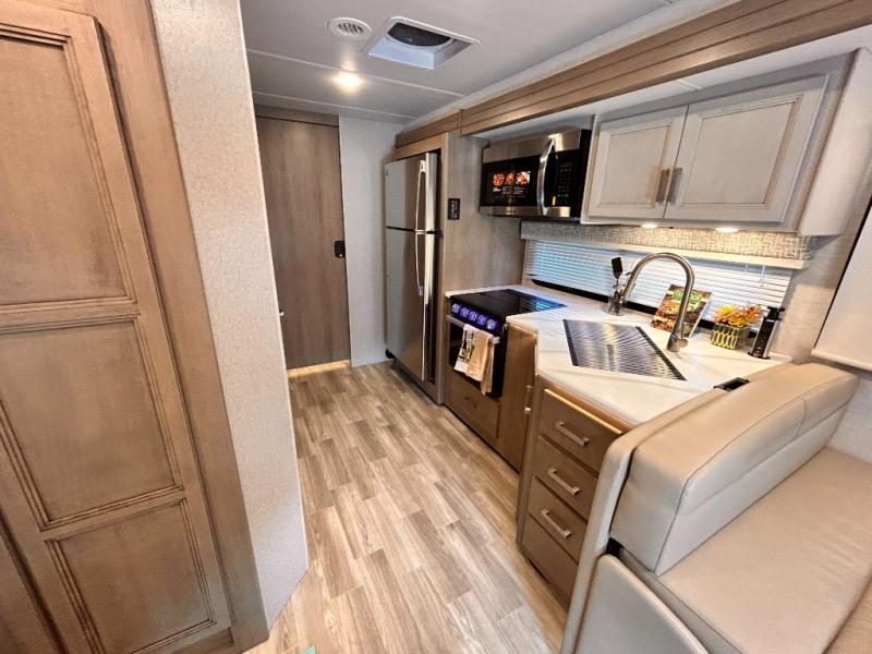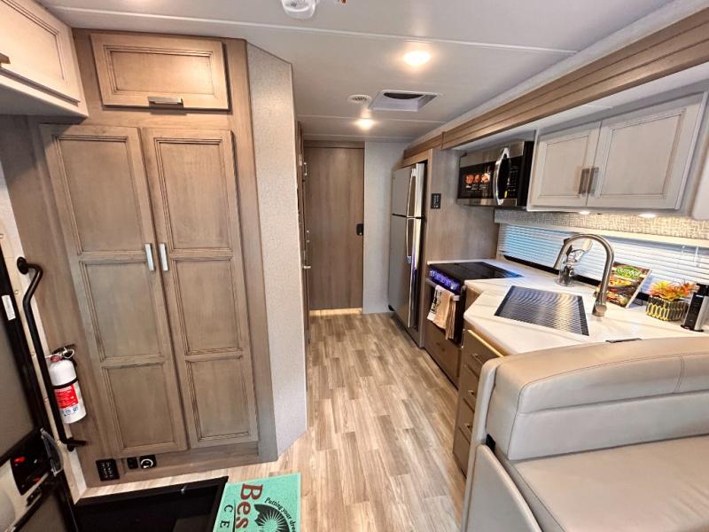 If you've been wanting to travel the country in style, now is the time with this motorhome that can sleep five people each night. The 40" living room Smart TV is directly across from the theater seating for easy viewing, plus there is a 32" bedroom Smart TV and an 32" exterior Smart TV for all your entertainment needs. The Dream Dinette will be the perfect place to enjoy breakfast each morning as you plan out your day, or you may just want to sit at the picnic table under the 14' power awning. This model includes a mid-ship full bath with a shower skylight that will not only provide more natural light, but will give you more head room as you wash up. The rear private bedroom will feel just like home with its 60" x 75" queen bed slide out, plus there is a wardrobe to keep your clothes tidy!