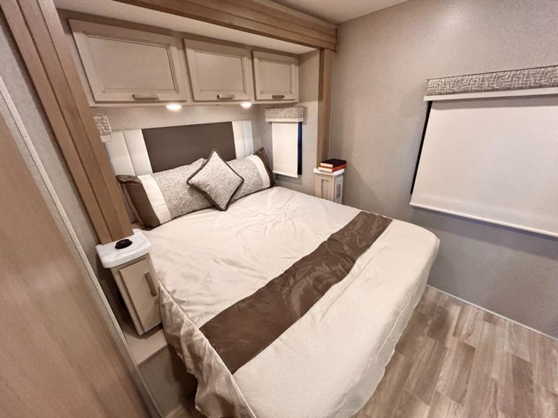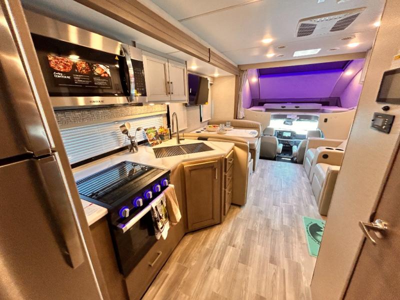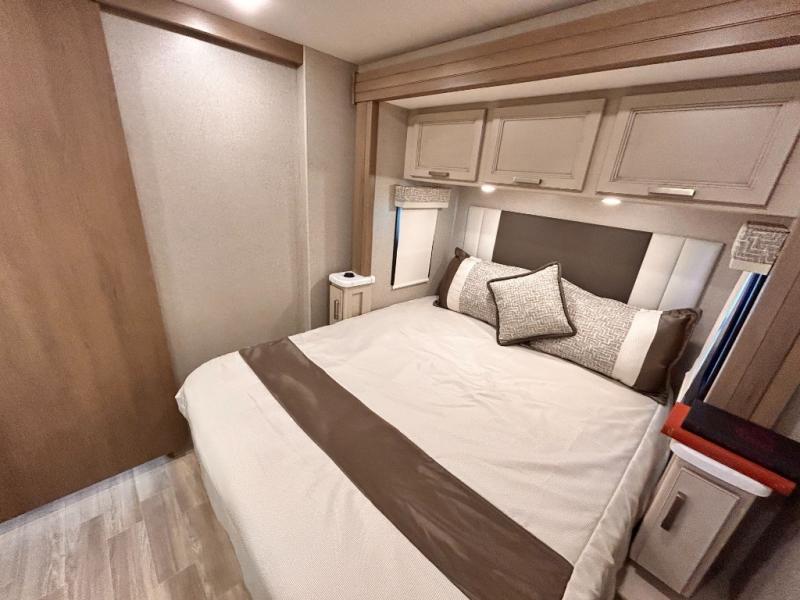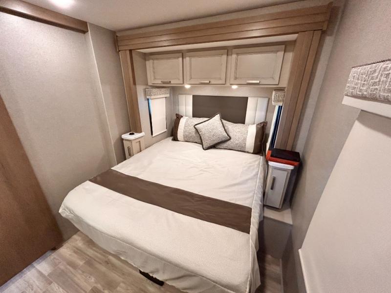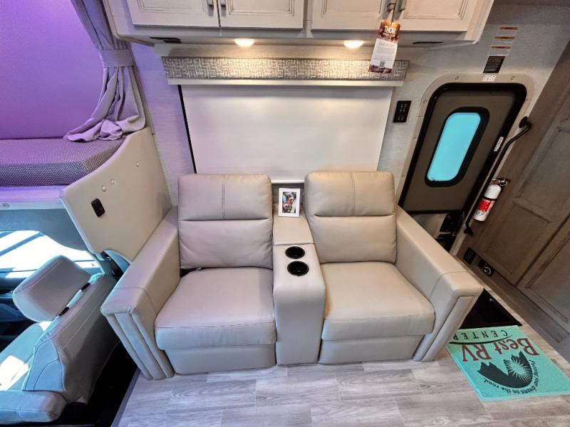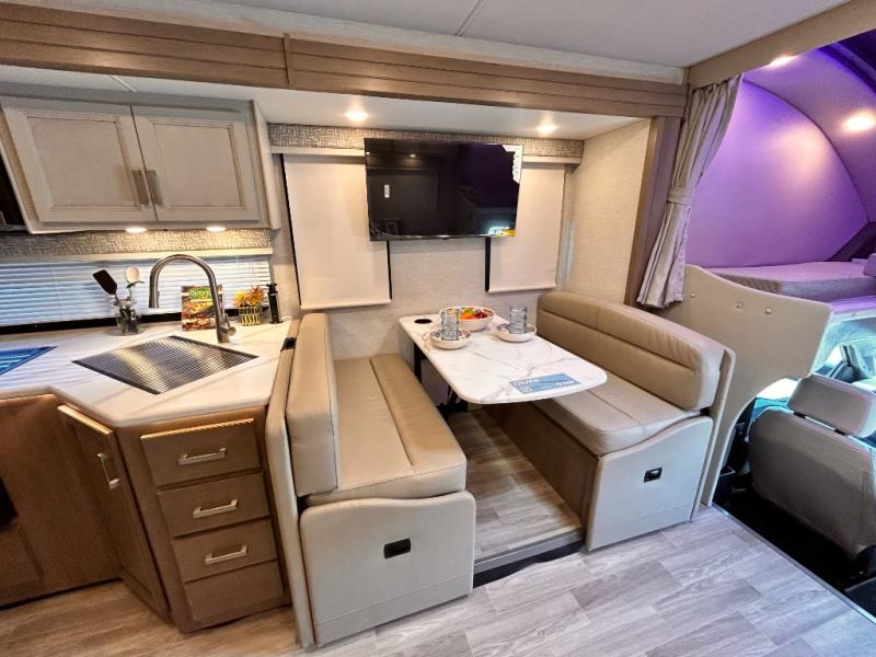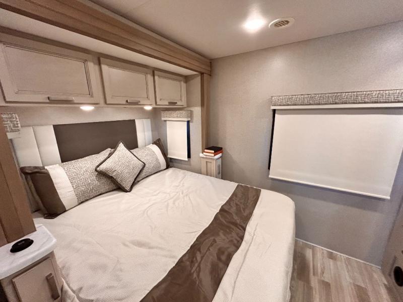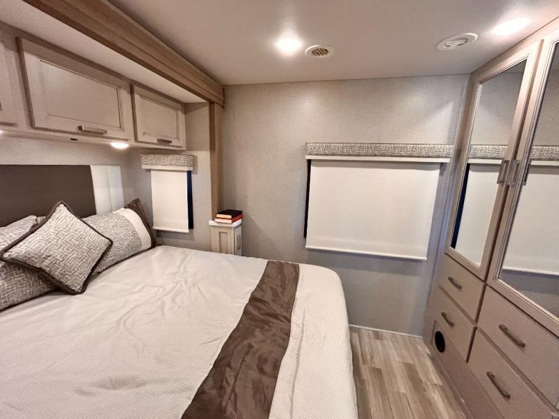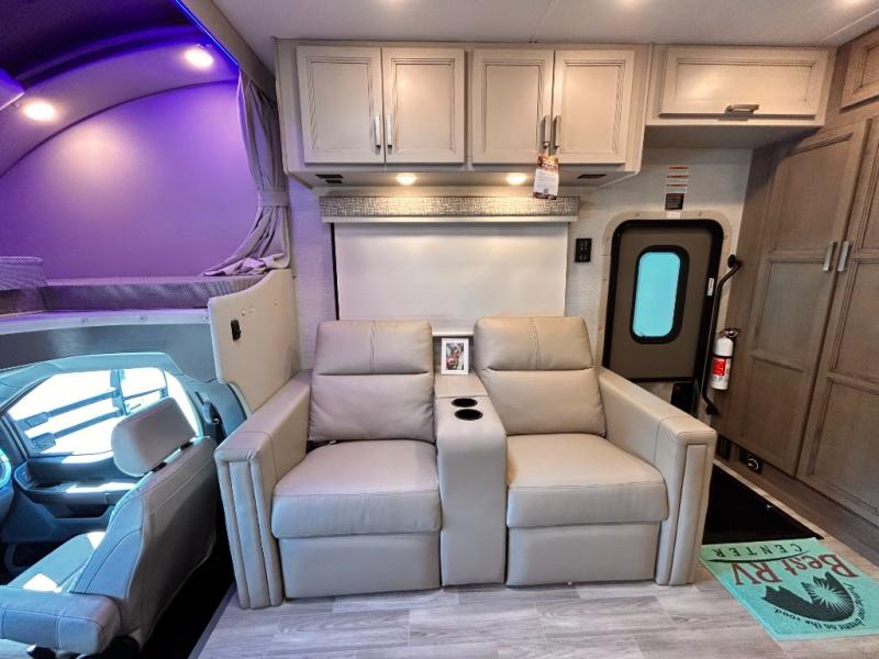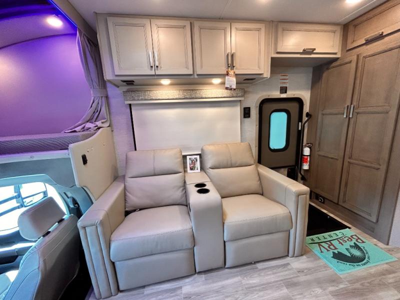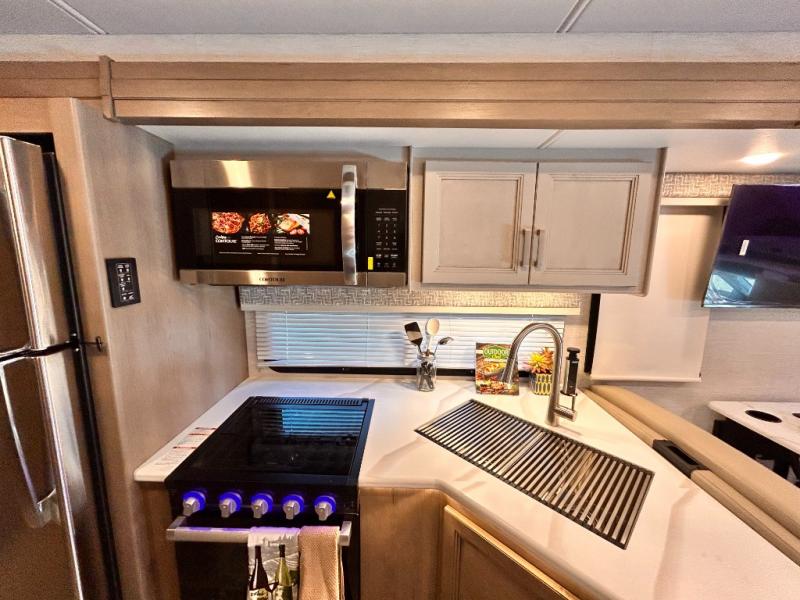 If you've been wanting to travel the country in style, now is the time with this motorhome that can sleep five people each night. The 40" living room Smart TV is directly across from the theater seating for easy viewing, plus there is a 32" bedroom Smart TV and an 32" exterior Smart TV for all your entertainment needs. The Dream Dinette will be the perfect place to enjoy breakfast each morning as you plan out your day, or you may just want to sit at the picnic table under the 14' power awning. This model includes a mid-ship full bath with a shower skylight that will not only provide more natural light, but will give you more head room as you wash up. The rear private bedroom will feel just like home with its 60" x 75" queen bed slide out, plus there is a wardrobe to keep your clothes tidy!