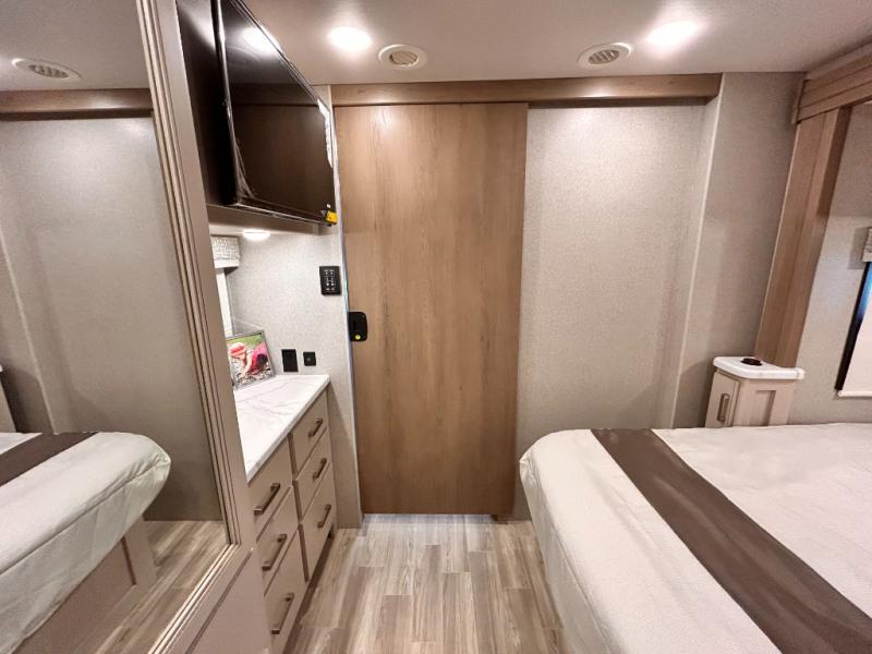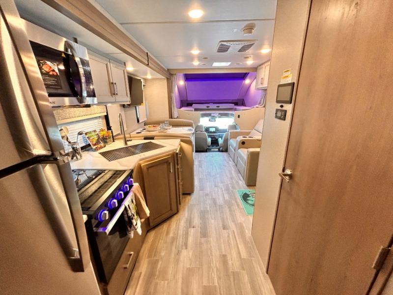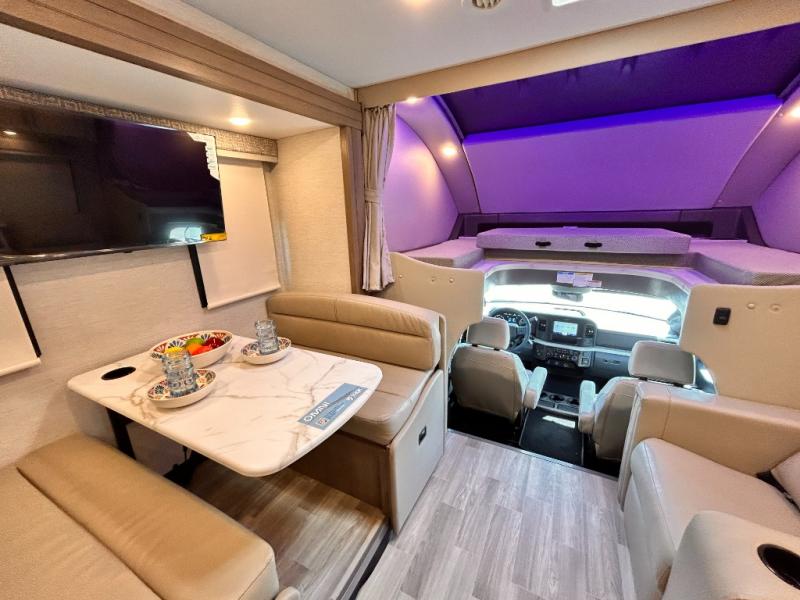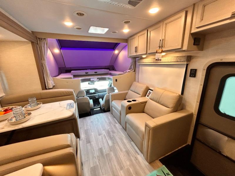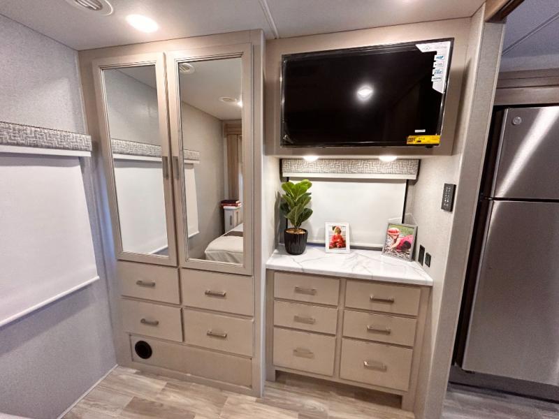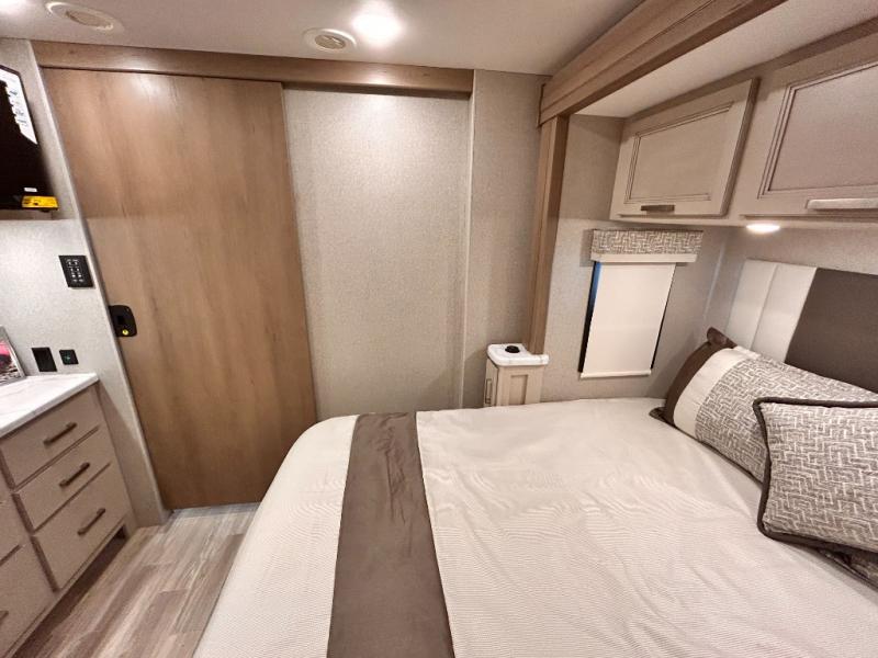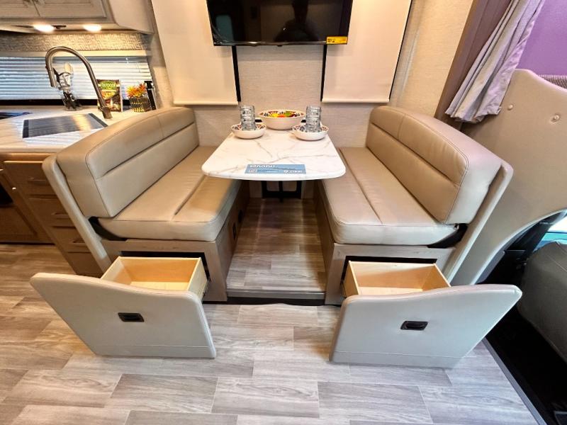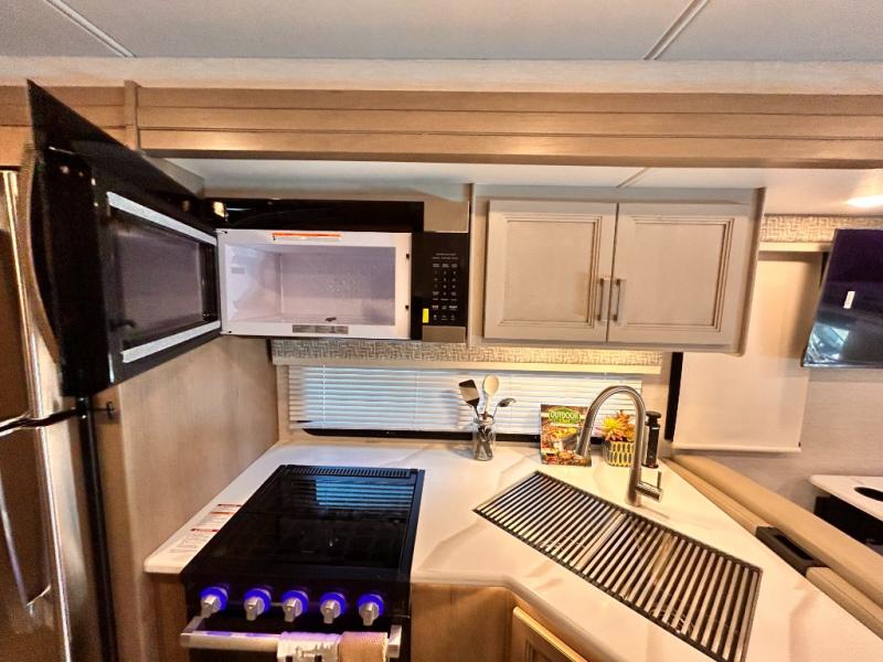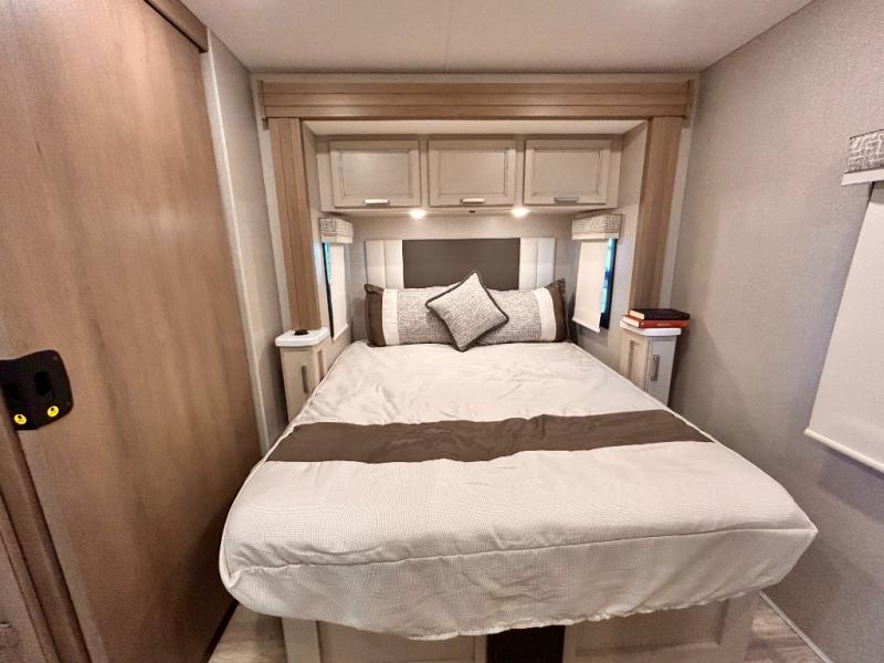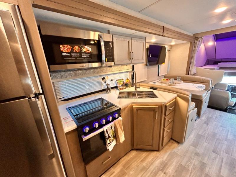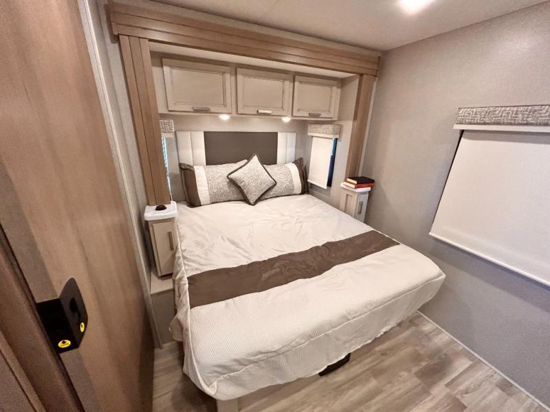 If you've been wanting to travel the country in style, now is the time with this motorhome that can sleep five people each night. The 40" living room Smart TV is directly across from the theater seating for easy viewing, plus there is a 32" bedroom Smart TV and an 32" exterior Smart TV for all your entertainment needs. The Dream Dinette will be the perfect place to enjoy breakfast each morning as you plan out your day, or you may just want to sit at the picnic table under the 14' power awning. This model includes a mid-ship full bath with a shower skylight that will not only provide more natural light, but will give you more head room as you wash up. The rear private bedroom will feel just like home with its 60" x 75" queen bed slide out, plus there is a wardrobe to keep your clothes tidy!