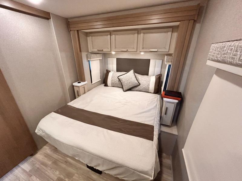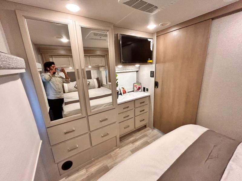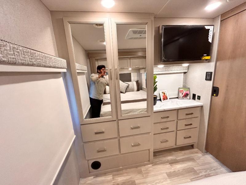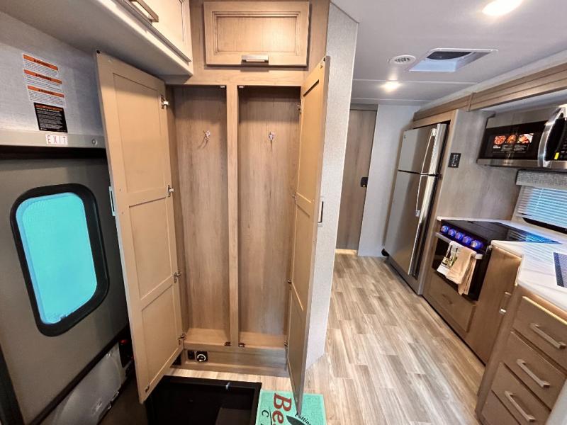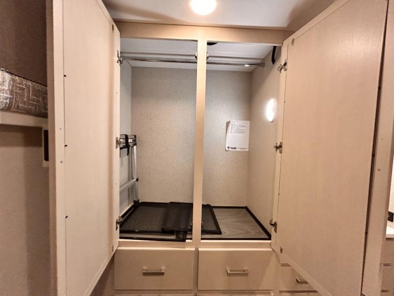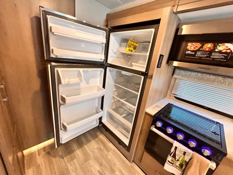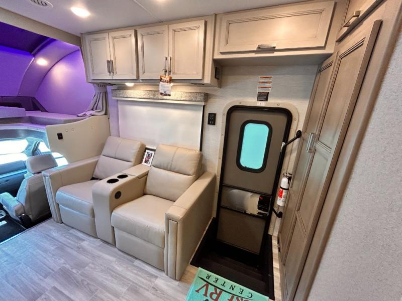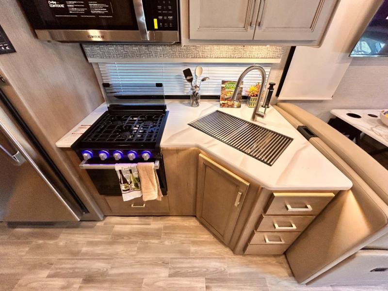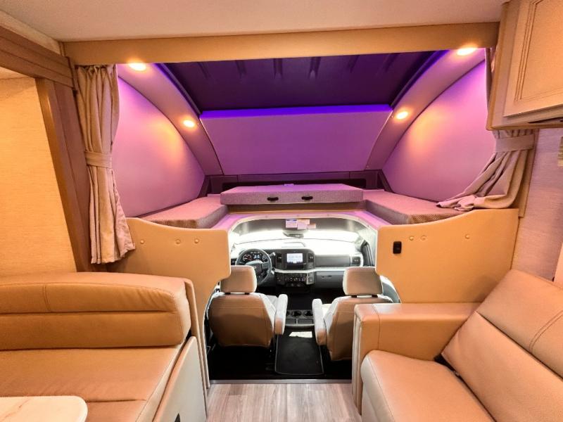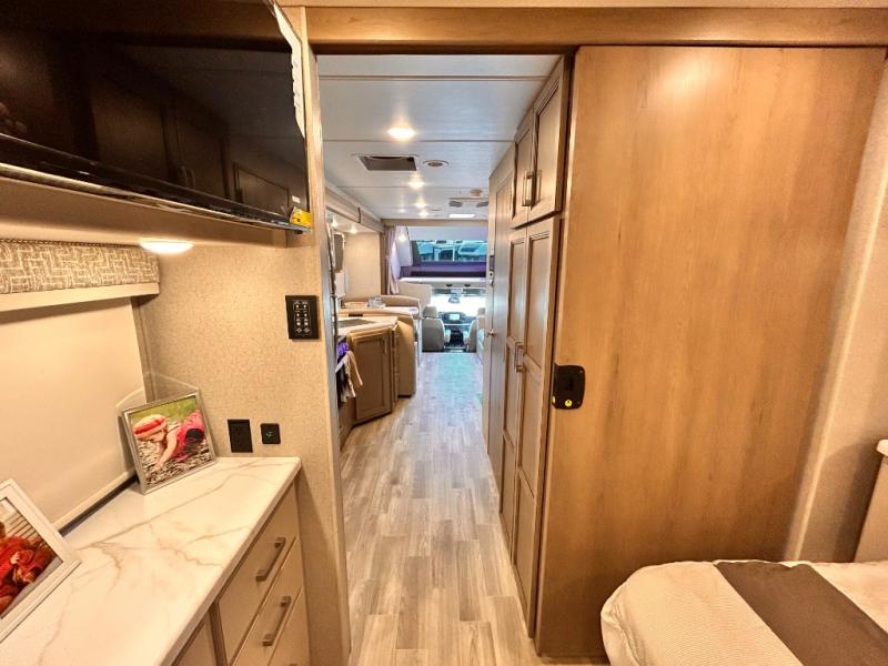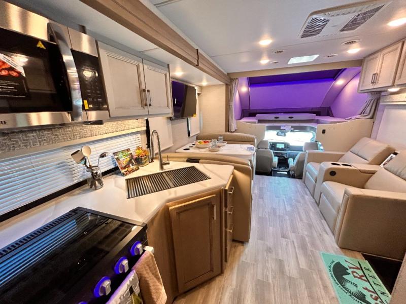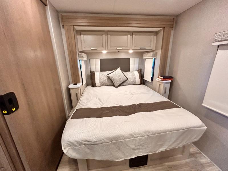 If you've been wanting to travel the country in style, now is the time with this motorhome that can sleep five people each night. The 40" living room Smart TV is directly across from the theater seating for easy viewing, plus there is a 32" bedroom Smart TV and an 32" exterior Smart TV for all your entertainment needs. The Dream Dinette will be the perfect place to enjoy breakfast each morning as you plan out your day, or you may just want to sit at the picnic table under the 14' power awning. This model includes a mid-ship full bath with a shower skylight that will not only provide more natural light, but will give you more head room as you wash up. The rear private bedroom will feel just like home with its 60" x 75" queen bed slide out, plus there is a wardrobe to keep your clothes tidy!