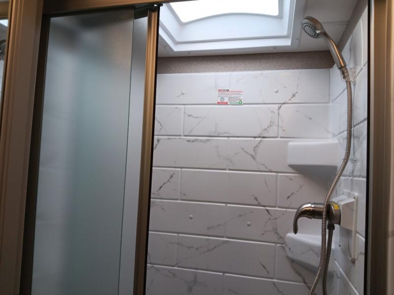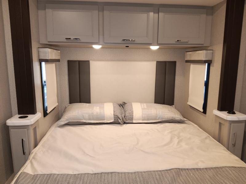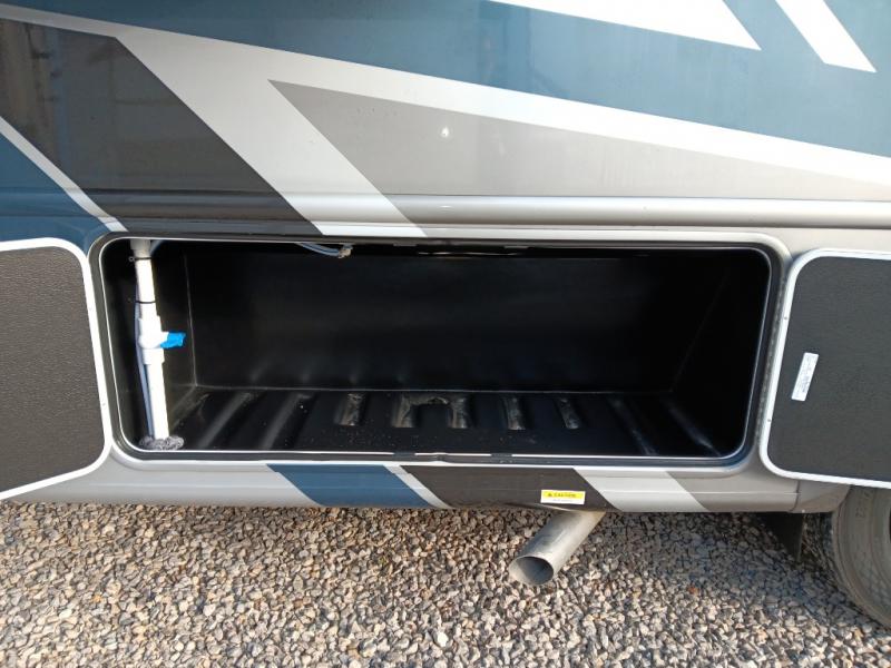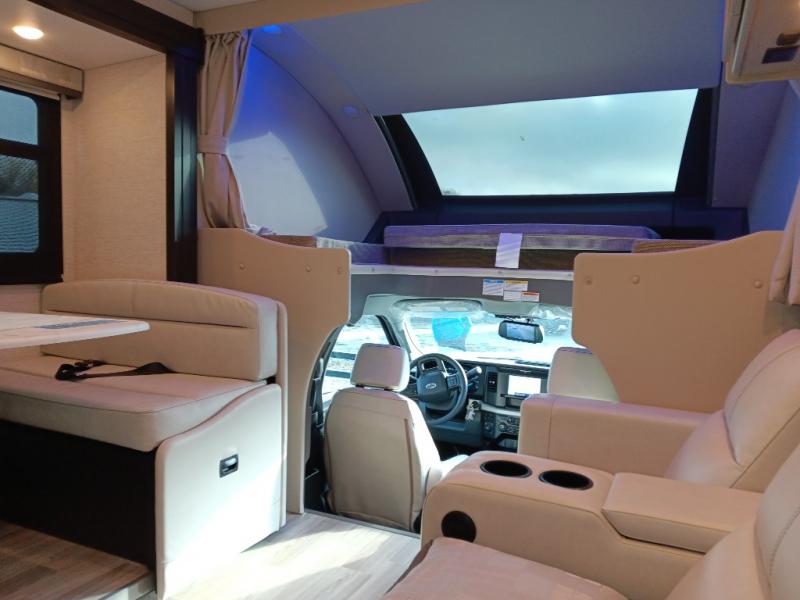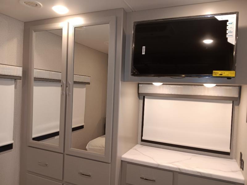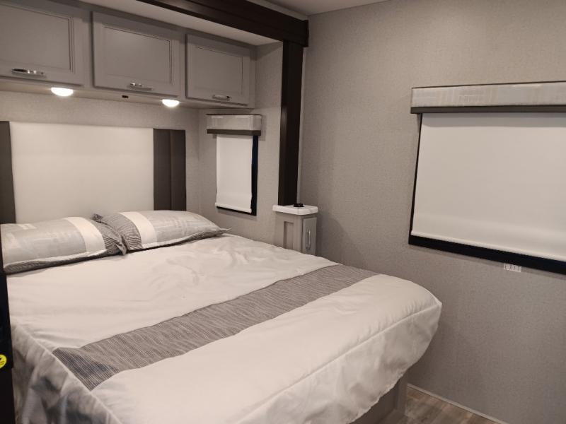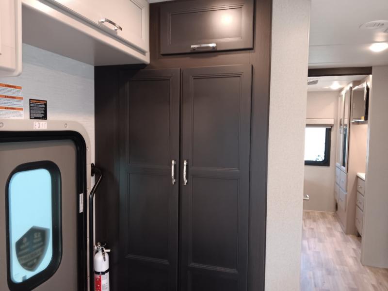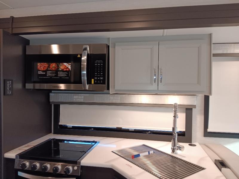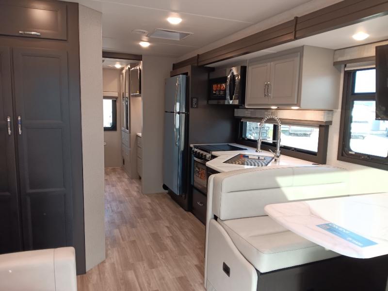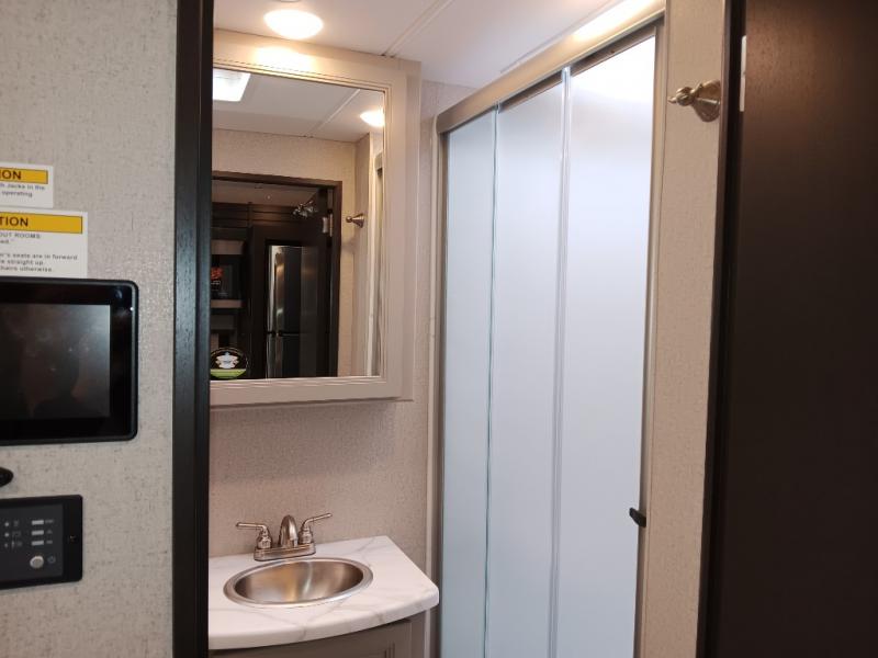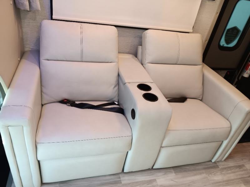 If you've been wanting to travel the country in style, now is the time with this motorhome that can sleep five people each night. The 40" living room Smart TV is directly across from the theater seating for easy viewing, plus there is a 32" bedroom Smart TV and an 32" exterior Smart TV for all your entertainment needs. The Dream Dinette will be the perfect place to enjoy breakfast each morning as you plan out your day, or you may just want to sit at the picnic table under the 14' power awning. This model includes a mid-ship full bath with a shower skylight that will not only provide more natural light, but will give you more head room as you wash up. The rear private bedroom will feel just like home with its 60" x 75" queen bed slide out, plus there is a wardrobe to keep your clothes tidy!
