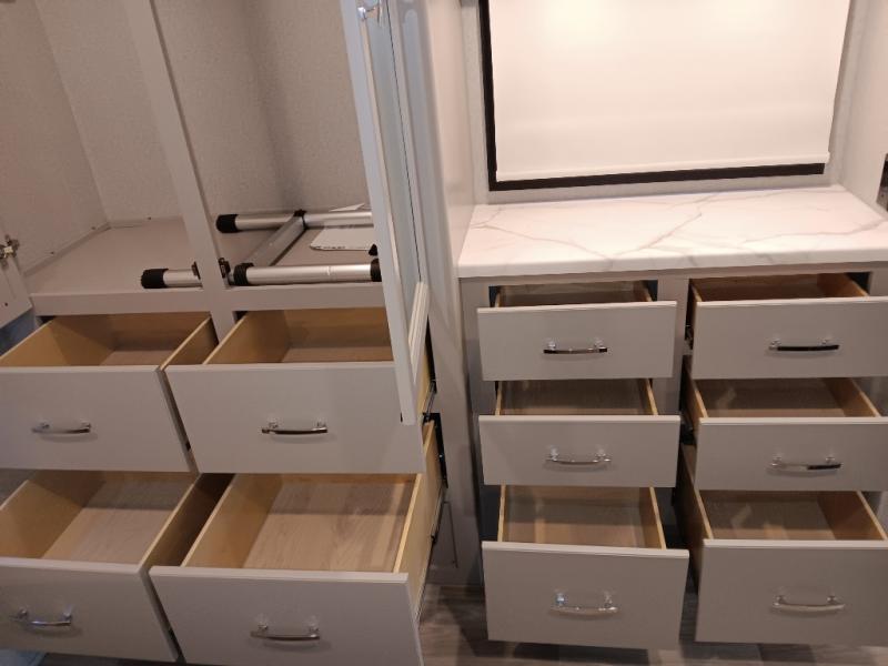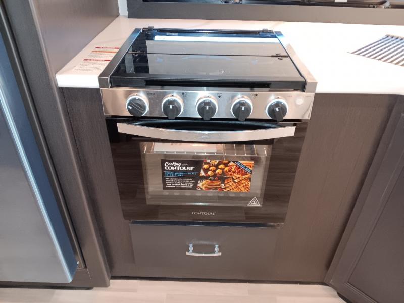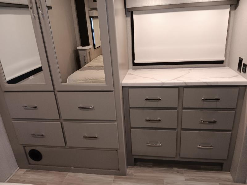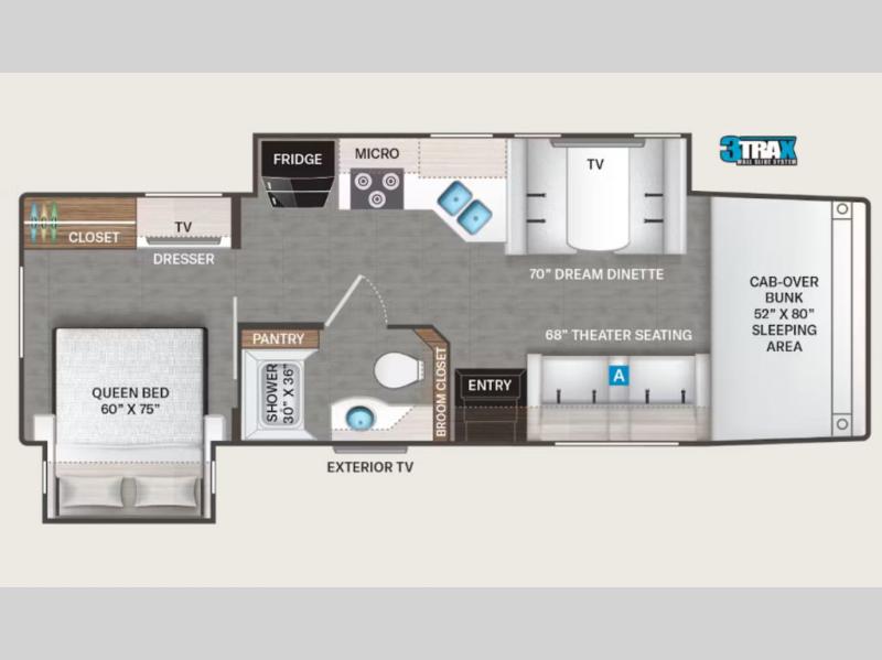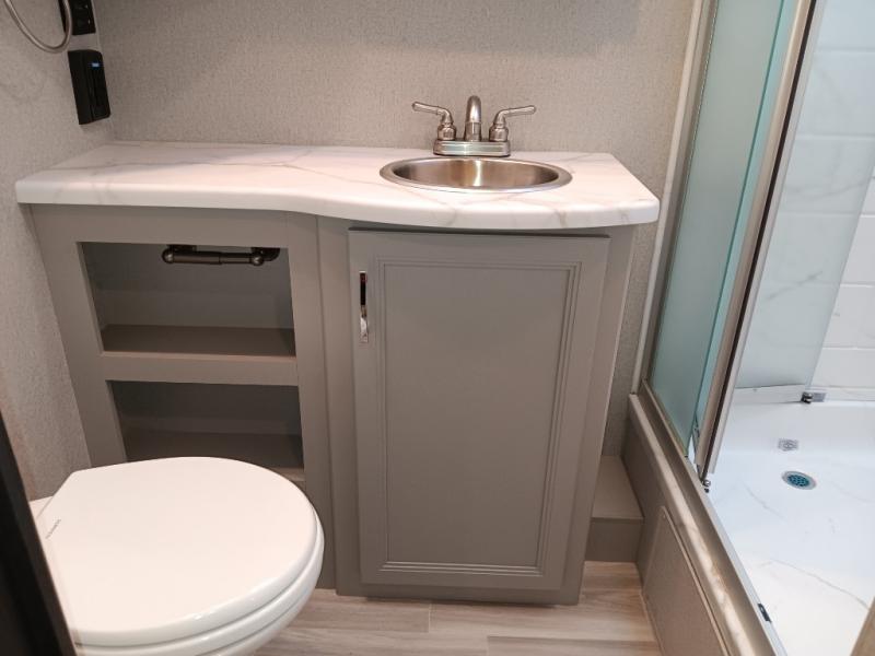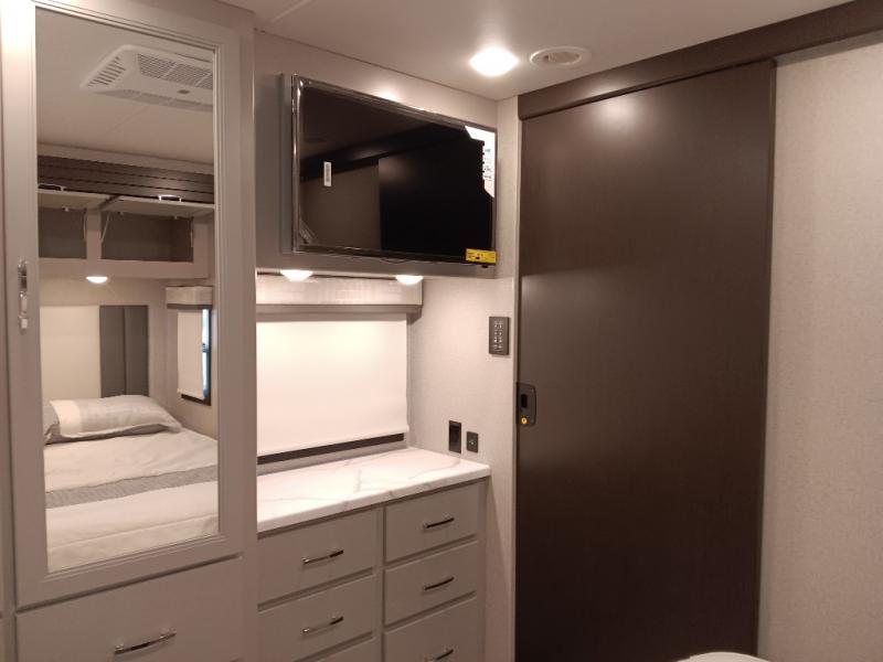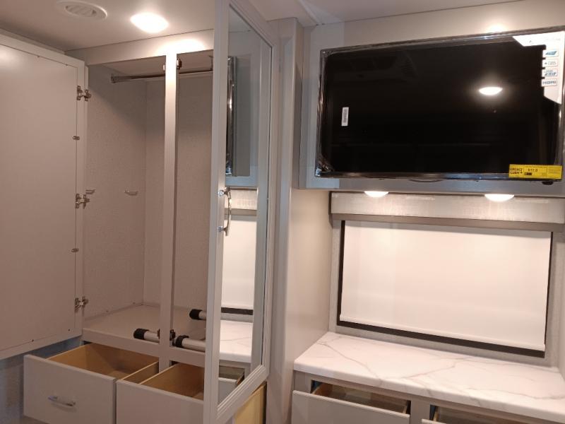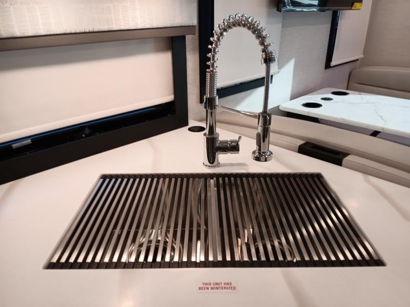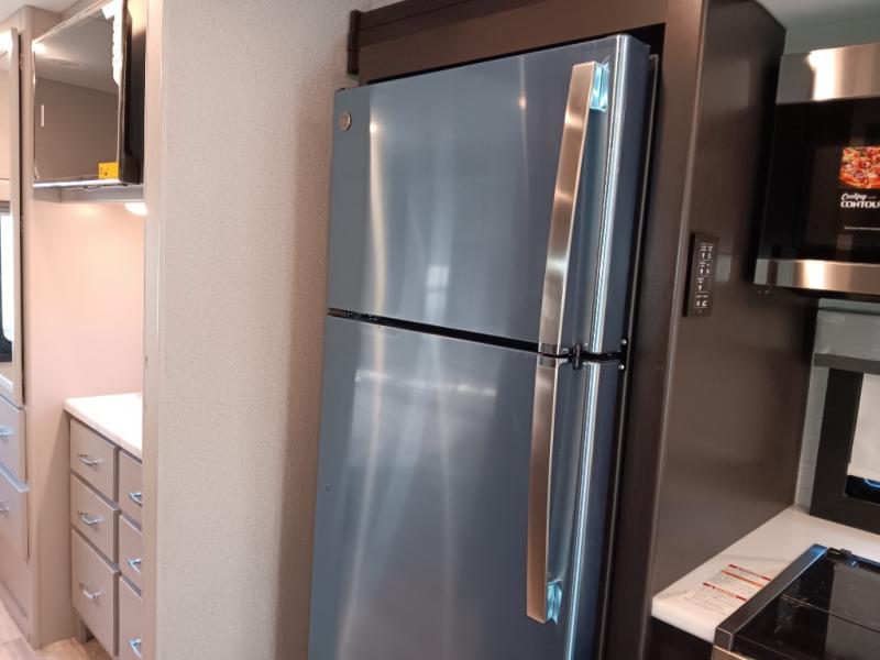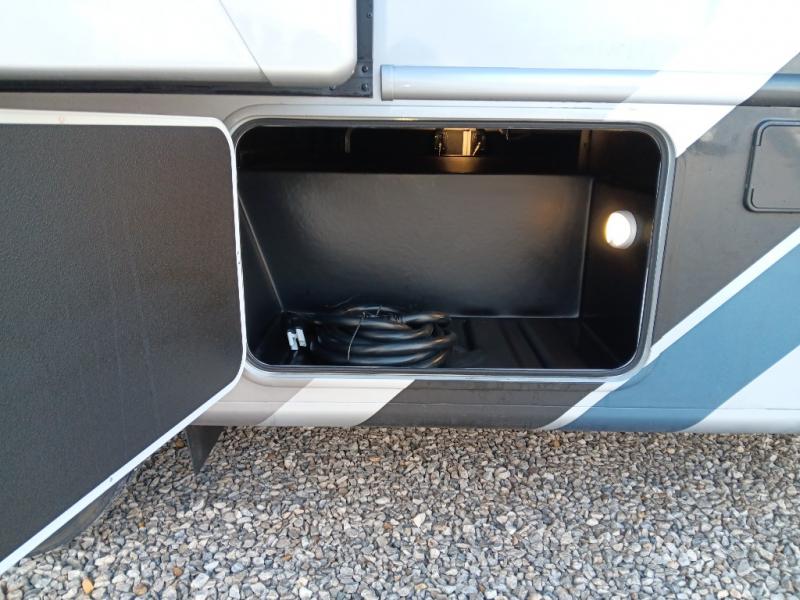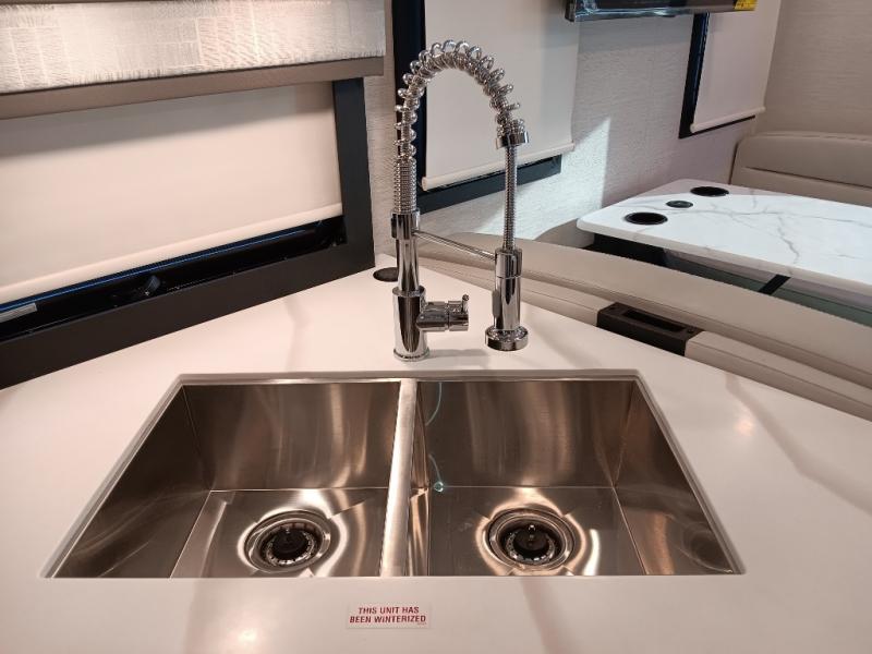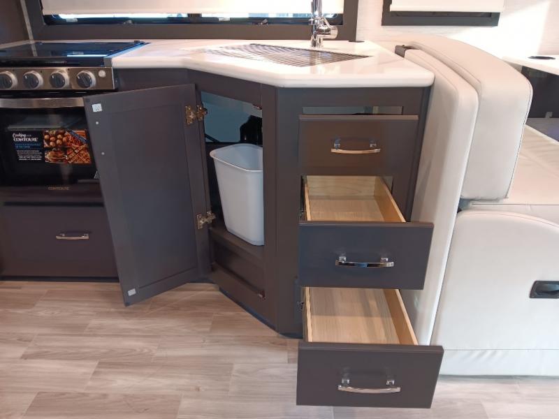 If you've been wanting to travel the country in style, now is the time with this motorhome that can sleep five people each night. The 40" living room Smart TV is directly across from the theater seating for easy viewing, plus there is a 32" bedroom Smart TV and an 32" exterior Smart TV for all your entertainment needs. The Dream Dinette will be the perfect place to enjoy breakfast each morning as you plan out your day, or you may just want to sit at the picnic table under the 14' power awning. This model includes a mid-ship full bath with a shower skylight that will not only provide more natural light, but will give you more head room as you wash up. The rear private bedroom will feel just like home with its 60" x 75" queen bed slide out, plus there is a wardrobe to keep your clothes tidy!