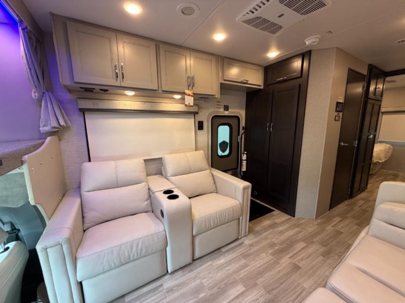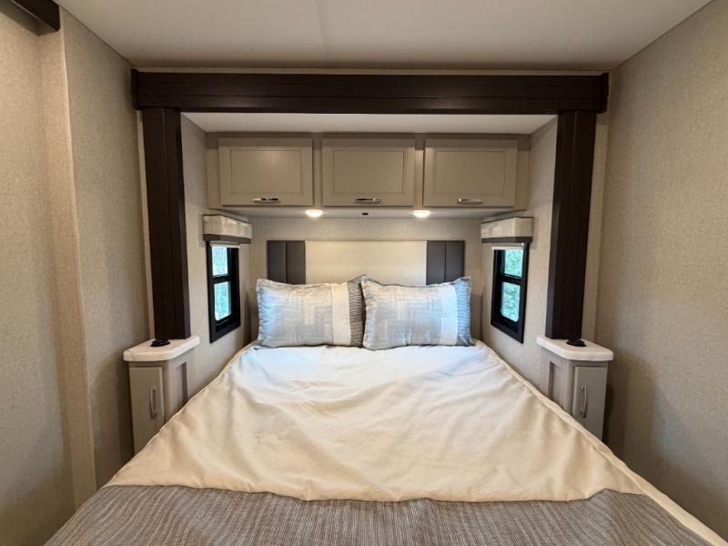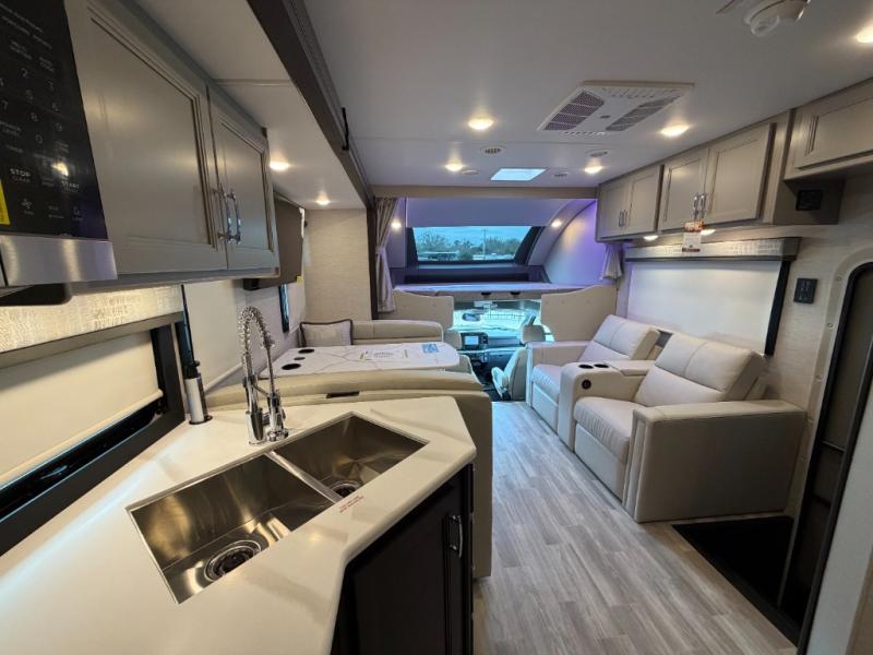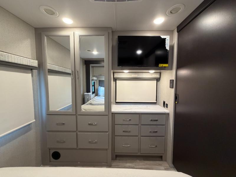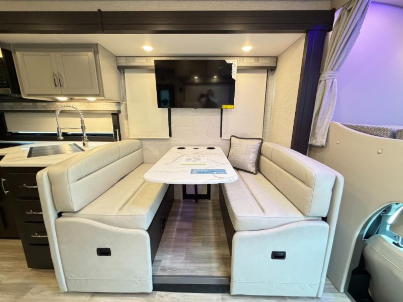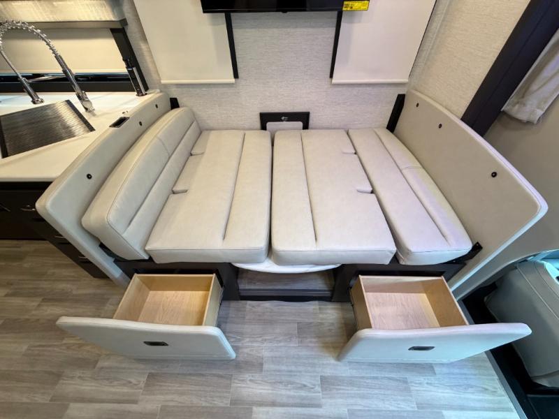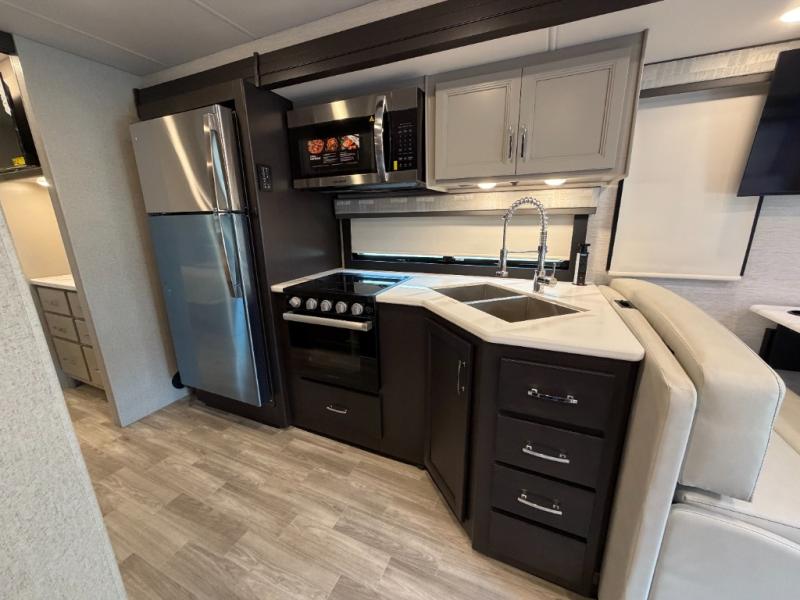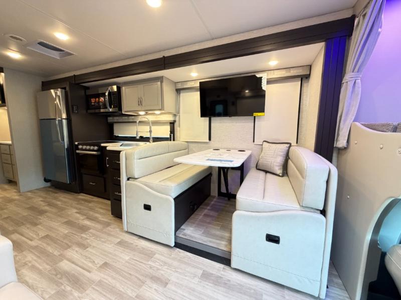 If you've been wanting to travel the country in style, now is the time with this motorhome that can sleep five people each night. The 40" living room Smart TV is directly across from the theater seating for easy viewing, plus there is a 32" bedroom Smart TV and an 32" exterior Smart TV for all your entertainment needs. The Dream Dinette will be the perfect place to enjoy breakfast each morning as you plan out your day, or you may just want to sit at the picnic table under the 14' power awning. This model includes a mid-ship full bath with a shower skylight that will not only provide more natural light, but will give you more head room as you wash up. The rear private bedroom will feel just like home with its 60" x 75" queen bed slide out, plus there is a wardrobe to keep your clothes tidy!
