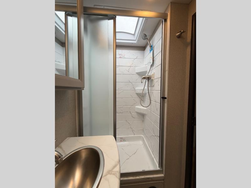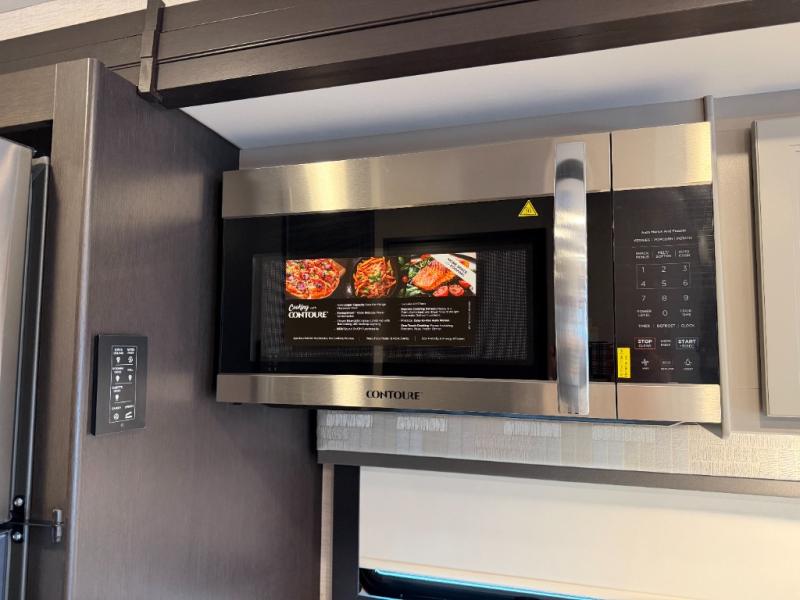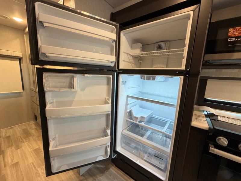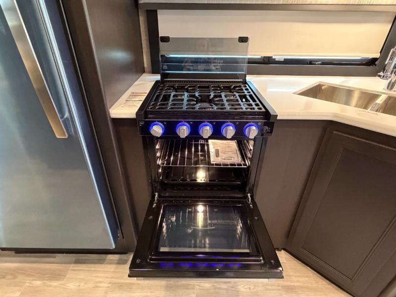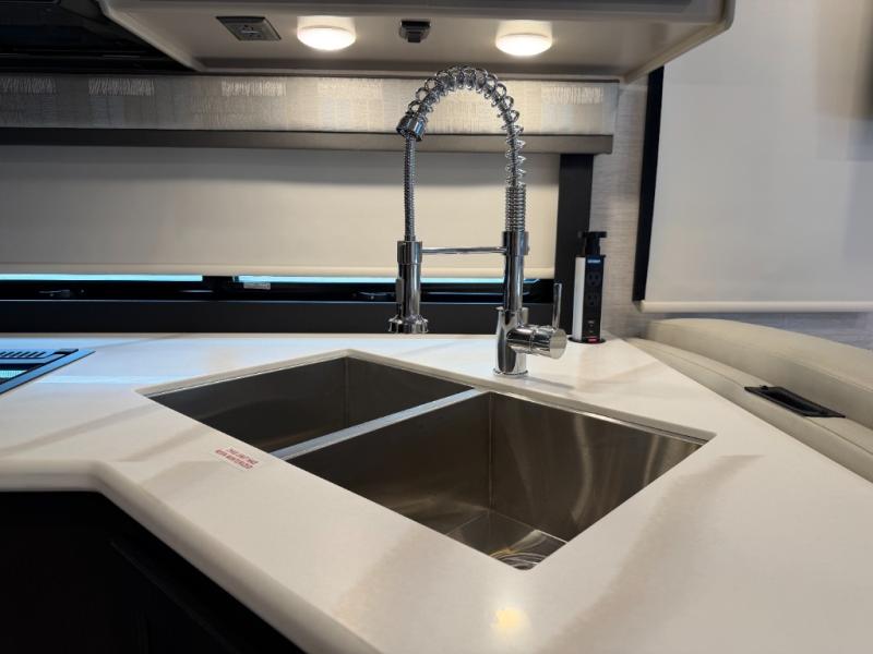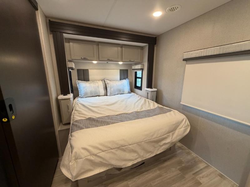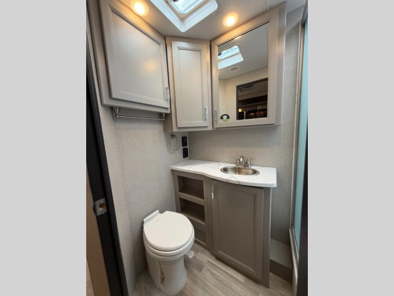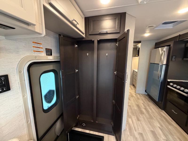 If you've been wanting to travel the country in style, now is the time with this motorhome that can sleep five people each night. The 40" living room Smart TV is directly across from the theater seating for easy viewing, plus there is a 32" bedroom Smart TV and an 32" exterior Smart TV for all your entertainment needs. The Dream Dinette will be the perfect place to enjoy breakfast each morning as you plan out your day, or you may just want to sit at the picnic table under the 14' power awning. This model includes a mid-ship full bath with a shower skylight that will not only provide more natural light, but will give you more head room as you wash up. The rear private bedroom will feel just like home with its 60" x 75" queen bed slide out, plus there is a wardrobe to keep your clothes tidy!