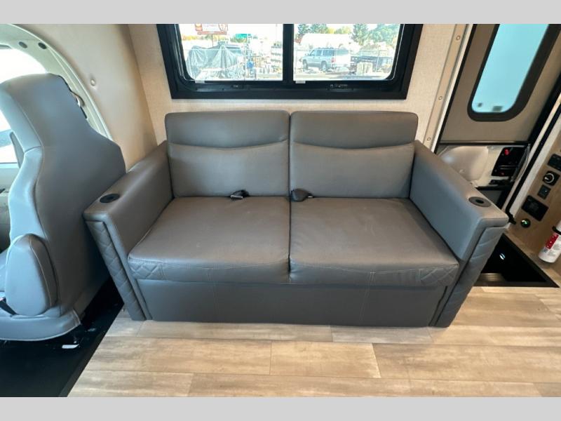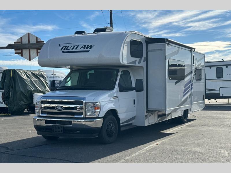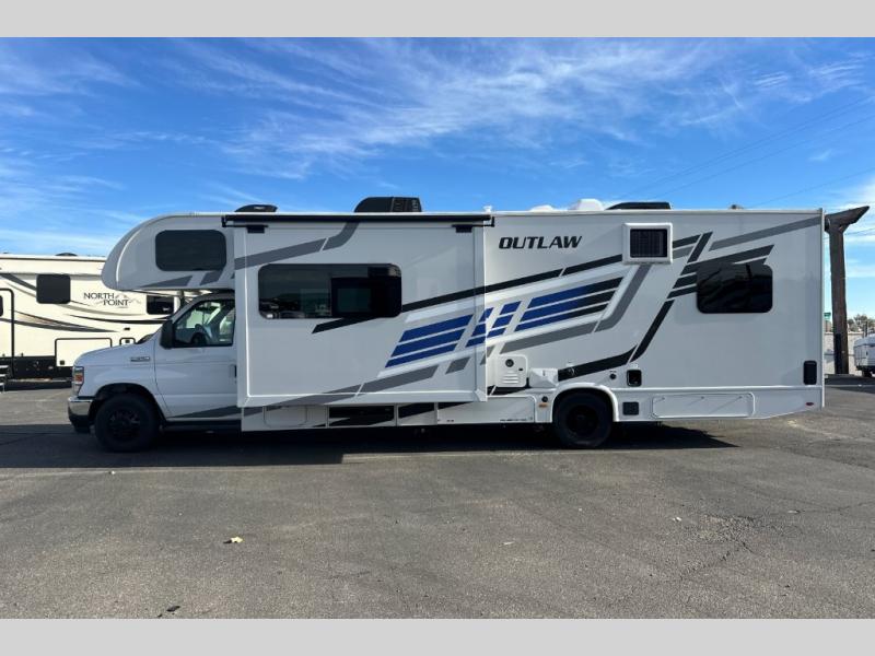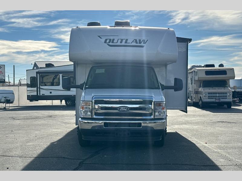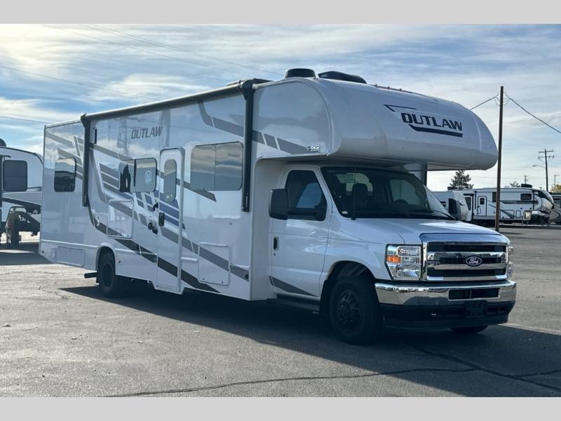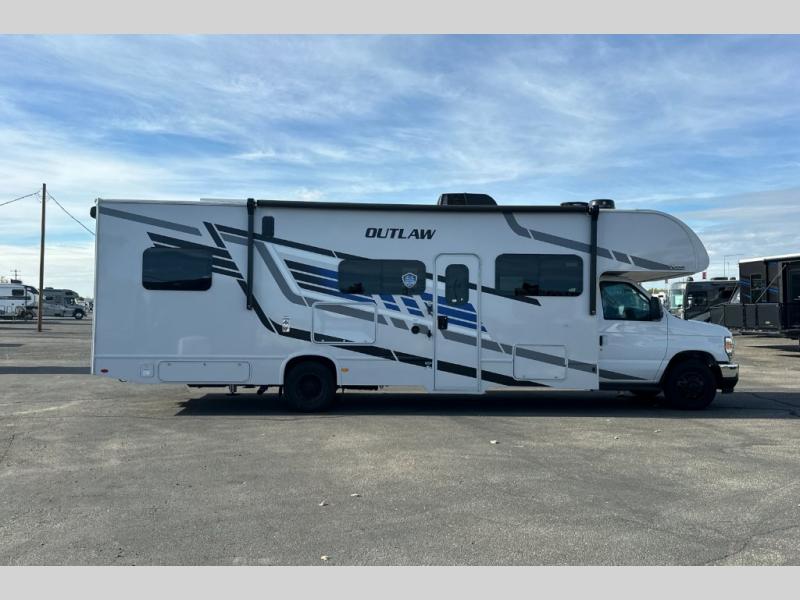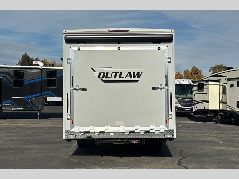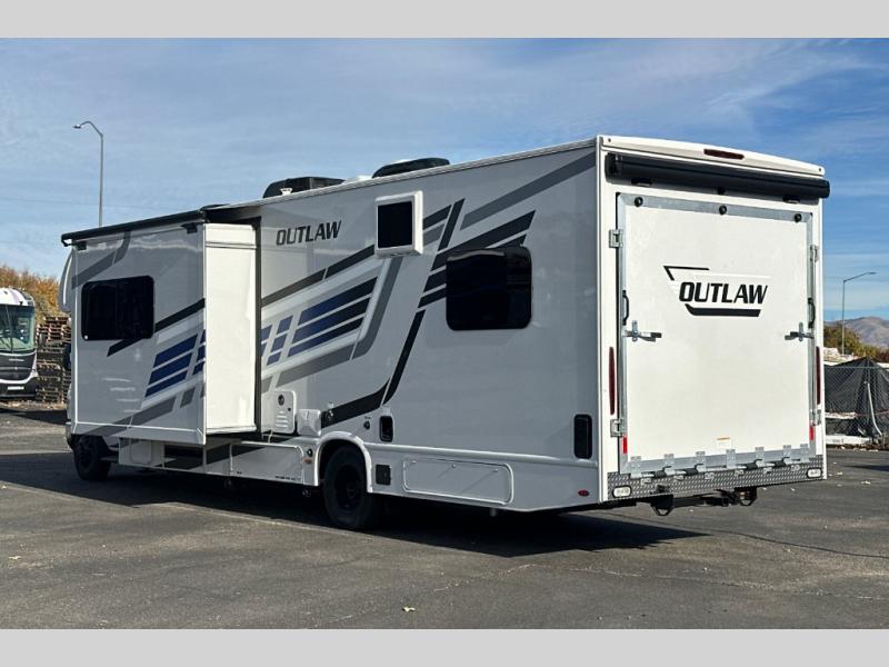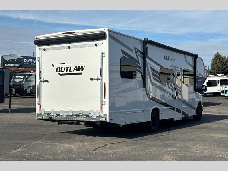 The Outlaw Class C gas motorhome toy hauler starts with the durable Ford E-Series chassis with a powerful 7.3L V8 engine that will allow you to adventure on! The 8,000 lb. hitch will be perfect for your car or motorcycle trailer, and the 10" touchscreen with a back-up monitor will let you maneuver the campground like a pro. This coach includes a Winegard ConnecT 2.0 WiFi/4G/TV antenna for all your connection needs, or you may want to unplug for a while with the 100-watt solar charging system with a power controller. The one-piece fiberglass front cap and sterling fiberglass exterior with a new graphics package is sure to be eye-catching, and automatic leveling jacks come standard for easy set-up. Head inside to find pressed laminate countertops throughout, leatherette furniture, residential vinyl flooring, plus many more comforts you won't want to travel without!