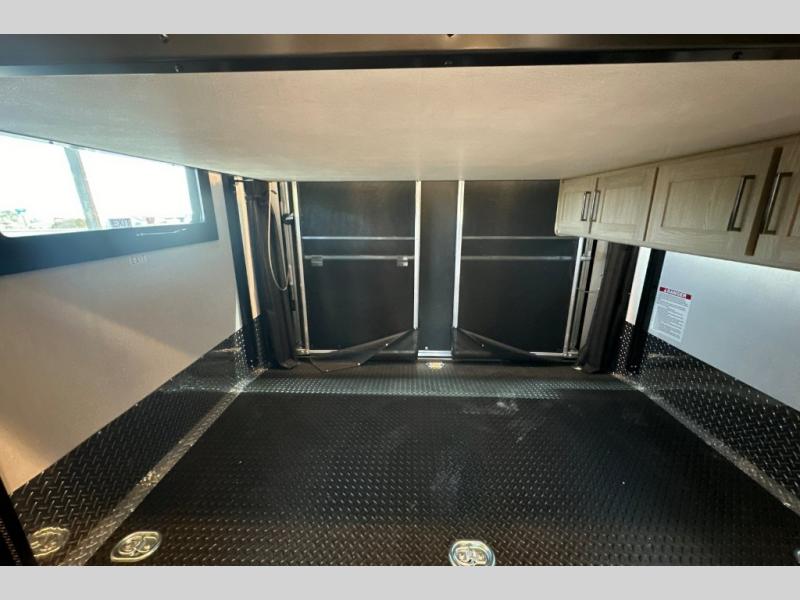 Enjoy the best of both worlds in this toy hauler; trail-riding fun during the day, and comfort at night! Your crew can make themselves at home on the two jack-knife sofas, or on the swivel captain's seats. You'll find a TV on swivel in the cab-over bunk sleeping area. After you've unloaded your toys from the 8' x 8' garage, you can enjoy the patio deck with a cold drink in hand. There is a convenient garage 32" TV here, plus a queen-size drop-down bunk for comfortable sleeping space. This coach also includes an exterior 32" TV, a 16' power awning with LED lights, plus lighted rotocast storage compartments for all your riding gear!
